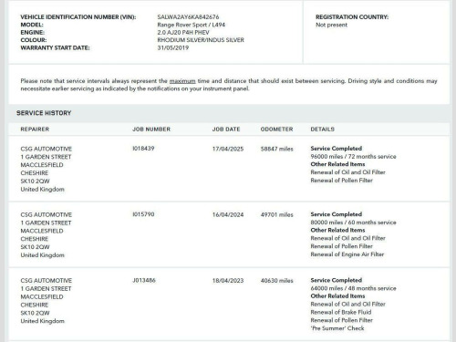 Warford Cars are proud to present this Range Rover Sport Autobiography P400e in Rhodium Silver with Black Leather Interior. The car is optioned with 21-Inch Gloss Black Wheel with Red Calipers, Centre Fridge Compartment, Four-Zone Climate Control and Privacy Glass. Key features on the car include Apple CarPlay / Android Auto, Heated & Cooled Electric Memory Front Seats, Heated Rear Seats, Meridian Sound System, Power Opening Tailgate, Front & Rear Parking Sensors with Reversing Camera, Deployable Side Steps, Sliding Glass Sunroof with Powered Blind, Cruise Control, Heated Front & Rear Windscreens, Heated Steering Wheel, Keyless Entry & Go and Power Folding Wing Mirrors. The car comes with a Full Service History having been done 09/07/2020 at 11,123 miles, 15/07/2021 at 21,129 miles, 22/04/2022 at 30,716 miles, 18/04/2023 at 40,630 miles, 16/04/2024 at 49,701 miles and 17/04/2025 at 58,847 miles (pictured). Viewings Strictly by Appointment Only. Competitive Finance Options Available. Extended Warranty Available. Professional GTechniq Accredited Detailing Available. Call directly to arrange a viewing on 07537 165874