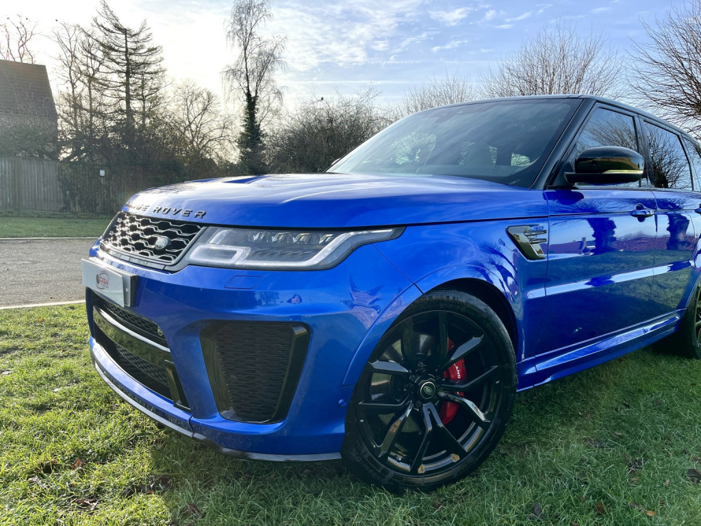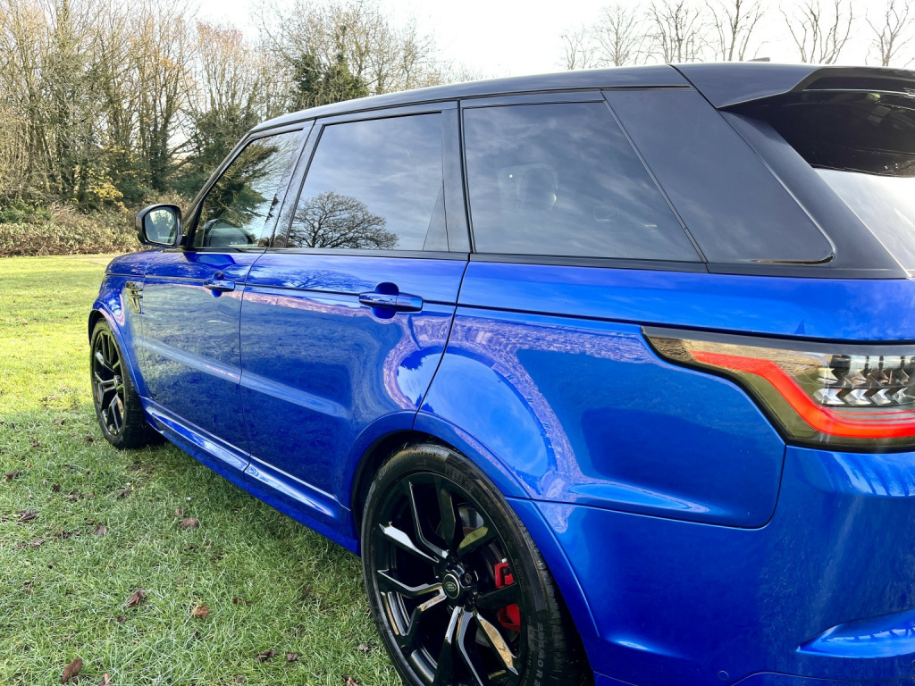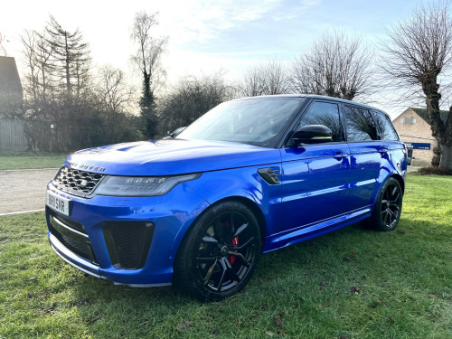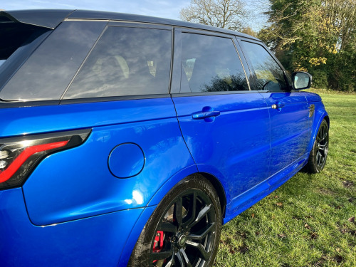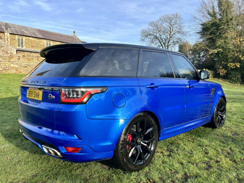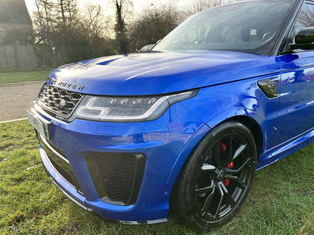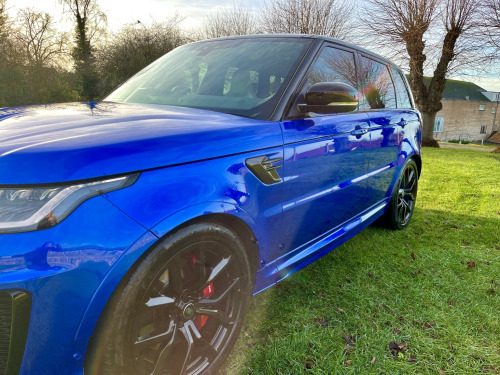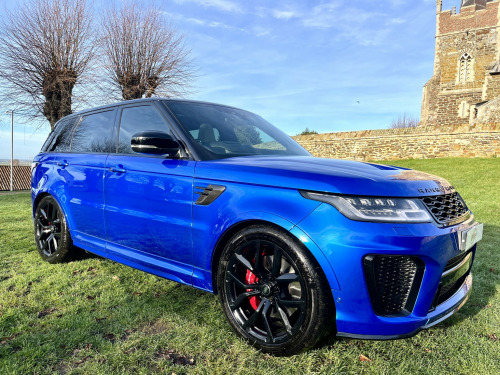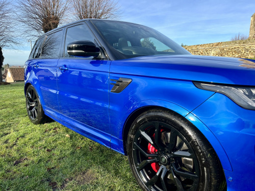 Stunning Range Rover Sport SVR in SVO Premium Pallette blue with two tone leather interior, this car is in immaculate condition inside and out, genuine low miles with a full Landrover Service history, has been meticulously maintained being serviced at 26/09/2025, 23/08/2024, 30/08/2023, 03/08/2022, 16/09/2021, 10/10/2020, 08/06/2019,, 25303 miles, 21924 miles, 18778 miles, 15467 miles, 11219 miles and at 6042 miles with all service receipts present, all previous health checks here and always been green, had all items serviced at Maindealer, 2 keys, top spec model with panoramic opening sunroof, heads up display, carbon fibre interior and exterior, sat nav, 360 parking aid, 360 cameras, heated and cooled seats, reverse camera, carbon bonnet, two tone leather, heated steering wheel, memory heated seats and much more, cherished example with no damage, scratches or scuffs on the paint work or wheels, only 2 former keepers on the v5, looks, sounds and drives perfect, comes with private SVR number plate, immaculate inside and out, would confidently say this is the best and cleanest example out there, has to be seen