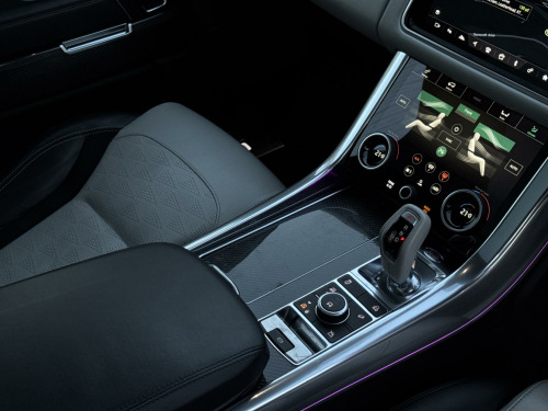This specification is one of the strongest we have seen on a P575 SVR. Alongside the comprehensive standard equipment list, this vehicle carries factory options totalling £28,490. The SVR Carbon Fibre Exterior Pack with exposed carbon bonnet transforms the presence of the car and is paired with 22 inch 5083 alloys in gloss black, privacy glass, gloss finish paint and Pixel-laser LED headlights. The Sliding Panoramic Roof with powered blind, Suedecloth headlining and Perforated Windsor leather in Ebony and Cirrus create a high-end cabin environment. The Extended Carbon Fibre interior trim continues the theme inside.