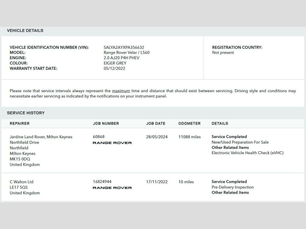 Warford Cars are proud to present this Land Rover Range Rover Velar P400e R-Dynamic SE Petrol Plug-In Hybrid finished in Eiger Grey with Black Leather Interior. The car is optioned from new with Fixed Panoramic Roof with Powered Blind, 20-Inch Satin Grey Wheels, Heated Steering Wheel, Full Leather Upgraded Interior and Privacy Glass. Key features on the car include Apple CarPlay / Android Auto, Heated Electric Memory Front Seats, Meridian Sound System, Cruise Control, Dual Zone Climate Control, Power Opening Tailgate, Front & Rear Parking Sensors with Reversing Camera, Keyless Entry & Start, Heated Front & Rear Windscreens and Power Folding Wing Mirrors. The car  comes serviced 28/05/2024 at 11,088 miles (pictured) at Land Rover then again 11/06/2025 at 18,342 miles including Spark Plugs independently with invoice supplied and the car also has Land Rover Manufacturer Warranty until December 2025. Competitive Finance Options Available. Warranty Available. Professional GTechniq Accredited Detailing Available.