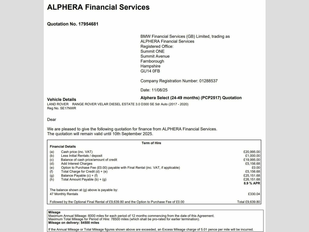Warford Cars are proud to present this Land Rover Range Rover Velar 3.0 SD6 V6 SE finished in Kaikoura Stone. Key features include Meridian Surround Sound System, Apple CarPlay / Android Auto, Front & Rear Parking Sensors with Reversing Camera, Cruise Control, Heated Electric Memory Front Seats, Dual Zone Climate Control, Heated Front & Rear Windscreens, Power Opening Tailgate, Power Folding Wing Mirrors and 20-Inch Alloy Wheels. The car has been well looked after services on: 11/07/2018 at 4834 miles, 09/07/2019 at 14829 miles, 08/07/2020 at 19004 miles, 17/06/2021 at 21783 miles, 07/07/2022 at 30021 miles & 22/01/2025 at 50441 miles. The car has also had the timing belt and fuel pump changed 04/06/2025, air suspension compressor changed 24/06/2025 and new ad blue tank with an air con regas 30/07/2025 with invoices provided for all works. The car comes complete with 2 keys from new. Viewings by appointment. Competitive Finance Options Available. Warranty Available. Professional GTechniq Accredited Detailing Available.