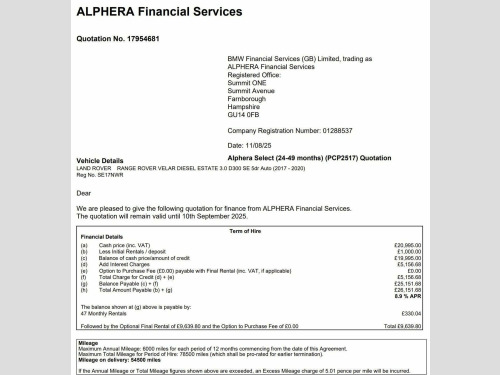 This 2017 Land Rover Range Rover Velar 3.0 SD6 V6 SE Auto 4WD Euro 6 (s/s) 5dr SUV is currently available for £19,995 in Wilmslow Cheshire with Diesel engine and Auto Clutch Manual gearbox. For more information or to arrange a viewing, click here to send us an email using form below.