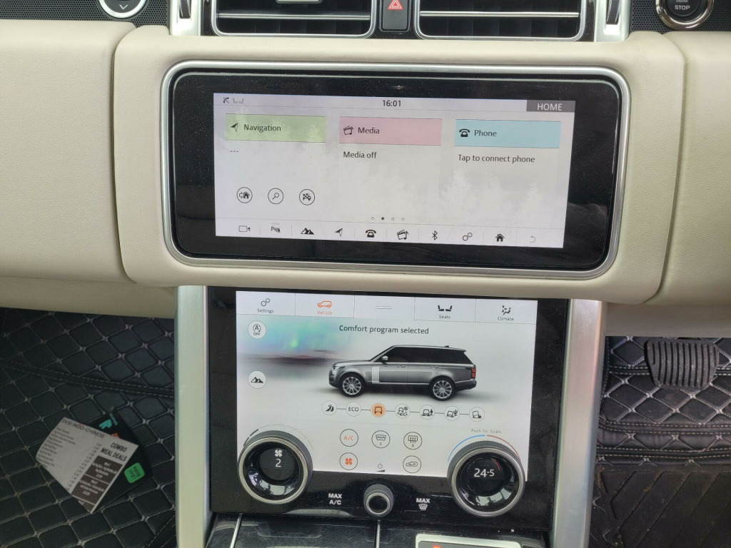 This 2019 Land Rover Range Rover SD V6 Vogue boasts a full service history and has had only one owner from new. This Euro 6 compliant vehicle features a powerful 3.0L diesel engine paired with a four wheel drive drivetrain, offering a towing weight of 3500 kg. You can drive with confidence knowing it comes with a 12 month MOT and a 3 month warranty. Inside, you will find luxurious 20 way heated front seats with power recline, complemented by heated rear seats and memory function. Enjoy your journeys with the premium Meridian Sound System and the expansive fixed panoramic roof.Experience impressive performance with an acceleration of 0 to 60 mph in just 7.4 seconds. The large boot space provides ample room for all your luggage or equipment, making it a practical choice for any adventure. Additional features include automatic headlights and front and rear recovery hooks, which also function as a towbar. These elements combine to make this Range Rover a superior option compared to other vehicles in its class. .3in interactive driver display, 12v power socket, 20-way heated front seats with power recline heated rear seats, 20in alloy wheels - 12 spoke style 1065 with silver finish, abs - anti lock braking system, acoustic laminated windscreen, adaptive dynamics, airbags - curtain, airbags - front side, aluminium treadplates with range rover lettering, armrests - front - driver and passenger, auto access height, auto-dimming power fold - heated door mirrors with memory and approach lights, automatic headlights, autonomous emergency braking - city-urban and pedestrian, bluetooth phone connection, bonnet and tailgate lettering - atlas, cbc - cornering brake control, carpet mats, centre mounted stop light, corris grey tow eye cover, cruise control and speed limiter, dab - digital audio broadcast, dsc - dynamic stability control, ebd - electronic brake-force distribution, epas - electronic power assisted steering, epb - electronic park brake, etc - electronic traction control, electric windows with one-touch open-close and anti-trap, electrical towing preparation, electrically adjustable steering column, electronic cross linked air suspension, fixed panoramic roof, follow me home lighting, front airbags with passenger seat occupant detector, front bumper accent - atlas, front centre console cooler compartment, front grille mesh - gloss black, front grille mesh edging - atlas, front row leather covered seat-back pockets, front and rear cupholders, front and rear grab handles, front and rear parking aid, front and rear recovery hooks, glovebox - lockable, hdc - hill descent control, hazard lights under heavy braking, heated windscreen, height adjustable seatbelts, isofix child seat anchor points, incontrol apps, interior ambient lighting, intrusion sensor, kalahari veneer, keyless entry, laminated front and rear side glass, lane departure warning, leather steering wheel, loadspace compartment light, loadspace cover, locking wheel nuts, low traction launch, luggage tie-downs in loadspace, matrix led headlights with signature drl, meridian sound system, mirror caps - body coloured, multi-function steering wheel, non smokers pack, perimetric and volumetric alarm with engine immobilisation, power operated child locks, powered gesture tailgate - boot lid, pro services and wi-fi hotspot, protect, push button start, rsc - roll stability control, rain sensing windscreen wipers, rear centre armrest, rear fog lights, rear lights - led, rear view camera, reduced section alloy spare wheel, remote premium, roof - body coloured, satin body-coloured exterior accents, seat-back pockets on front row, secure tracker, side accent and door graphic - satin body coloured, standard glass, steering wheel - heated, tpms - tyre pressure monitoring system, tv - digital, tailgate finisher in atlas, terrain response, three zone climate control, touch pro duo - dual 10in screens, trailer stability control, twin blade sunvisor with illuminated vanity mirrors, usb sockets, unpainted brake calipers, vogue badge