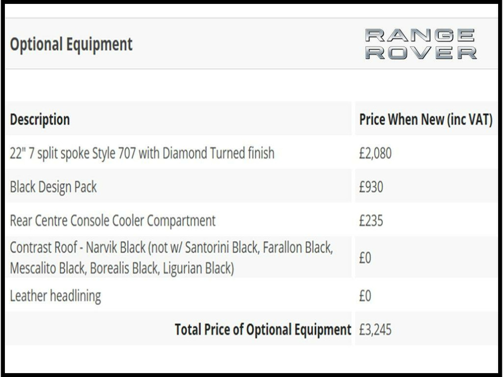 . 20in Brake Calipers, 21in Alloy Wheels - 10 Spoke Diamond Turned Finish Style 101, 360 Degree Parking Aid, 360 Degree Surround Camera System, ABS - Anti Lock Braking System, ASL - Active Speed Limiter, ATPC - All Terrain Progress Control, Active Rear Locking Differential, Adaptive Cruise Control with Queue Assist and Intelligent Emergency Braking, Adaptive Dynamics, Adjustable - Auto Dimming - Heated - Power Fold Memory Exterior Mirrors with Approach Lamps, Auto Dimming Rear View Mirror, Autobiography Badge, Automatic High Beam Assist, Autonomous Emergency Braking - City-Urban and Pedestrian, Auxiliary Power Sockets, Blind Spot Assist with Reverse Traffic Detection, Blind Spot Monitor with Reverse Traffic Detection, Bluetooth Phone Connection, Body Coloured Door Handles and Front Bumper Vent Blades, CBC - Cornering Brake Control, Centre Mounted Stop Light, Customer Configurable Autolock - Doors Lock on Driveaway, Customer Configurable Interior Mood Lighting, Customer Configurable Single Point Entry, DAB - Digital Audio Broadcast, DSC - Dynamic Stability Control, Daytime Running Lights, Driver Condition Monitor, Driver and Passenger Airbags, Driver and Passenger Armrest, Driver and Passenger Twin Blade Sunvisor with Illuminated Vanity Mirror, Dual View Touchscreen, EBA - Electronic Brake Assist, EBD - Electronic Brake-Force Distribution, EPAS - Electronic Power Assisted Steering, ESP - Electronic Stability Program, ETC - Electronic Traction Control, Electric Windows - Front and Rear, Electrical Towing Preparation, Electronic Cross Linked Air Suspension, Embossed Autobiography Script on Centre Rear Squab, Extended Veneer Pack, Exterior Standard Bumper Pack, Follow Me Home Lighting, Four Zone Climate Control, Front Centre Console Cooler Compartment, Front Fog Lights, Front Grille Ribs Finished in Bright Chrome Plating, Front Grille and Mesh in Bright Atlas, Front Premium Carpet Mats, Front Row Leather Covered Seat-back Pockets, Front and Rear Cupholders, Front and Rear Park Distance Sensors with Visual Display, Front and Rear Recovery Hooks, Gesture Tailgate, HDC - Hill Descent Control, HDD Premium Navigation, Hazard Lights Under Heavy Braking, Heated Windscreen - Laminated, ISOFIX Child Seat Anchor Points, Illuminated Aluminium Tread Plates with Unique Autobiography Script, InControl Apps, InControl Protect, InControl Remote Premium for Warranty Period, InControl Secure for Warranty Period, InControl Touch Pro - 10.2in Touchscreen, Intrusion Sensor, Keyless Entry with Push Start Button, Lane Keep Assist, Loadspace Anchor Points, Loadspace Compartment Light, Loadspace Cover - Hinged with Hardcover, Locking Wheel Nuts, Meridian Digital Surround Sound System, Misfuel Protection Device, Non Smokers Pack, Perimetric and Volumetric Alarm with Engine Immobilisation, Power Operated Child Locks, Pro Services for Warranty Period, RSC - Roll Stability Control, Rain Sensing Windscreen Wipers, Rear Fog Lights, Rear Lights - LED, Reduced Section Alloy Spare Wheel, Remote Park Heat with Timed Climate, Roof - Body Coloured, Seats - Semi Aniline Leather Style 19, Secure Glove Box Stowage, Sliding Panoramic Roof, Soft Door Close, Steering Wheel - Heated, TPMS - Tyre Pressure Monitoring System, Television, Terrain Response 2 Auto, Traffic Sign Recognition and Intelligent Speed Limiter, Trailer Stability Control, USB Sockets, Veneer - Grand Black Lacquer, Xenon Headlamps with LED Signature Lighting, Rear Centre Console Cooler Compartment, Black Design Pack, 22in Alloy Wheels - 7 Split Spoke Diamond Turned Finish Style 707.