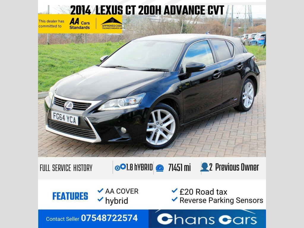 chanscars ltd is pleased to present yourself with this outstanding 2014 Lexus CT 200h 1.8 Advance CVT (s/s) 5dr Hybrid With 71451 Miles & 2 Previous Owners. you can be confident this car is in great condition With the Full Service History, MOT Untill 14/11/2026 .It is £20 Road tax for this car. There are many Great features in this car like Sat-Nav to help you navigate To Places, Reverse Parking Sensors, ECO And Sports Mode Driving , The Blue Tooth interface -Smart, safe and simple to use meaning you can stay connected all the time. Convenient Heated Seats For The Cold Mornings. 17in Alloy Wheels, ABS - Anti-Lock Braking System, AUX Connection, Airbags - Curtain Shield, Airbags - Driver 2-Stage, Airbags - Front Knee, Airbags - Front Passenger Cut Off Switch, Airbags - Front Side, Airbags - Passenger 2-Stage, Anti Theft System Alarm, Armrest - Front, BAS - Brake Assist System, Bluetooth Connectivity, CD-Radio, Climate Control - Dual Zone, Colour Screen 7in, Cruise Control, DAB Radio, Daytime Running Lights - LED, Door Mirrors - Electrical Foldable - Heated, Driving Modes - Normal-Eco-Sport-Comfort-EV, EBD - Electronic Brakeforce Distribution, Electric Windows - Front and Rear, Front Fog Lights, HAC - Hill Assist Control, Headlights - HID - High Intensity Discharge-Halogen, ISOFIX Child Restraint System, Immobiliser, Inlays - Black, Parking Assistance - Front Sensor, Parking Assistance - Rear Sensor, Power Steering - Electric Speed Sensitive, Push Start Button, Rain Sensitive Windscreen Wipers, Rear Privacy Glass, Remote Rotary Dial, Satellite Navigation - Lexus Navigation System, Scuff Plates - Black, Seats - Front 6-Way Manual Adjustment, Seats - Front Heated, Seats - Passengers 4-Way Adjustment, Shark Fin Antenna, Smart Entry and Start System, Space Saver Spare Wheel, Speakers x6, Speed Sensitive Auto Door Lock, Spoiler - Rear, Steering Wheel - Leather, Steering Wheel - Tilt and Telescopic, TPWS - Tyre Pressure Warning System, TRC - Traction Control System, Taillights and Active Brake Lights - LED, USB Input, VSC - Vehicle Stability Control. Full service history