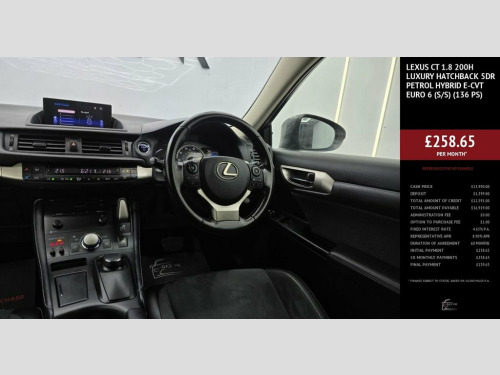 This 2018 Lexus CT 200h 1.8 200h Luxury Hatchback 5dr Petrol Hybrid E-CVT Hatchback is currently available for £13,990 with Automatic gearbox. For more information or to arrange a viewing, click here to send us an email using form below.