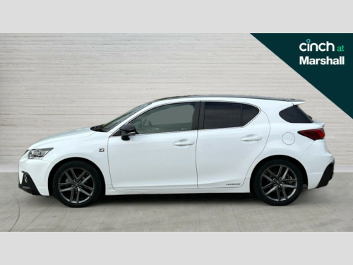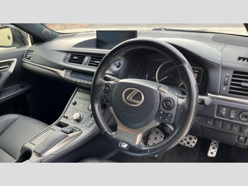 Lexus CT 200h 1.8 F-Sport 5dr CVT 7" colour screen, Adaptive cruise control, Bluetooth telephone connectivity, Drive mode selector, Lexus Navigaton System, Rear parking sensors, Reversing camera, Speed sensitive power steering, Traffic sign recognition, Trip computer, Performance dampers, Sports suspension, Vehicle Dynamics Integrated Management, Vehicle Stability Control (VSC), 6 speakers, Auxiliary input socket, DAB Digital radio, Radio/CD + MP3, Steering wheel audio controls, USB connection, Adaptive rear spoiler, Auto dimming rear view mirror, Auto high beam, Black lower fog light bezel, Black mesh grille, Body colour bumpers, Door mirror puddle lights, Electric adjustable door mirrors, Electric folding door mirrors, Front and rear electric windows, Front fog lights, Green tinted UV reducing windscreen glass, Heated door mirrors, LED brake lights, LED daytime running lights, LED tail lights, Privacy glass (rear side windows and rear screen), Rain sensor windscreen wipers, Rear diffuser, Rear wiper, Shark fin roof aerial, 2 cupholders in front centre console, 4 load securing hooks in luggage area, 5 headrests, 60/40 split folding rear seat, Aluminium pedals, Aluminium scuff plates, Carpet mats, Centre arm rests, Driver 6-way manually adjustable front seat, Driver/passenger sunvisors with illuminated vanity mirrors, Dual zone climate control, Fabric/Tahara leather upholstery, Front door pockets, Heated front seats, Illuminated entry system, Isofix child seat attachment, Leather steering wheel, Map pocket on front seat backs, Passenger 4-way manually adjustable front seat, Perforated leather sports seats, Rear armrest, Rear coat hook, Storage compartment in centre console, Storage compartment under load area floor, Tilt/telescopic adjustable steering wheel, ABS, Brake assist function, Curtain shield airbag, Driver and passenger side airbags, Drivers knee airbag, Dual stage driver/passenger airbags, Electronic brake force distribution, Front seatbelt pretensioner, Passenger airbag cut-off device, Passenger knee airbag, Pre crash system, Seatbelt warning, Sway warning system, Three 3 point rear seatbelts, Traction control, Tyre pressure warning, WHIPS whiplash protection system - front, Anti theft system, Double locking, Immobiliser, Intrusion sensor and alarm, Locking wheel nuts, Remote central locking, Speed sensitive power door locks, VIN Window etching, Space saver spare wheel