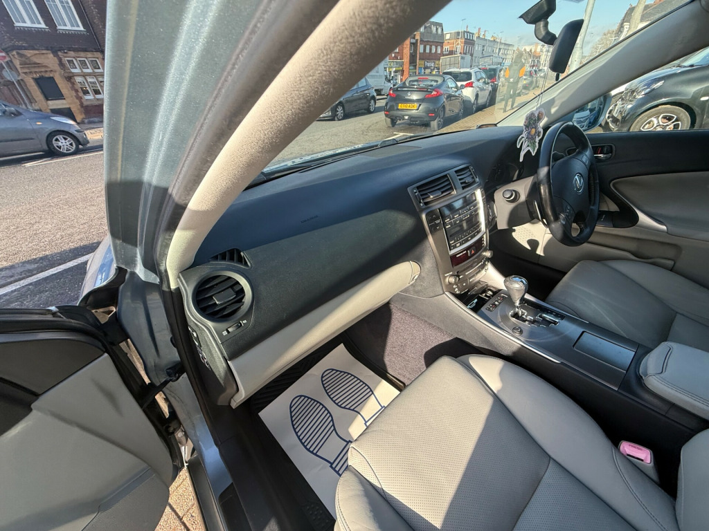 Automatic Lexus IS. Heated and cooling Seats with Cruise Control. Really nice condition, a vehicle that has been very well looked after. Just arrived. All vehicles come with a H.P.I certificate, a full Major service before collection, 12 Months MOT and a 6 month warranty which can be upgraded. 2,3,4,5 year finance options with zero deposit available. We specialize in people with poor credit scores who are looking to get back on track. All major debit cards accepted. Part exchange welcome. We have a panel of 30+ lenders and approve 9 out 10 of applications., justable steering column/wheel, armrest, carpet, climate control, cruise control, electric windows (front/rear), gear knob leather, in car entertainment (radio/cd autochanger/mp3), seat height adjustment, seats electric (driver/passenger), seats heated (driver/passenger), speakers, steering wheel leather, tinted glass (rear windows), upholstery leather, air bag driver, air bag knee, air bag passenger, air bag side, alarm, anti-lock brakes, central door locking, centre rear seat belt, deadlocks, electronic brake force distribution, electronic stability programme, front fog lights, head restraints, immobiliser, power-assisted steering, seat - isofix anchorage point, traction control system, alloy wheels (17in), mirrors external (electric heated/folding), spare wheel (space saver)