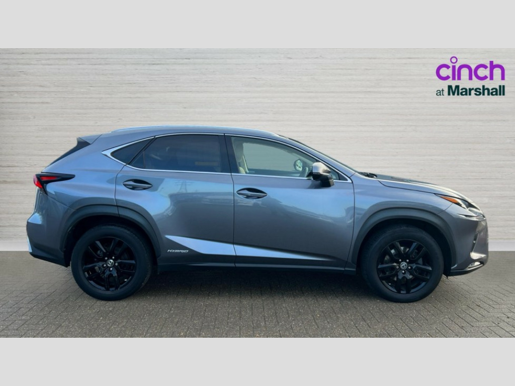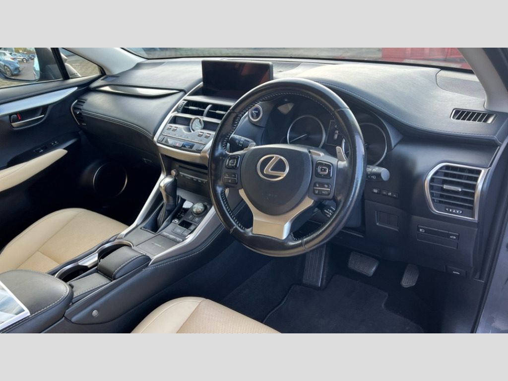 Lexus NX 300h 2.5 Luxury 5dr CVT [Premium Nav] 8" colour display screen, Adaptive cruise control + pre-crash system, Analogue clock, Bluetooth telephone connectivity, Drive mode selector, Electric speed sensitive power steering, Front and rear parking sensors, Lane keep assist, Multimedia display, Premium navigation system, Push button starter, Remote touch interface, Reversing camera, Service interval indicator, Traffic sign recognition, Trip computer, VDIM, Vehicle Stability Control (VSC), 10 speakers, Aux input, DAB Digital radio, DVD System, Steering wheel mounted audio controls, USB connection, Adaptive high beam assist, Body colour bumpers, Chrome grille surround, Electric windows-anti jam+driver side one touch, Electric/heated/folding door mirrors, Electrochromatic rear view mirror, Illuminated door handles, LED daytime running lights, LED front fog lights with static cornering light function, LED Headlights, LED rear lights, Privacy glass, Puddle lights in exterior door handles, Rain sensor windscreen wipers, Rear wiper, Roof rails, Roof spoiler, Shark fin roof aerial, 12V socket in centre console and luggage area, 2 cupholders in front centre console, 3 spoke leather steering wheel, 60/40 split folding rear seat, 8 way electrically adjustable front seats, Adjustable height seatbelt anchor, Adjustable rear seat backrest, Aluminium scuff plates, Centre armrest with storage box, Dual climate control air conditioning system, Electric adjustable steering column, Front and rear textile carpet mats, Front seat back map pockets, Heated front seats, Isofix child seat attachment, Leather gear lever, Leather upholstery, LED interior illumination, Rear air vents, Rear centre armrest with 2 cupholders, Rear headrests, Shopping hook in boot, Sliding sunvisors with illuminated vanity mirrors, Tie down hooks in luggage area, 3x3 point rear seatbelts, ABS, Active front headrests, Curtain airbags, Driver/Front Passenger airbags, Driver/front passenger side airbags, Drivers knee airbag, EBD + Brake Assist, Electronic parking brake, Front/rear seatbelt pre-tensioners, Hill start assist, Passenger airbag cut-off device, Traction control, Tyre pressure warning, Immobiliser, Locking wheel nuts, Remote central double locking, Smart keyless entry, Speed sensitive power door locks, Silver interior trim, Space saver spare wheel