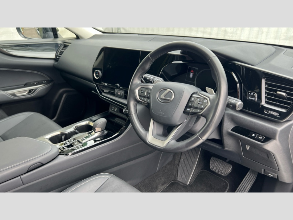 Lexus NX 450h+ 2.5 5dr E-CVT [Premium Pack] 4 driving modes EV/Eco/Normal/Sport, 7" display in instrument binnacle, Blind spot monitoring with rear cross traffic alert, Bluetooth telephone connectivity, eCall emergency system, Electric speed sensitive power steering, Intelligent parking sensors - 4 front and 4 rear, Lane change flasher function, Lexus link connect - Cloud based navigation, cloud based voice assistant, always online, 14" HD touchscreen, embedded nav and faster CPU, Push button starter, Reversing camera with back guidelines, Service interval indicator, Tailgate, Wireless Apple CarPlay and wired Android Auto, Wireless Smartphone charger, 6.6 kW onboard charger, All Wheel Drive (AWD), Hybrid automatic transmission, Vehicle Dynamics Integrated Management (VDIM), Vehicle Stability Control (VSC), 10 speakers, 4 USB ports - 2 front, one USB C, 2 rear USB C, DAB Digital radio, Auto dimming interior rear view mirror, Automatic headlights, Bi LED headlights, Double hidden exhaust pipes, Electric sunroof, Front and rear one touch power windows, with anti-jam protection, Heated, auto-folding, auto-dimming outside mirrors with reverse tilt function and turn indicators, Illuminated door handles with puddle light, LED brake lights and rear lights with emergency brake signal, LED cornering lights, LED daytime running lights, LED front fog lights, LED Indicators, Power back door with kick sensor, Privacy glass, rear doors and tailgate, Rain sensor windscreen wipers, Rear side wing doors, Rear wiper, 12V accessory port centre console and luggage compartment, 2 cupholders in front centre console, 2 way electrical lumbar adjustment for driver, 2 x fixed shopping bag hooks in boot, 2 x sun visors with vanity mirror and lamp, 3 seat bench in 2nd row, 4 x tie down hooks in the boot, 60/40 split folding rear seat, 8 way driver/passenger electrically adjustable front seats, Adjustable rear seat backrest, Card holder installed in driver and passengers sun visors, Centre armrest with storage box, Dual climate control air conditioning system, Front and rear head restraints, Front and rear textile carpet mats, Front passenger seat, Heated front seats, Heated steering wheel, Leather gear lever, LED interior illumination, Power adjustable leather steering wheel with paddle shifts, Premium Tahara leather upholstery, Rear centre armrest with 2 cupholders, Whiplash Injury Lessening (WIL) feature (active headrest) for seats, 2 x Isofix child rear seat restraints, 3 point ELR front seatbelts with pretensioners, 3x3 point rear seat belts, ABS, Adjustable seat belt anchor points, Driver and front passenger 2 stage airbag, Driver/front passenger side airbags, Drivers knee airbag, E-Latch with safe exit assist, EBD + Brake Assist, ECB (Electronically Controlled Brake System), Electronic parking brake, Front and rear curtain shield airbags, Front center airbag, Front passenger seat cushion airbag, Hill assist control, Lexus safety system - dynamic radar cruise control, pre collision system day and night, lane tracing assist, road sign, automatic high beam, OTA, Manual rear child locks, Passenger airbag cut-off device, Traction control, Tyre pressure warning, Anti-theft system with alarm, intrusion sensor, glass breakage sensor, tilt sensor and engine immobiliser, Locking wheel nuts, Smart keyless entry, Speed sensitive auto door locking, Two motion door lock with double lock, Ultra Wide Band (UWB) Anti-theft system, VIN Window etching, 3D prism black Inlay, Organic inlay, Tyre repair kit