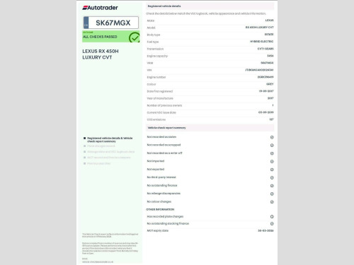 Premium Vehicles is proud to offer this stunning Lexus RX 450h Luxury CVT, where performance meets pure sophistication. Powered by a responsive 3.5-litre V6 hybrid with intelligent AWD, it delivers seamless power with impressive efficiency. Step inside and youre greeted by supple leather, modern technology, and the whisper quiet comfort Lexus is known for. ????Finance Made Simple, Bespoke finance packages available at competitive rates, tailored to your budget, with fast approval so you can enjoy your new car without delay. ????At a Glance, - Maintained to an exceptional standard with a full Lexus service history, comprising eight main dealer services to date and serviced every year without fail. The hybrid battery health check was successfully passed at the most recent Lexus service, offering complete peace of mind. - MOT valid until Sep 2026, no advisories. - 2 owners. - 2 keys. - ULEZ compliant. - Vehicle check clear, certificate available. - 6 Months Nationwide Warranty (parts & labour), with option to extend up to 3 years. ????️Specification Includes:, - Tilt & Slide Panoramic Roof, - Adaptive Cruise Control (ACC), - Automatic High Beam Assist, - Lane Keep Assist, - Reversing Camera with Front & Rear Parking Sensors, - Heated & Ventilated Front Seats, - 8-Way Electrically Adjustable Front Seats with Drivers Memory Function, - Power tailgate, - Drive Mode Select (Eco/Normal/Sport/EV Mode), - Lexus Navigation System, - Dual Zone Climate Control, - Power Adjustable Steering Column, - Electronic Parking Brake with Brake Hold Function, - Electrically Folding, Heated & Auto-Dimming Door Mirrors, - Bluetooth connectivity, - DAB Digital Radio, Buy With Confidence:, ✅Proudly top-rated for 4 consecutive years, ✅FCA Authorised & Regulated, ✅Trusted AA Motor Dealer, ✅Complimentary warranty & 12 months AA breakdown cover, ✅No admin fees (£249 applies for third-party broker purchases only), ✅Part exchange welcomed, ⭐About Us, At Premium Vehicles, we are proud to be an award-winning????AA Motor Dealer. Our reputation is built on trust, professionalism and delivering an exceptional experience.