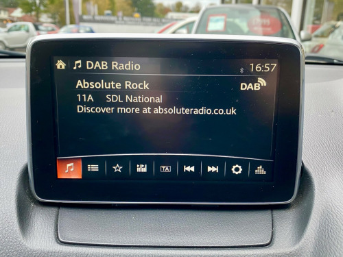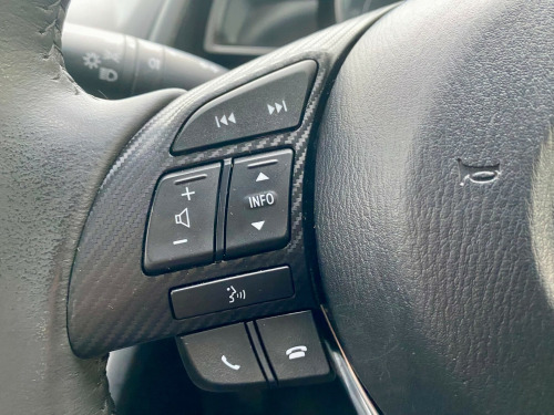 v power socket - front, 7in colour touch screen display, aux socket, aha app and stitcher app integration, bluetooth audio streaming, bluetooth hands free system, dab radio, radio-cd, satellite navigation - european mapping with 3-years map updates, satellite navigation system, shark fin antenna, speakers x6, usb - ipod connectivity, 16in alloy wheels - silver, door mirrors - electrically adjustable-heated-folding-turning signal, electric windows - front and rear with one touch auto up and down on drivers side, exhaust tailpipes - twin, radiator grille - black, side sill trim - black, spoiler - rear roof, tyre repair kit, adjustable speed limiter, cruise control, gear shift indicator, multimedia commander, power assisted steering - electronic, trip computer, tyre pressure monitoring system, voice control for phone, air conditioning, air vents - piano black surround with dark red inner ring, courtesy light with integral spotlights, cupholder - centre console x2, dashboard panel - black - soft-touch with stitching, door pockets - front, door pockets - rear, engine start-stop button, front knee pads - black plastic, gear knob - leather-wrapped with piano black surround, glovebox illumination, grab handles - front passenger, grab handles - two rear with coat hooks, handbrake - leather wrapped, inner door handles - satin silver, luggage compartment - flexible floorboard for adjustable floor height or secure separate storage space, luggage compartment - light, luggage compartment - tonneau cover, overhead console with sunglassess holder, pollen filter, rear view mirror - manual - day and night mode, seatback pocket - rear of front passenger seat, seats - 60-40 split folding rear, seats - drivers manual slide-recline and height adjustment, seats - front passenger manual slide and recline adjustment, side door trim - black cloth inserts, steering wheel - leather-wrapped with satin silver bezel, steering wheel - mounted audio and bluetooth controls, steering wheel - telescopic and tilt adjust, sunvisors - driver ticket holder, sunvisors - driver and front passenger with vanity mirror, three height adjustable rear head restraints, airbags - curtain front, airbags - curtain rear, airbags - driver, airbags - front passenger, airbags - front passenger deactivation system, anti lock braking system - 4w-abs, dsc - dynamic stability control, deadlocking, eba - emergency brake assist, ebd - electronic brakeforce distribution, emergency stop signalling system - ess, front side airbags, hill hold assist, isofix child seat anchorage for outer rear seats, immobiliser, mazda advanced impact distribution and absorption system - maidas, remote central locking, srs - supplementary restraint system, seatbelt reminder - front with audible warning, tcs - traction control system, thatcham catergory 1 alarm, daytime running lights, headlights - coming-leaving home, headlights - halogen, headlights - manual levelling
