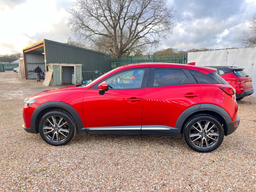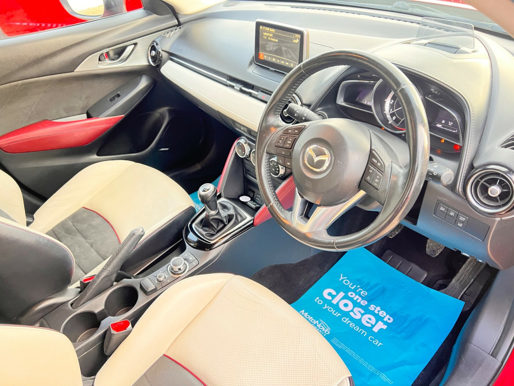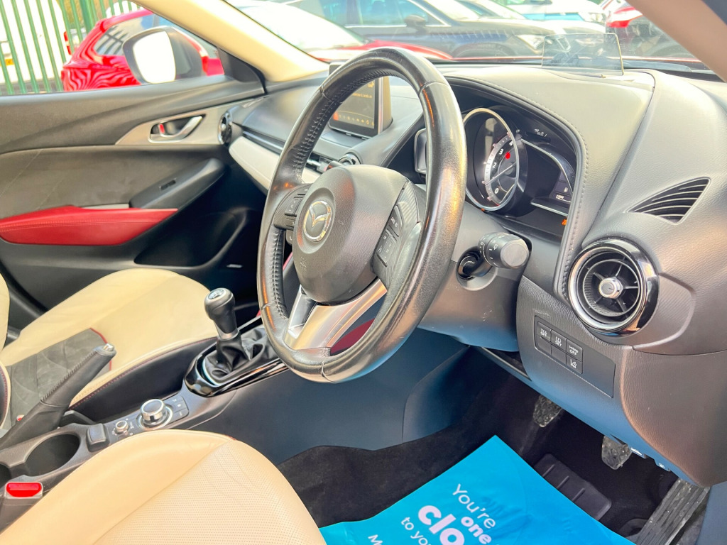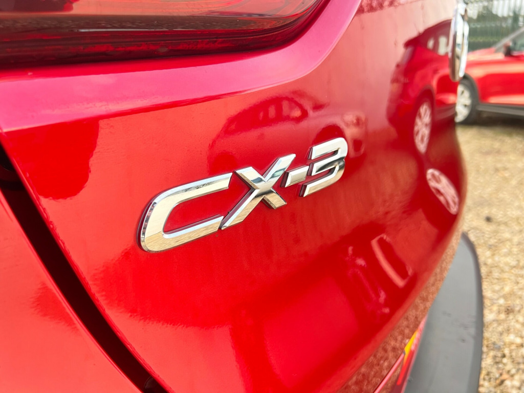 This 2015 Mazda CX-3 2.0 SKYACTIV-G Sport Nav SUV with 81964 miles on the clock is a ULEZ compliant vehicle, perfect for city driving. This 5-door SUV comes with 5 seats, making it ideal for family trips. Powered by a petrol engine and a manual transmission, this Euro 6 (s/s) vehicle is equipped with features such as a 12V Power Socket - Front, 7in Colour Touch Screen Display, AUX Socket, Aha App and Stitcher App Integration, and Bluetooth Audio Streaming, offering convenience and entertainment on the go.- Service history- Will come with 12 months MOT- 2 Keys- Finance available- Part exchange welcome- Extended warranties available v power socket - front, 7in colour touch screen display, aux socket, aha app and stitcher app integration, bluetooth audio streaming, bluetooth hands free system, dab radio, premium bose sound system, radio-cd, satellite navigation - european mapping with 3-years map updates, satellite navigation system, shark fin antenna, speakers x7, usb - ipod connectivity, 18in alloy wheels - gun metallic diamond-cut, door mirrors - electrically adjustable-heated-folding-turning signal, electric windows - front and rear with one touch auto up and down on drivers side, exhaust tailpipes - twin, privacy glass - rear and rear side windows, radiator grille - chrome-accent, side sill trim - chrome accent, spoiler - rear roof, tyre repair kit, adjustable speed limiter, cruise control, digital speedometer, gear shift indicator, head up display, lane departure warning system, multimedia commander, power assisted steering - electronic, rear parking sensors, reversing camera, trip computer, tyre pressure monitoring system, voice control for phone, air conditioning - automatic climate control, air vents - piano black surround with dark red inner ring, courtesy light with integral spotlights, cupholder - centre console x2, dashboard panel - black - soft-touch with stitching, door pockets - front, door pockets - rear, engine start-stop button, front knee pads - dark red - soft-touch with stitching, gear knob - leather-wrapped with satin silver surround, glovebox illumination, grab handles - front passenger, grab handles - two rear with coat hooks, handbrake - leather wrapped, inner door handles - satin silver, luggage compartment - flexible floorboard for adjustable floor height or secure separate storage space, luggage compartment - light, luggage compartment - tonneau cover, overhead console with sunglassess holder, pollen filter, rain-sensing front wipers, rear view mirror - manual - day and night mode, seatback pocket - rear of front passenger seat, seats - 60-40 split folding rear, seats - drivers manual slide-recline and height adjustment, seats - front heated, seats - front passenger manual slide and recline adjustment, side door trim - dark red - soft-touch with black leatherette inserts, soft-touch meter hood - black, steering wheel - leather-wrapped with satin silver bezel, steering wheel - mounted audio and bluetooth controls, steering wheel - telescopic and tilt adjust, sunvisors - driver ticket holder, sunvisors - driver and front passenger with vanity mirror, three height adjustable rear head restraints, airbags - curtain front, airbags - curtain rear, airbags - driver, airbags - front passenger, airbags - front passenger deactivation system, anti lock braking system - 4w-abs, dsc - dynamic stability control, deadlocking, eba - emergency brake assist, ebd - electronic brakeforce distribution, emergency stop signalling system - ess, front side airbags, hill hold assist, isofix child seat anchorage for outer rear seats, immobiliser, mazda advanced impact distribution and absorption system - maidas, srs - supplementary restraint system, seatbelt reminder - front with audible warning, smart city brake support, smart keyless entry, tcs - traction control system, thatcham catergory 1 alarm, dusk sensing automatic headlights, front fog lights - led, headlights - adaptive front lighting system, headlights - automatic levelling, headlights - coming-leaving home, headlights - led, led daytime running lights, rear lights - led