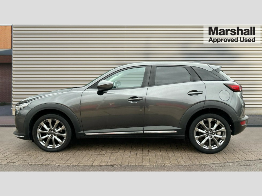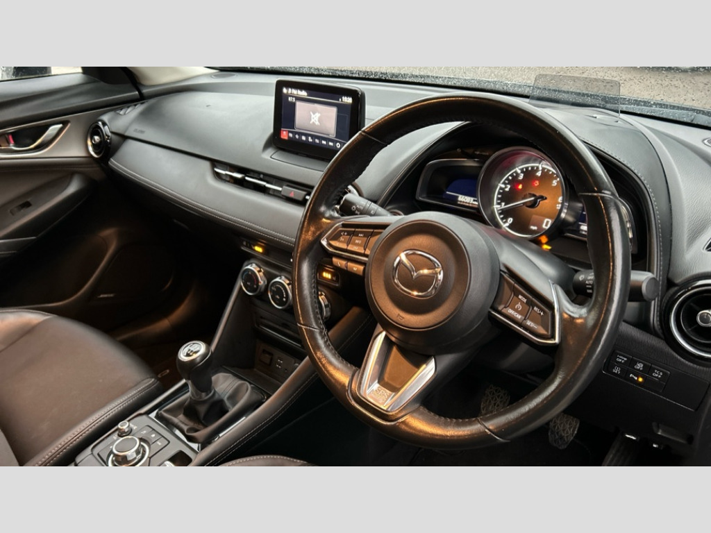 Mazda CX-3 1.8d Sport Nav + 5dr 7" touchscreen with multimedia commander and Aha and Stitcher app, Colour head up display, Cruise control + speed limiter, Digital speedometer, Electric power steering, Emergency stop signalling system, Engine start/stop button, Front parking sensor, Internet access with app integration, Lane departure warning system, Navigation system, Rear parking sensor, Reversing camera, Service interval indicator, Traffic sign recognition, Trip computer, i-stop, 2 USB/aux input socket, Bluetooth audio streaming, Bose Premium Audio system with 7 speakers, AM/FM, DAB radio and single CD/MP3, Steering wheel mounted audio controls, Adaptive front lighting system, Auto dimming rear view mirror, Automatic headlamp levelling, Body colour bumpers with chrome inserts, Body colour door handles, Coming/leaving home lighting function, Dual exhaust pipes, Dusk sensitive headlamps, Electric front/rear windows with one touch, Electrically adjustable/heated/auto power folding door mirrors with integrated indicators, Front grille, LED daytime running lights, LED front fog lights, LED Headlights, LED indicator lights, LED rear lights, Rain sensing front wipers, Rear privacy glass, Rear wiper, Shark fin antenna, 12V power outlet, 3 grab handles with rear coat hook, 60/40 split folding rear seat, Black front knee pads with soft stitching, Chrome door sill trims, Climate control air conditioning, Cloth/leatherette upholstery, Driver seat manual slide, recline and height adjust, Driver/passenger sunvisors + vanity mirrors (drivers side with ticket holder), Flexible cargo board, Front and rear door pockets, Front centre armrest with 2 cupholders, Gear shift indicator, Glovebox, Heated front seats, Heated steering wheel, Height adjustable front/rear head restraints, Inner chrome door handle and surround, Interior courtesy light, Isofix system on outer rear seats, Leather gear knob with silver insert, Leather steering wheel, Luggage compartment lighting, Passenger seat + manual slide/recline adjust, Passenger seat back pocket, Rear centre armrest with 2 cupholders, Tilt/telescopic adjustable steering wheel, Tonneau cover, Variable boot floor, 3 rear 3 point seatbelts + pretensioners, ABS/EBD, Advanced Smart City Brake Support - SCBS, DSTC-Dynamic Stability and Traction Control, Dual front airbags, Electronic parking brake, Emergency brake assist, Front and rear curtain airbags, Front side airbags, G-Vectoring control, Height adjustable front 3 point seatbelts + pretensioners, Hill hold assist, Passenger airbag deactivate switch, Seatbelt reminder front and rear, Tyre pressure monitoring system, Remote central locking + deadlocks, Smart keyless entry, Thatcham category 1 alarm + immobiliser, 18" Silver alloy wheels, Tyre repair kit