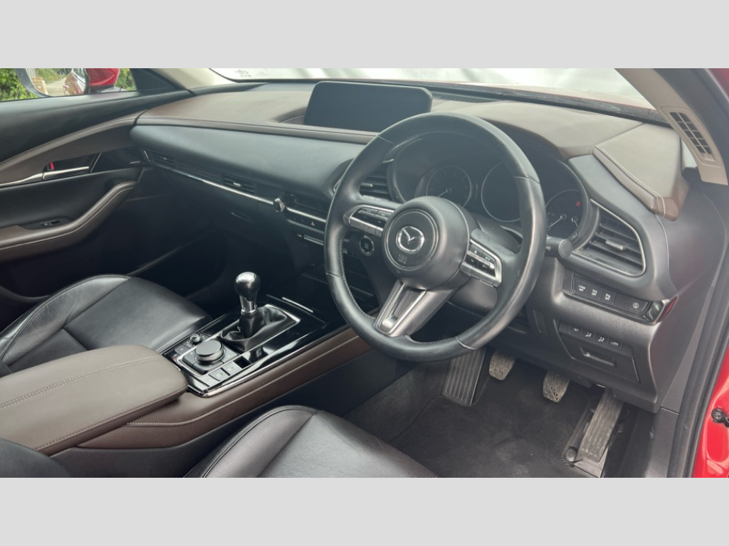 Mazda Cx-30 2.0 Skyactiv-G MHEV GT Sport 5dr 7" TFT Colour driver instrument panel display, 8.8" Colour centre touch screen display with Mazda Connect infotainment, Adaptive cruise control (Mazda radar cruise control) features stop and go, Apple car play/Android Auto, Blind spot monitoring with rear cross traffic alert, Driver attention alert system, E-call with GPS, Emergency stop signalling system, Engine start/stop button, Front and rear parking sensors, Integrated bluetooth, Integrated Mazda navigation system, Intelligent speed assist, Lane keep assist system (LAS) with Lane departure warning system (LDWS), PAS, Power lift gate, Reversing camera, Service indicator, Trip computer, Window projected colour active driving display (head up display) with traffic sign recognition, Cylinder Deactivation, i-stop, 2 USB charging ports, Bose surround sound system with 12 Speaker, Bose center point, Bass match and audio pilot technology, CD player, DAB Digital radio, Multimedia Commander including separate volume dial, Steering wheel mounted audio/bluetooth controls, Adaptive LED Headlights, Auto dimming driver's door mirror, B-pillar and C-pillar garnishes in gloss black finish, Body coloured, electrically adjustable, heated auto power folding door mirrors with integrated indicators, Coming/leaving home lighting function, Door mirrors with tilt-down function when reversing, Dual chrome exhaust, Dusk sensing headlights, Electric front/rear windows with one touch auto up/down, Frameless auto dimming interior rear view mirror, Front kodo turn signal, Gloss black front grille, Gloss black rear roof spoiler, High beam assist, LED headlamps with auto levelling, Privacy glass (rear side windows and rear screen), Rain sensing front wipers with adjustable speed and intermittent wipe, Rear fog lights, Rear wiper, Signature front LED daytime running lights, Signature LED rear combination lights with LED rear turn lights, 12V power outlet in centre console, 60/40 split fold down rear seats, Chrome horn pad ring, Dashboard, door cards and front centre armrest in rich brown leather, Driver and front passenger visors with covered vanity mirror and driver ticket holder, Driver seat memory function, Driver's seat, power tilt, slide, recline, height and lumbar adjustment, Driver, Front passenger and two rear grab handles with coathooks, Dual zone climate control air conditioning with rear air vents, Folding rear centre armrest with two cup holders, Front and rear (x3) head restraints, Front and rear door pockets, Front and rear LED lighting, Front armrest, Front centre storage with two cupholders, Front passengers seat manual slide, recline and height adjustment, Gear shift indicator, Glovebox illumination, Heated front seats with 3 stage setting, Heated steering wheel, ISOFIX child seat anchorage points attached on outer rear seats, Leather upholstery with interior accents, Leather wrapped gear shift knob, Leather wrapped steering wheel with telescopic and tilt adjustment, Luggage compartment light, Rear passenger seat map pockets, Roof mounted sunglasses holder, Vinyl leather door panel inserts, 3 point ELR front seat belts x2 with pretensioners, 3 point ELR rear seat belts, Anti-lock braking system (ABS), Driver/Front Passenger airbags, Drivers knee airbag, DSC - Dynamic Stability Control, Electronic parking brake with auto disengage function and auto hold function, Front and rear curtain airbags, Front passenger airbag cut-off switch, Front side airbags, Front smart city brake support, G-Vectoring control plus, Hill launch assist, Mild Hybrid system with regenerative braking, Seatbelt reminder for driver/front passenger and rear seats, Traction control system (TCS), Tyre pressure monitoring system (TPMS), Remote central locking with deadlocking and automatic door lock when driving, Smart keyless entry, Thatcham accredited alarm and immobiliser, 18" Silver metallic alloy wheels, Emergency tyre repair kit