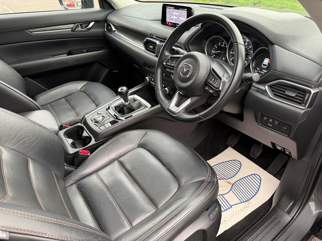Here for sale at Leigh Cars Ltd we are delighted to present this impressive high specification 1 owner from new ULEZ EXEMPT example of the Mazda CX-5 2.0 SkyActiv-G Sport 165bhp 5 door manual finished in machine grey metallic paint. This wonderful example comes with a great service history - 5 services last completed December 2025. As part of our thorough pre sale checks the vehicle comes with a full safety inspection and engine service along with new front brake pads taking care of the only recent MOT advisory - MOT expiry November 2026 . This superb CX-5 offers a competitive list of brilliant standard equipment including full black leather interior, heated front seats, heated steering wheel, electric opening sunroof, electric front seats with driver memory functionality, satellite navigation, heads up driver display, BOSE sound, Apple Car Play and Android Auto, front and rear parking aid, reverse parking camera, automatic lights and wipers, lane assist, electric power tailgate, bluetooth, DAB radio, voice command, auto lights and wipers, powerfold electric mirrors, Mazda radar cruise control, climate controlled air conditioning, 19" alloy wheels, keyless entry + start, central locking, 2 keys + much much more. This amazing high specification 1 owner example would make an ideal car for someone with a higher up driving position, Mazda reliability and overall practicality, it is a no brainer. Road tax is only £195 per year and also benefits from being ULEZ charge ex Leather - Black, 19in Alloy Wheels - Silver, 8in Colour Touch Screen Display, ABS - Anti Lock Braking System, AM-FM-DAB Radio - Featuring 10 Bose Spea, Advanced Smart City Brake Support, Apple CarPlay and Android Auto, Auto Dimming Rear View Mirror, Auxiliary - AUX - and Two USB Input, Blind Spot Monitoring with Rear Cross Tr, Bumper - Front Body Coloured with Black , Bumper - Rear Body Coloured with Black L, Colour Active Driving Display - Colour H, Colour TFT Display with Traffic Sign Rec, DSC - Dynamic Stability Control, Door Mirrors - Electrically Adjustable -, Door Pockets - Driver and Front Passenge, Drivers Seat - Power Slide - Recline - H, Dual Front Airbags, Dual Zone Climate-Contro