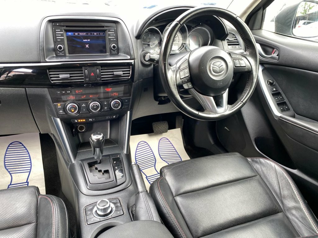 WE HAVE ANOTHER 10 MAZDA CX-5 PLEASE SEE OUR WEBSITE, WALMERSLEY TRADE CENTRE ARE PROUD TO PRESENT THIS AUTOMATIC EURO 6 MAZDA CX-5 2.2 D SPORT NAV 5d 173 BHP WITH EXCELLENT 8 SERVICE HISTORY STAMPS, LONG MOT TILL APRIL 2025 PASSED WITH OUT ANY ADVISORIES, ULEZ COMPLIANT, ONLY 1 FORMER OWNER FROM NEW, RADIO, USB, AUX, BLUETOOTH, MULTIFUNTION STEERING WHEEL, CRUISE CONTROL, PARKING SENSORS, FULL BLACK LEATHER HEATED SEATS, PHONE BUTTON, CLIMATE CONTROLS, ADJUSTABLE SIDE MIRRORS, FULL ELECTRIC WINDOWS, HANDBRAKE BUTTON, 2 CUP HOLDERS AT FRONT, STORAGE COMPARTMENT, ALLOY WHEELS, TYRE INFLATION KIT, TO ARRANGE A VIEWING OR TEST DRIVE CONTACT US ON OUR WEBSITE OR CALL US FOR MORE INFORMATION, ZUTO AND CAR FINANCE 247 CUSTOMERS WELCOME. 5.8" Colour centre display monitor, Bluetooth connectivity with voice contro, Cruise control, Front and rear parking sensors, PAS, Push button starter, Reversing camera, Trip computer, Deadlock, Immobiliser, Keyless entry, Power door locks, Remote central locking, Thatcham Cat.1 alarm, Premium bose audio system with 9 speaker, Radio/CD, Steering wheel mounted audio/cruise cont, USB/iPod/auxiliary input connections, 3 stage heated front seats, 40:20:40 split folding rear bench seat, 6 way powered drivers seat, Auxiliary power socket in luggage area, Driver's electric lumbar adjustment, Dual zone climate control, Front armrest, Front head restraints, Illuminated glovebox, Isofix system on