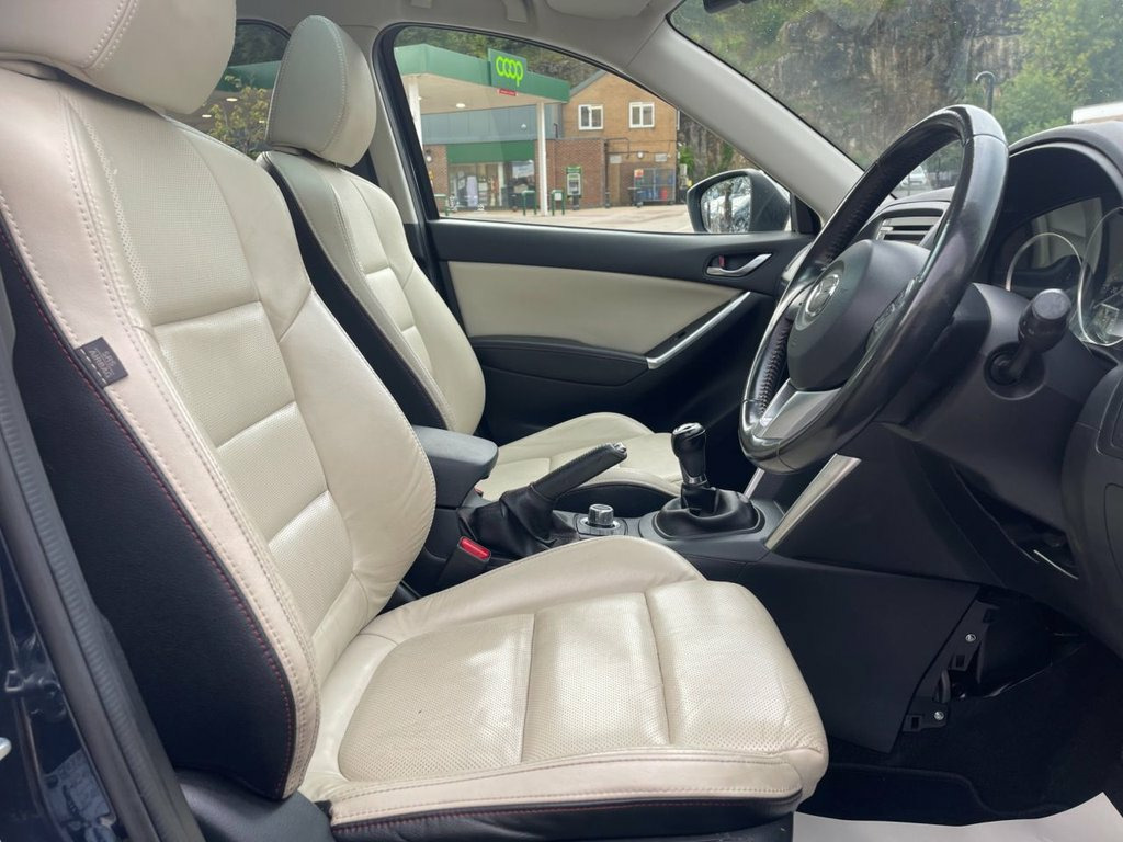 **HERE WE HAVE A VERY NICE 2wd 2.2 DIESEL MAZDA CX-5 SKYACTIV-D SE-L LUX NAV (euro 6) & ONLY £35 ROAD TAX**FULL SERVICE HISTORY WITH 9 SERVICE STAMPS & WILL BE SERVICED WHEN SOLD**SAME LADY OWNER LAST 5+ YEARS ( 2 FORMER KEEPERS )**ELECTRIC SUNROOF**SUPERB CONDITION FULL CREAM LEATHER INTERIOR WHICH IS REALLY COMFY**ELECTRIC FRONT SEATS WITH MEMORY FUNCTION**HEATED FRONT SEATS**SAT NAV**FRONT & REAR PARKING SENSORS WITH LED DISPLAY**CLIMATE CONTROL**A/C**CRUISE CONTROL**C/D RADIO**BLUETOOTH**USB & AUX PORT**SWITCHABLE STOP/START**4 x ELECTRIC WINDOWS**ELECTRIC DOOR MIRRORS**AUTO DIMMING REAR VIEW MIRROR**AUTO WIPERS**AUTO LIGHTS**ISOFIX**FRONT FOGS**REMOTE CENTRAL LOCKING**TOW BAR WITH SINGLE 13 PIN SOCKET**ONLY £35 ROAD TAX**VERY GOOD MPG**OWNERS MANUAL**2 x KEYS** 12V Power Socket - Cargo Area, 12V Power Socket - Front, 17in Alloy Wheels - Silver Finish - Desi, ABS - Anti Lock Braking System, Air Conditioning - Dual Zone Climate Con, Airbags - Curtain Front and Rear, Airbags - Driver, Airbags - Front Passenger, Airbags - Front Passenger Deactivation S, Armrest - Door Trims in Vinyl Leather, Armrest - Rear, Armrest - Rear Centre with Cupholders x2, Audible Readout and Display of SMS and E, Audio Systems - AM-FM Radio-CD Player, Audio Voice Command, Auto Dimming Rear View Mirror, AUX Socket, Box - Between Driver and Passenger Seats, Bumpers - Body Coloured, Central Locking - Remote with Deadlockin, Courtesy Light with Integral Spotlights, Cruise Control