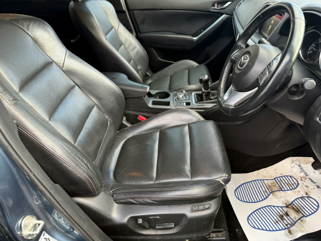 VISIT OUR WEBSITE AT bnlcars.co.uk TO APPLY FOR FINANCE FROM THE COMFORT OF YOUR HOME, COMPLETE THE APLICATION AND YOU GET A DECISION IN MINUTES.We are delighted to present this: Mazda CX-5 2.2 SKYACTIV-D Sport Nav 4WD Euro 6 (s/s) 5drHEATED LEATHER, PARKING SENSORS, NAVIGATION, KEYLESS ENTRY, REAR CAMERA AND MUCH MORE, SEE BELOW FOR FULL SPEC.COMES WITH FULL SERVICE HISTORY, JUST BEEN SERVICED, BOOK PACK, READY TO DRIVE AWAY, Will be supplied with a full year mot for the new owner and 18 months extended WARRANTYDrive away insurance available. Finance available with low APR.Extended warranties available.We can arrange nationwide delivery at cost and on request, for full details or to arrange a test drive please call 07838529660. We offer full dealer facilities. All our vehicles are HPI checked and mileage verified. We are open 7 days a week. v power socket - cargo area, 12v power socket - front, 19in alloy wheels - gunmetal, abs - anti lock braking system, aux socket, adjustable speed limiter, air conditioning - dual zone climate control, airbags - curtain front, airbags - curtain rear, airbags - driver, airbags - front passenger, airbags - front passenger deactivation system, armrest - centre, armrest - rear, armrest - rear centre with cupholders x2, audio systems - am-fm radio-cd player, auto dimming rear view mirror, box - between driver and passenger seats, bumpers - body coloured, chrome accents on dash-door and steering wheel switch panels, courtesy light with integral spotlights, cruise control, cupholder - front x2, dab radio, dsc - dynamic stability control, deadlocking, door handles - body coloured, door mirrors - electrically adjustable-heated-folding, door mirrors - led turn signals, door pockets - front, door pockets - rear, dusk sensing automatic headlights, eba - emergency brake assist, ebd - electronic brakeforce distribution, electric windows - front and rear, electronic parking brake, electronic power assisted steering, emergency stop signalling system - ess, engine start-stop button, exhaust tailpipes - double, exterior temperature gauge, front centre console with storage box, front fog lights - led, front side airbags, gear knob - leather, gear shift indicator, glovebox illumination, grab handles - front passenger and two rear with coat hooks, headlights - adaptive front lighting system, headlights - automatic levelling, headlights - coming-leaving home, headlights - led, headlights - reminder, heater ducts - rear, hill hold assist, isofix child seat anchorage for outer rear seats, immobiliser, integrated bluetooth system, karakuri tonneau cover, led daytime running lights, luggage compartment - light, multi information display, multimedia commander, multimedia system, overhead console with sunglassess holder, panel light control with dimmer, parking sensors - front, pollen filter, premium bose centrepoint surround sound system, privacy glass - rear and rear side windows, rain-sensing front wipers, rear air vents, rear lights - led, rear parking sensors, reversing camera, scr - secondary collision reduction, satellite navigation - european mapping with 3-years map updates, satellite navigation - powered by tomtom technology, seat - 40-20-40 karakuri fold flat rear, seatback pocket - driver and front passenger, seatbelt reminder for front and rear, seats - driver electric 8-way power adjustment, seats - drivers power lumbar adjustment, seats - drivers seat memory function, seats - front heated, seats - front passenger electric 6-way power adjustment, shark fin antenna, silver accents added to the audio panel buttons, smart city brake support, smart keyless entry, speakers x9, spoiler - rear roof body coloured, steering wheel - leather, steering wheel - mounted remote audio controls, steering wheel - tilt and height adjustment, sunvisors - driver ticket holder, sunvisors - driver and passenger with covered mirror-illumination, tcs - traction control system, thatcham catergory 1 alarm, touch screen - 7in colour tft, trip computer, tyre pressure monitoring system, tyre repair kit, usb connection x2, voice control for navigation, safety pack, leather - black