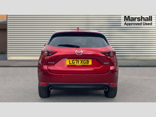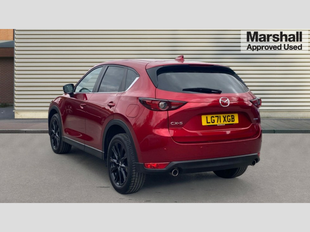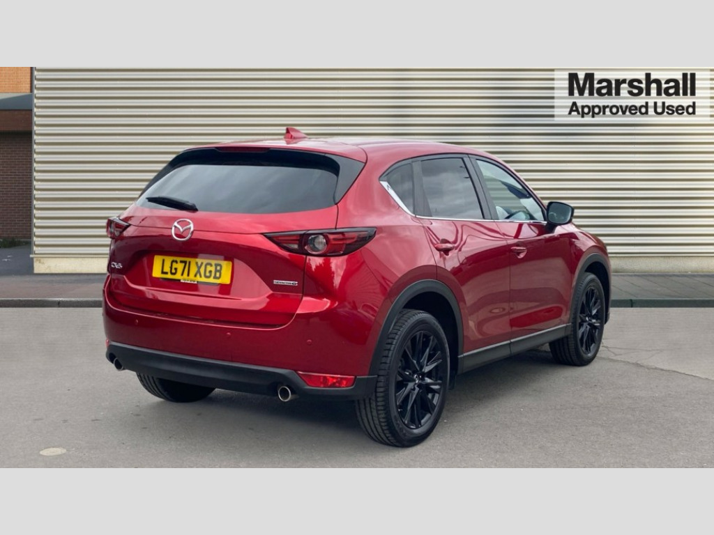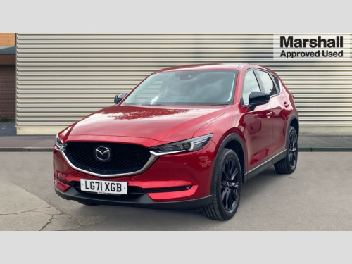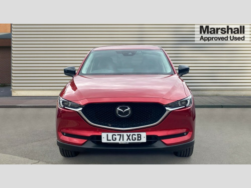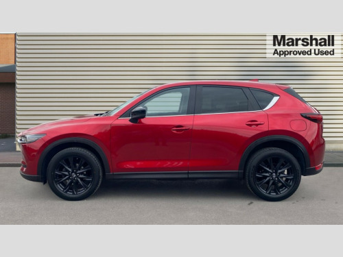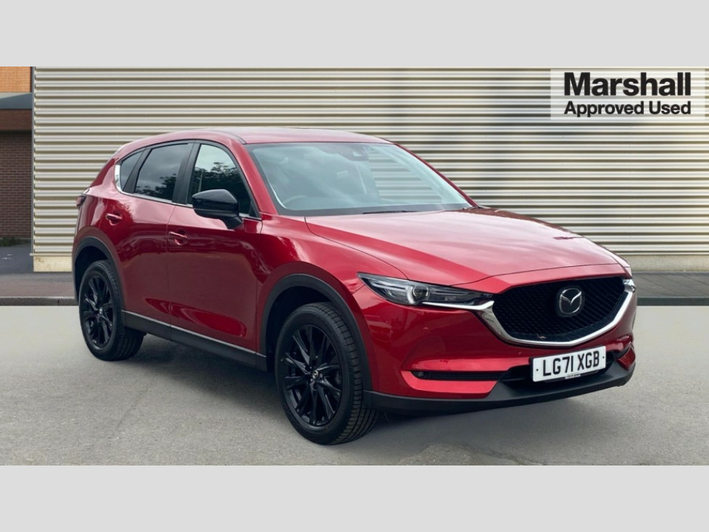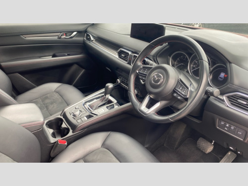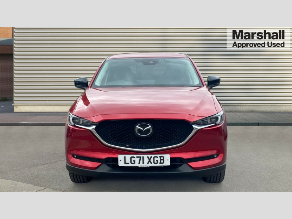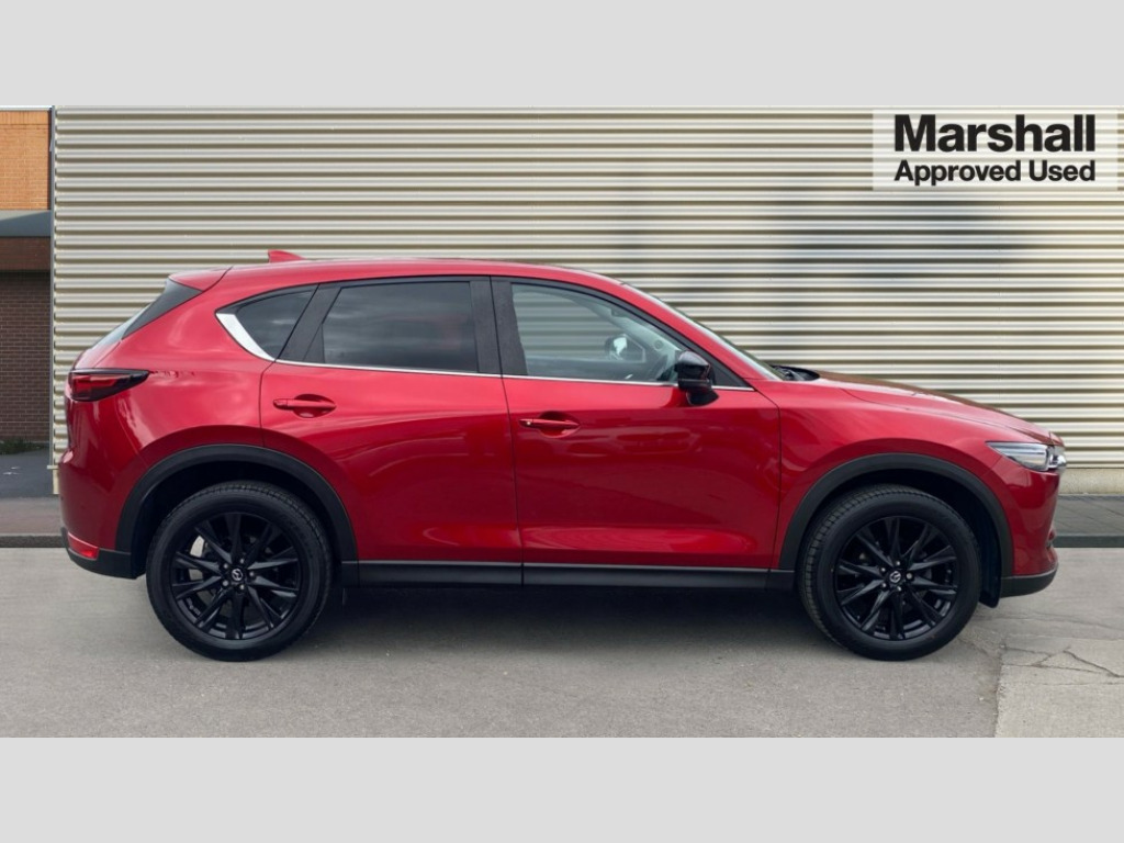 Mazda CX-5 2.0 Kuro Edition 5dr Auto 10.25" display with Mazda Connect infotainment, Apple car play/Android Auto, Blind spot monitoring with rear cross traffic alert, Bluetooth connectivity with voice control, Collision prevention assist, Connected services, Electric power steering, Emergency stop signalling system, Engine start/stop button, Forward collision warning, Front and rear parking sensors, Integrated navigation system, Intelligent speed assist, Lane departure warning system, Lane keep assist, Power lift gate, Radar cruise control with Stop and Go, Service indicator, TFT display screen, Traffic sign recognition, Trip computer, i-stop, 2 USB sockets in rear, 2x USB sockets in front, 6 speakers, AM/FM radio, Bluetooth audio streaming, DAB Digital radio, Multimedia Commander including separate volume dial, Steering wheel mounted audio controls, Adaptive front lighting system, Auto dimming rear view mirror, Black mirror caps, Body colour roof spoiler, Body coloured front bumper with black lower mouldings, Body coloured rear bumper with black lower mouldings, Coming/leaving home lighting function, Door mirror integrated indicators, Dual exhaust pipes, Dusk sensitive headlamps, Electric adjustable/heated/folding door mirrors, Electric front/rear windows/one touch facility, High beam assist, Intermittent rear wash/wipe, LED daytime running lights, LED front fog lights, LED Headlights, LED third brake light, Privacy glass, Rain sensing front wipers, Rear side wing doors, Scuff plates, Shark fin roof aerial, Signature LED rear combination lights, 2 cupholders, 3 grab handles with rear coat hook, 3 seat bench in 2nd row, 40:20:40 Karakuri fold-flat seat system, 6-way power adjustable driver seat, Driver seat lumbar adjustment, Driver/passenger front seatback pockets, Driver/passenger sunvisors + illuminated vanity mirrors (drivers with ticket holder), Dual zone climate control, Front and rear door pockets, Front centre armrest, Front centre console storage box, Heated front seats, Height adjustable head restraints, Height adjustable passenger seat, Humidity sensor, Illuminated glovebox, Interior dome light with integral spotlight, Interior incandescent lighting, ISOFIX child seat anchorage points attached on outer rear seats, Karakuri tonneau cover, Leather steering wheel/gearknob/handbrake grip, Leatherette/suede upholstery, LED interior illumination, Light roof lining, Luggage compartment lighting, Rear air vents, Rear centre armrest with 2 cupholders, Rear headrests, Rear power outlet, Rear seat recline, Single front passenger seat, Sunglasses holder, Tilt/height adjustable steering wheel, 3 point front seatbelts with pre-tensioners, 3 rear 3 point seatbelts, ABS, Advanced Smart City Brake Support - SCBS, Child locks on rear doors, DSTC-Dynamic Stability and Traction Control, Dual front airbags, Electronic brake force distribution, Electronic parking brake with auto hold, Front and rear curtain airbags, Front passenger airbag deactivation, Front side airbags, G-Vectoring control, Hill hold assist, Seatbelt reminder front and rear, Smart brake support with forward obstruction warning, Tyre pressure monitoring system, Automatic door locking when moving off, Deadlock, Immobiliser, Power door locks, Remote central locking, Thatcham Cat.1 alarm, Black dashboard and door decorative trim, 19" Black alloy wheels, Tyre repair kit