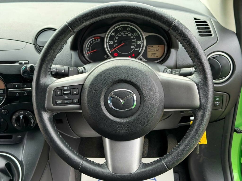 This 2013 Mazda2 Tamura is a great find, boasting a clear vehicle history check for your peace of mind. Under the bonnet, you'll find a responsive 1.3 litre petrol engine, paired with a Tamura trim that includes essential Air Conditioning to keep you comfortable on every journey.This Mazda2 is designed to be economical and affordable to run. It achieves an impressive fuel economy of 57 miles per gallon, which is better than many other cars in its class. Furthermore, its low insurance group and low CO2 emissions mean you can expect lower running costs, making it a sensible choice for many drivers. r conditioning, stereo radio/cd/usb/mp3, steering wheel - mounted remote audio controls, electric windows - front, tinted glass, door mirrors - electrically adjustable-heated-folding-body coloured, privacy glass to rear windows, remote central locking with 2 keys, computer (drivers information centre), 16in alloy wheels, seats - drivers height adjustment with head restraints - height adjustment, isofix with top tether anchor, seats - 60-40 split folding rear, three height adjustable rear head restraints, airbags - curtain front, airbags - driver, airbags - front passenger, anti lock braking system, bumpers - body coloured, eba - emergency brake assist, ebd - electronic brakeforce distribution, electronic power assisted steering, headlights - halogen, seats - drivers lift mechanism, side airbags, steering wheel - height adjustment, steering wheel - leather, temporary size spare wheel, thatcham category 1 alarm and immobiliser, £35 yearly road tax, sports styling kit, parrot hands-free bluetooth phone kit, cloth - black