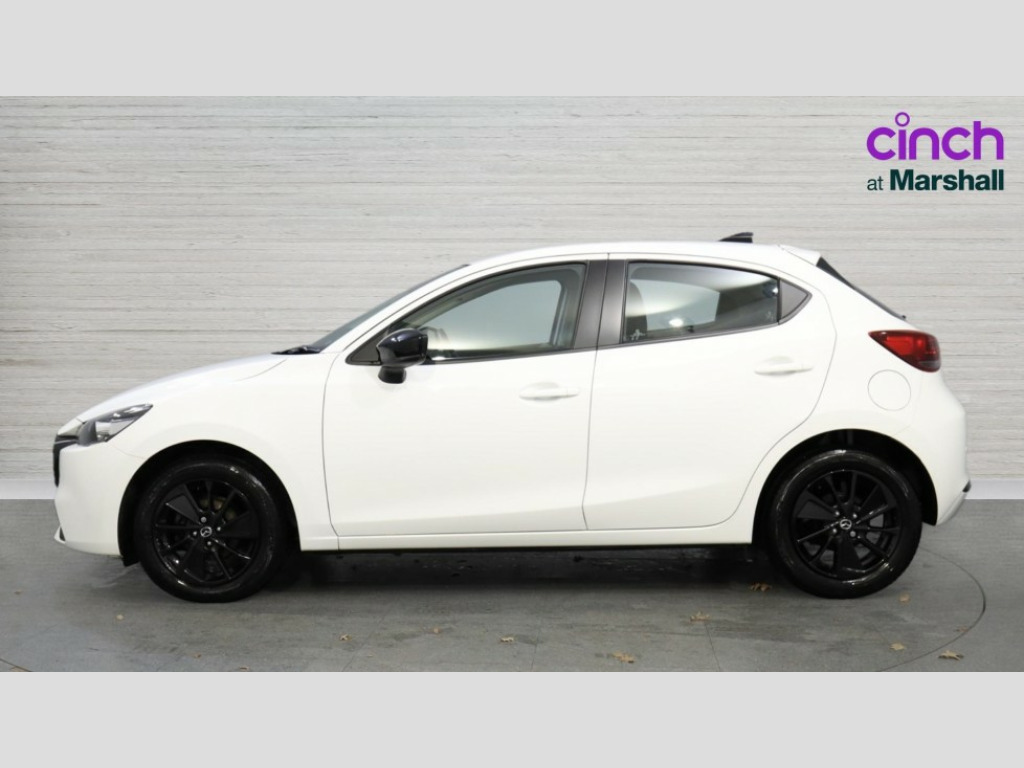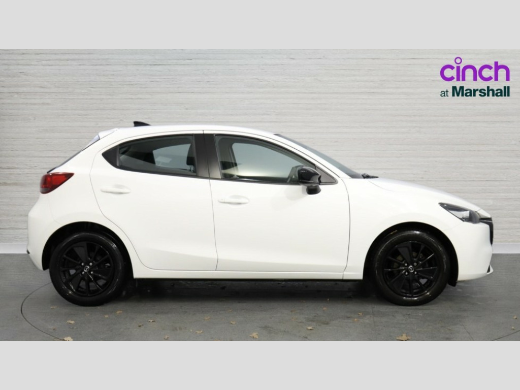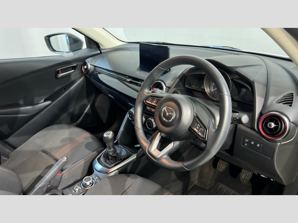 Mazda 2 1.5 e-Skyactiv G MHEV Homura 5dr Adjustable speed limiter, Analogue speed display meter, Cruise control, Digital instrument cluster, Digital rev counter, E-call, Emergency stop signalling system, Engine start/stop button, Integrated bluetooth, Lane departure warning system, Lane keep assist, Mazda connect with 8" colour touch screen, Navigation system, PAS, Rear parking sensor with audible and visual warning, Reversing camera, Service indicator, Tailgate, Trip computer, Wireless Apple CarPlay and wired Android Auto, i-stop, Mazda M hybrid, AM/FM/DAB radio with 6 speakers with USB and AUX inputs, Multimedia Commander including separate volume dial, Steering wheel mounted audio/bluetooth controls, Auto dimming rear view mirror, Auto headlight levelling, Black door mirrors, Black Shark-fin antenna, Body coloured front bumper with black lower bezel, Body coloured rear bumper with black lower mouldings and red accent, Coming/leaving home lighting function, Dusk sensing headlights, Electric adjustable/heated/folding door mirrors, Electric front/rear windows with one touch auto up/down for driver's window, Front honeycomb grill with red accent, Gloss black finish signature wing, Halogen daytime running lights, Heated rear window, LED Headlights, LED indicator lights, LED third brake light, Rain sensing front wipers with adjustable sensitivity and speed, Rear side wing doors, Rear wiper, 3 seat bench in 2nd row, 60/40 split rear seats, Black/red air vent accents, Climate control air conditioning, Driver, Front passenger and two rear grab handles with coathooks, Drivers seat manual slide recline and height adjustment, Drivers/front passengers covered vanity mirrors and drivers ticket holder, Front centre storage with two cupholders, Front head restraints, Front passenger and driver door pockets, Front passenger seat manual slide, recline and height adjust, Front passenger seatback pockets, Gear shift indicator, Glovebox, Interior courtesy light with integrated spotlight, ISOFIX child seat anchorage points attached on outer rear seats, Leather handbrake, Leather steering wheel and gear knob, Luggage compartment light, Premium cloth upholstery, Single front passenger seat, Three height adjustable rear head restraints, Tilt/telescopic adjustable steering wheel, 2x3 point front seatbelts with pre-tensioners, 3 point seatbelts on all rear seats, Anti-lock braking system (ABS), Collision mitigation braking system, Dynamic stability control + Traction control, ESP, Front and rear curtain airbags, Front driver, passenger and rear seat seatbelt warning, Front dual stage driver and single stage front passenger airbags, Front side airbags, Front smart city brake support, G-Vectoring control plus, Hill launch assist, Manual child lock in rear doors, Passenger airbag cut-off switch, Tyre pressure monitoring system, Deadlocking system, Power door locks, Remote central locking, Thatcham accredited alarm and immobiliser, Gloss black dashboard interior colour coordination, 16" Black metallic machined alloy wheels, Emergency tyre repair kit