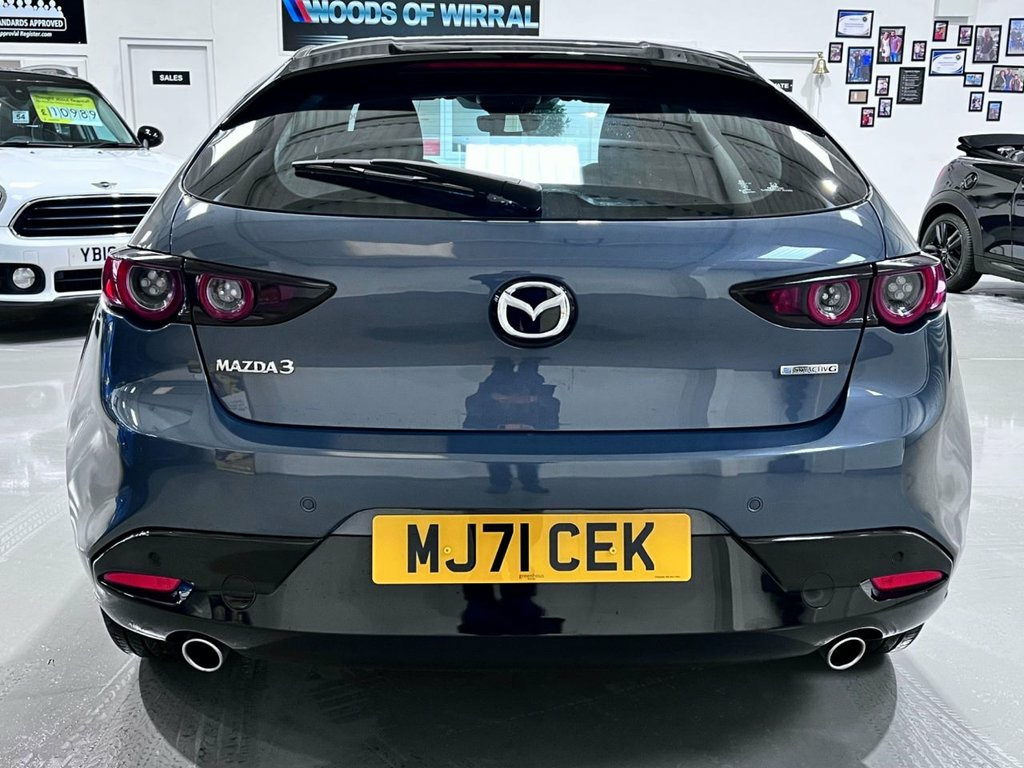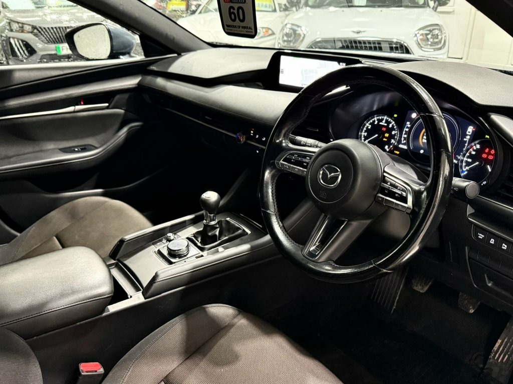 Woods of Wirral presents this 2021 Mazda3 e-SKYACTIV-G SE-L which is a superb example, having been owned by just one careful keeper. Complimented by a full Mazda main dealer service history ensuirng this vehicle has been maintained to the highest of standards. This stylish hatchback features a responsive 2.0 litre petrol engine, meeting Euro 6 emissions standards. The SE-L trim level comes equipped with a Head-Up Display, which projects key information onto the windscreen, and rear parking sensors to aid manoeuvring. For enhanced safety and awareness, it includes Blind Spot Monitoring with Rear Cross Traffic Alert, and automatic dusk sensing headlights. Connectivity is seamless with Apple CarPlay, Android Auto integration, Bluetooth handsfree and built in satelite navigation.... This Mazda3 offers an impressive fuel economy of 51 miles per gallon, making it an economical choice for your daily journeys. Its low insurance group rating further contributes to its affordability. The acceleration from 0 to 60 miles per hour in 10.4 seconds demonstrates a balanced performance that is both capable and efficient. These highlights collectively show how this Mazda3 provides a superior driving experience compared to other vehicles in its class. 8.8in TFT Colour Centre Display, Apple CarPlay and Android Auto, Mazda Navigation System, Integrated Bluetooth, Rear Parking Sensors, 16in Alloy Wheels - Silver, High Beam Control, Lane Keep Assist with Lane Departure War, AM-FM-DAB Radio with 8 Speakers, Blind Spot Monitoring with Rear Cross Tr, 7in Colour TFT Display, 12V Electrical Power Outlet, 2 USB Charging Ports, ABS - Anti Lock Braking System, Air Conditioning - Manual, Airbags - Front Dual Stage Driver and Si, B-Pillar Garnish - Satin Black, Bumper - Front Body Coloured with Black , Bumper - Rear Colour Coded with Gloss Bl, Colour Active Driving Display - Colour H, Door Mirrors - Electrically Adjustable-H, Door Pockets - Driver - Fr