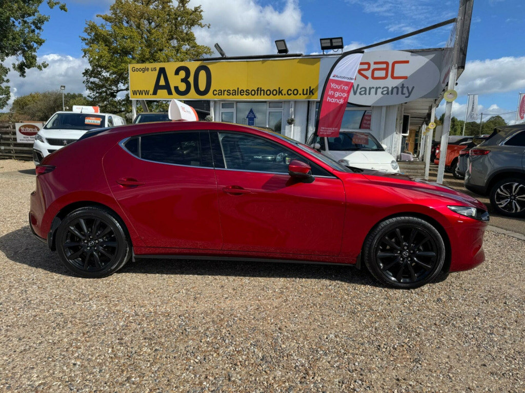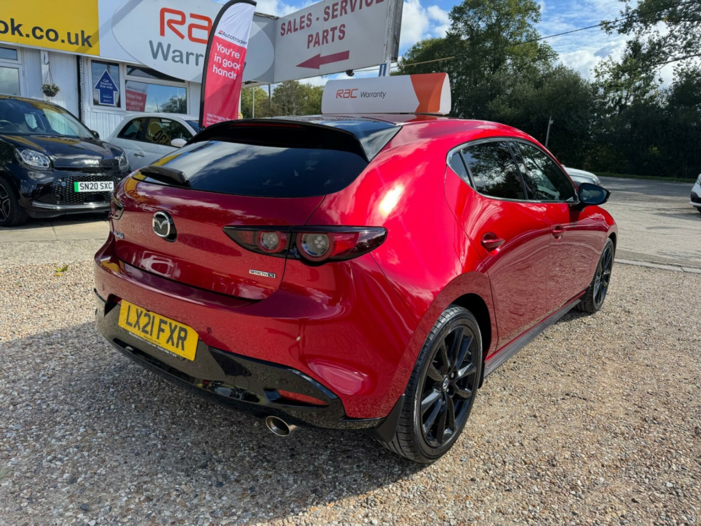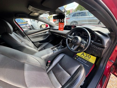This 2021 Mazda3 e-SKYACTIV-X GT Sport Tech boasts a clear vehicle history, offering you peace of mind.  Powered by a 2.0L petrol engine and meeting Euro 6 emission standards, this model combines efficiency with performance.  Inside, you'll find a wealth of technology and comfort, including LED headlights with auto levelling and dusk sensing, a colour active driving display for a clear view of essential information, and a premium Bose surround sound system with 12 speakers for an immersive audio experience.  The heated steering wheel ensures comfort on colder journeys.The Mazda3 GT Sport Tech is designed to impress, with its impressive 0-62mph acceleration in just 8.5 seconds showcasing its dynamic capabilities. This acceleration figure indicates a more responsive driving experience compared to many vehicles in its class. Furthermore, the generous boot space provides ample room for luggage or shopping, making it a practical choice for everyday use and longer trips alike.. 18in Alloy Wheels - Black Metallic, 360 Degree View Monitor, 7in Colour TFT Display, 8.8in TFT Colour Centre Display, ABS - Anti Lock Braking System, AM-FM-DAB Radio-MP3 Featuring 12 Speaker Bose Surround Sound System, Apple CarPlay and Android Auto, Blind Spot Monitoring with Rear Cross Traffic Alert, Bumper - Front Body Coloured with Black Lower Bezel, Bumper - Rear Gloss Black Lower Moulding, Chrome Interior Trim Accents - Steering Wheel Centre Bezel - Surround Start-Stop and Glove Box Handle, Colour Active Driving Display - Colour Head-Up Display, Cruising Traffic Support - CTS, DSC - Dynamic Stability Control, Daytime Running Lights, Door Mirrors - Electrically Adjustable-Heated-Auto Power-Folding, Door Mirrors with Adjustable Memory and Tilt-Down Function when Reversing, Door Mirrors with Auto Dimming Function, Door Pockets - Driver - Front Passenger and Rear, Door Trim - Vinyl Leather, Driver Attention Alert - DAA, Driver Monitor, Drivers Seat - Power Slide - Recline - Height and Lumbar Adjustment with Head Up Display and Mirror Memory, Dual Front Airbags, Dual-Zone Climate Control Air Conditioning, Electric Power Assisted Steering - EPAS, Electric Windows - Front and Rear with One-Touch Auto Down - Up, Electrical Power Outlet, Electronic Parking Brake with Auto-Disengage Function - Auto-Hold Function, Emergency Stop Signalling System - ESS, Emergency Tyre Repair Kit, Engine Start-Stop Button, Frameless Auto Dimming Rear View Mirror, Front Cross Traffic Alert - FCTA, Front Knee Airbag for Driver, Front Passenger Airbag Cut-Off Switch, Front Side Airbags, Front and Rear Curtain Airbags, Front and Rear Smart City Brake Support, G-Vectoring Control Plus - GVC Plus, Gear Shift - Leather-Wrapped, Glovebox with Light, Grab Handles - Front Passenger and Two Rear with Coat Hooks, Grille - Dark Metallic Finish Signature Wing, Grille - Gloss Black Finish, Headlights - Adaptive LED, Headlights - Coming-Leaving Home, Headlights - Dusk-Sensing Lights, Headlights - LED with Auto Headlight Levelling, High Beam Control, Hill Launch Assist - HLA, ISOFIX Child Seat Anchorage for Outer Rear Seats, Integrated Bluetooth, Intelligent Speed Assist, Interior LED Lighting, Lane Keep Assist with Lane Departure Warning System, Luggage Compartment - Light, Luggage Compartment - Power Outlet, Mazda Radar Cruise Control, Multimedia Commander, Parking Sensors - Front and Rear, Privacy Glass - Rear and Rear Side Windows, Rain-Sensing Front Wipers, Rear Fog Light, Rear Roof Spoiler - Gloss Black, Rear Seats - Folding Centre Armrest Equipped with Two Cup Holders, Remote Central Locking with Deadlocking and Automatic Door Lock when Driving, Roof Mounted Sunglasses Holder, Satellite Navigation System, Seatback Pocket - Passenger Side, Seatbelt Reminder Audible Warning - Driver-Passenger and Rear Seat, Seatbelts - Front - 3 Point - ELR x 2 with Pre-Tensioners, Seatbelts - Rear - 3-Point - ELR, Seats - 60-40 Split Folding Rear, Seats - Front Passenger Manual Slide - Recline and Height Adjustment, Signature LED Lights, Signature LED Rear Combination Lights with LED Rear Turn Lights, Smart Brake Support - Rear Crossing, Smart Keyless Entry, Steering Wheel - Heated, Steering Wheel - Leather Wrapped, Steering Wheel - Mounted Audio and Bluetooth Controls, Steering Wheel - Paddle Shift, Steering Wheel - Tilt and Height Adjustment, Storage Spaces - Front Centre Console with Two Cupholders, Sunvisors - Drivers and Passengers with Covered Vanity Mirror-Ticket Holder, TCS - Traction Control System, Thatcham Accredited Alarm and Immobiliser, Three Height Adjustable Rear Head Restraints, Trip Computer, Tyre Pressure Monitoring System, USB Charging Port, Wipers - Rear Adjustable Speed with Intermittent, e-Call with GPS, Leather - Black. Full service history