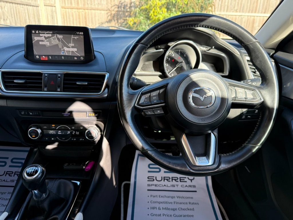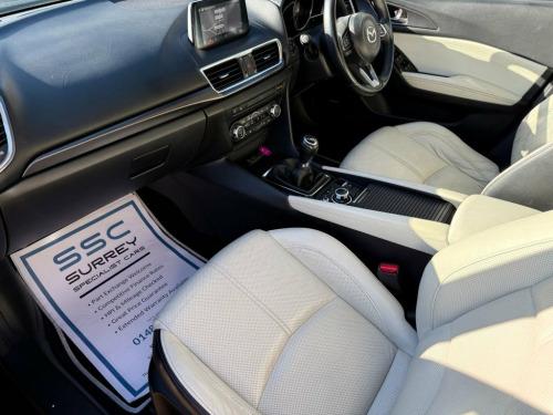 Surrey Specialist Cars are proud to present our lovely Mazda 3 Sport. This amazing car comes with Full Service History from the Main Dealer, finished in stunning metallic black with full leather seats. The car has a Long MOT until October 2026 so it is ready to go. The 2L Petrol engine offers superb economy at over 56 MPG on combined cycle. Features Include Multifunction Steering Wheel, Trip Computer, Satellite Navigation, Heated Seats, Parking Camera, Head Up Display, Cruise Control, Speed Limiter, Stereo/Phone Control, FM Radio, Bluetooth Audio, two USB Inputs, Parking Sensors, Dual Zone Climate Control, Heated Rear and Front Screen, CD Player, 6 Speed Manual Gearbox, 18 Inch Alloy Wheels and two Remote Control Keys to name a few. 18in Alloy Wheels, 7in Colour Touch-screen Display, AM-FM-DAB Radio - Single CD Player-MP3 w, Adjustable Speed Limiter, Aha App and Stitcher App Integration, Anti-lock Braking System with Electronic, Armrest - Front Centre with Slide Functi, Auto Dimming Rear View Mirror, Auxiliary - AUX - and Two USB Input, Cruise Control with Manual Speed Adjustm, Dashboard Panel - Silver, Digital Speedometer, Dome Interior Courtesy Light with Integr, Door Mirrors - Electrically Adjustable -, Driver and Front Passenger Airbags, Dual Chrome Exhaust Tailpipe, Dual-Zone Climate Control Air Conditioni, Dynamic Stability Control with Traction , Electric Power Assisted Steering - EPAS, Electric Windows - Front a