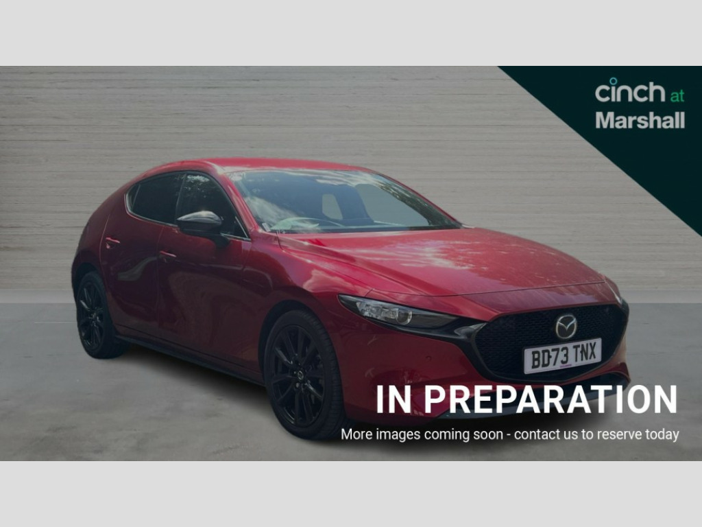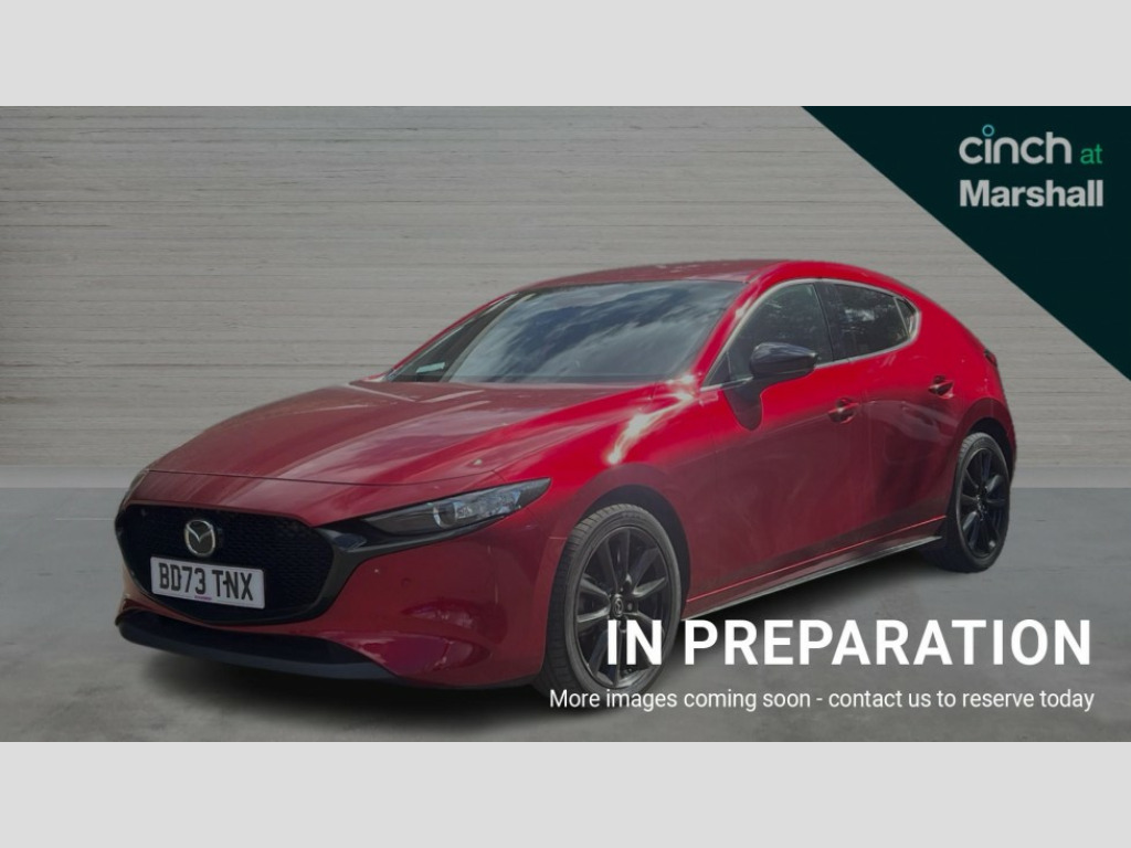 Mazda 3 2.0 e-Skyactiv G MHEV Homura 5dr 10.25" display with Mazda Connect infotainment, 7" colour TFT display, Audio transfer from bluetooth devices, Blind spot monitoring with rear cross traffic alert, Colour active driving display inc Windscreen projected,Traffic Sign Recognition, turn-by- turn navigation and Mazda Radar Cruise Control information, Digital instrument cluster, Driver attention alert system, E-call with GPS, Emergency stop signalling system, Engine start/stop button, Front and rear parking sensor with audible and visual warning, Head up Display, Integrated bluetooth with steering wheel mounted controls, Intelligent speed assist, Lane keep assist system (LAS) with Lane departure warning system (LDWS), Mazda connected services, Mazda Navigation System with european mapping, Mazda Radar Cruise Control, Mobile App interface, Multimedia Commander, PAS, Reversing camera, Service indicator, Tailgate, Traffic sign recognition (TSR), Trip computer, Wireless Apple CarPlay/Android Auto, Wireless charging, Cylinder Deactivation, i-stop, 2 USB-C ports in the front, Mazda Multimedia System with AM / FM / DAB radio with 8 speakers, Auto dimming rear view mirror, B-pillar garnish in piano black, Black door mirrors, Coming/leaving home lighting function, Dark metallic finish signature wing, Daytime running lights, Dual chrome tailpipes tip, Dusk sensing headlights, Electric front/rear windows with one touch/auto up/down, Electrically adjustable, heated auto power folding door mirrors, Front body coloured bumper with black lower bezel, Front kodo turn signal, Gloss black finish front grille, Gloss black rear roof spoiler, High beam control, LED front fog lights, LED headlamps with auto levelling, LED indicator lights, LED rear combination lights, LED third brake light, Privacy glass with dark tinting on rear side windows and rear window, Rain sensing front wipers with adjustable sensitivity and speed, Rear colour coded bumper with gloss black lower moulding, Rear fog lights, Rear side wing doors, Speed adjustable rear wash wiper with intermittent wipe, 12v electrical power outlet, 3 seat bench in 2nd row, 60/40 split fold down rear seats, Black with red stiching steering wheel, gearshift gaitor, dashboard panel, armrest, Cloth upholstery, Dark cloth door panel inserts, Dark roof headlining, ceiling and pillars, Driver seat manual slide, recline, height and seat tilt adjust, Driver, front passenger and two rear door pockets, Driver, Front passenger and two rear grab handles with coathooks, Driver/passenger sunvisors + vanity mirrors (drivers side with ticket holder), Dual zone climate control air conditioning, Folding rear centre armrest with two cup holders, Front and rear courtesy lamps, Front armrest, Front centre storage with two cupholders, Front head restraints, Front passenger seatback pocket, Front passengers seat manual slide, recline and height adjustment, Gear shift indicator, Heated front seats with 3 stage setting, Illuminated glovebox, Interior colouration dashboard and doorcards in black with dark stitching, ISOFIX child seat anchorage points attached on outer rear seats, Leather wrapped gear shift knob, Leather wrapped steering wheel, LED interior light, LED light in luggage compartment, Power outlet in luggage compartment, Roof mounted sunglasses holder, Single front passenger seat, Three height adjustable rear head restraints, Tilt/height adjustable steering wheel, 3 point ELR front seatbelts with pretensioners, 3 rear 3 point seatbelts with ELR, Anti-lock braking system (ABS), Drivers knee airbag, DSC - Dynamic Stability Control, Dual stage driver and single stage passenger airbags, EBD - Electronic brakeforce distribution, Electronic parking brake with auto disengage function and auto hold function, Front and rear curtain airbags, Front passenger airbag cut-off switch, Front side airbags, Front smart city brake support, G-Vectoring control plus, Hill launch assist, Intelligent Traction Control system, Manual child lock in rear doors, Mild Hybrid system with regenerative braking, Seatbelt reminder for driver/front passenger and rear seats, Tyre pressure monitoring system (TPMS), Auto door lock when driving, Remote central locking + deadlocks, Smart keyless entry, Thatcham accredited alarm and immobiliser, 18" Black alloy wheels, Emergency tyre repair kit
