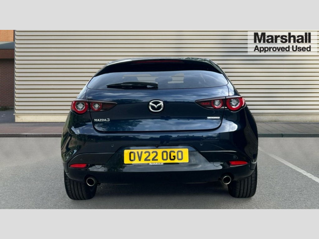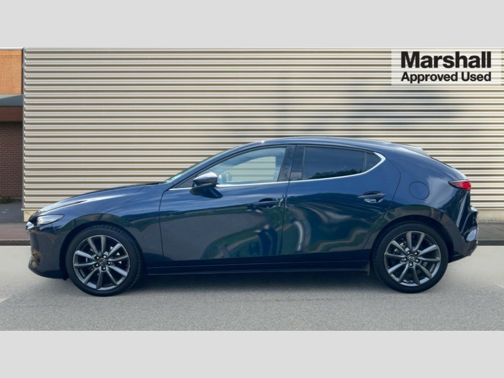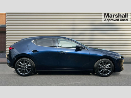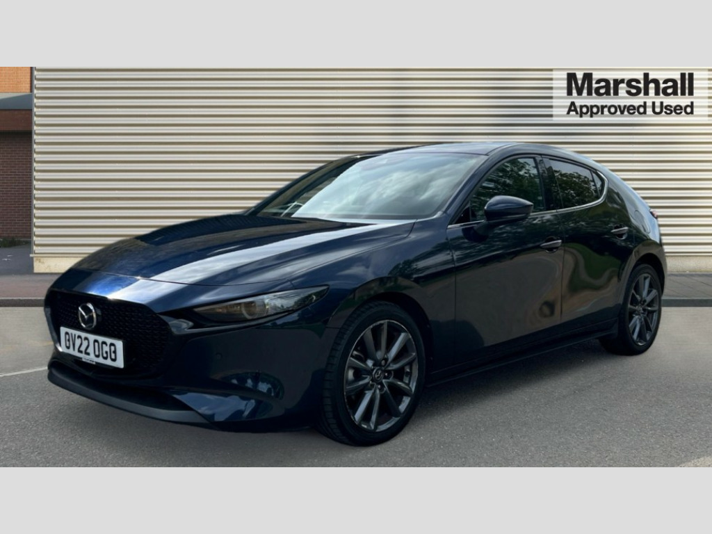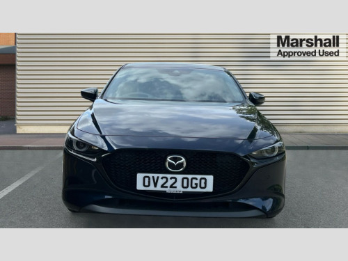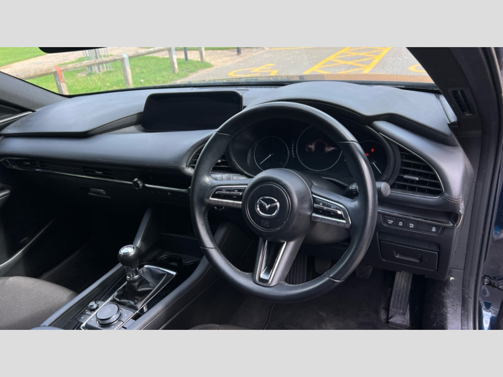 Mazda 3 2.0 e-Skyactiv G MHEV Sport Lux 5dr 7" colour TFT display, 8.8" Colour centre touch screen display with Mazda Connect infotainment, Apple car play/Android Auto, Audio transfer from bluetooth devices, Blind spot monitoring with rear cross traffic alert, Colour active driving display inc Windscreen projected,Traffic Sign Recognition, turn-by- turn navigation and Mazda Radar Cruise Control information, Digital instrument cluster, Driver attention alert system, E-call with GPS, Emergency stop signalling system, Engine start/stop button, Front and rear parking sensor with audible and visual warning, Head up Display, Integrated bluetooth with steering wheel mounted controls, Intelligent speed assist, Lane keep assist system (LAS) with Lane departure warning system (LDWS), Mazda connected services, Mazda Navigation System with european mapping, Mazda Radar Cruise Control, Mobile App interface, Multimedia Commander, PAS, Reversing camera, Service indicator, Tailgate, Traffic sign recognition (TSR), Trip computer, Cylinder Deactivation, i-stop, Mazda Multimedia System with AM / FM / DAB radio with 8 speakers, Adaptive LED Headlights, Auto dimming driver's door mirrors, B-pillar garnish in piano black, Body coloured, electrically adjustable, heated auto power folding door mirrors with integrated indicators, Coming/leaving home lighting function, Dark metallic finish signature wing, Dual chrome tailpipes tip, Dusk sensing headlights, Electric front/rear windows with one touch/auto up/down, Frameless auto dimming interior rear view mirror, Front body coloured bumper with black lower bezel, Front kodo turn signal, Gloss black finish front grille, Gloss black rear roof spoiler, LED indicator lights, LED third brake light, Privacy glass with dark tinting on rear side windows and rear window, Rain sensing front wipers with adjustable sensitivity and speed, Rear colour coded bumper with gloss black lower moulding, Rear fog lights, Rear side wing doors, Signature LED daytime running lights, Signature LED rear combination lights, Speed adjustable rear wash wiper with intermittent wipe, 12v electrical power outlet, 3 seat bench in 2nd row, 60/40 split fold down rear seats, Black cloth door panel inserts, Chrome interior trim accents with steering wheel centre bezel, surround of engine start / stop button and glove box handle, Cloth upholstery, Dark roof headlining, ceiling and pillars, Driver, front passenger and two rear door pockets, Driver, Front passenger and two rear grab handles with coathooks, Driver/passenger sunvisors + vanity mirrors (drivers side with ticket holder), Drivers seat manual slide recline and height adjustment, Dual zone climate control air conditioning, Folding rear centre armrest with two cup holders, Front and rear courtesy lamps, Front armrest, Front centre storage with two cupholders, Front head restraints, Front passenger seatback pocket, Front passengers seat manual slide, recline and height adjustment, Gear shift indicator, Heated front seats with 3 stage setting, Illuminated glovebox, Interior colouration dashboard and doorcards in black with dark stitching, ISOFIX child seat anchorage points attached on outer rear seats, Leather wrapped gear shift knob, Leather wrapped steering wheel, LED interior light, Luggage compartment light, Power outlet in luggage compartment, Roof mounted sunglasses holder, Single front passenger seat, Three height adjustable rear head restraints, Tilt/height adjustable steering wheel, USB input, 3 point ELR front seatbelts with pretensioners, 3 rear 3 point seatbelts with ELR, Anti-lock braking system (ABS), Drivers knee airbag, DSC - Dynamic Stability Control, Dual stage driver and single stage passenger airbags, EBD - Electronic brakeforce distribution, Electronic parking brake with auto disengage function and auto hold function, Front and rear curtain airbags, Front passenger airbag cut-off switch, Front side airbags, Front smart city brake support, G-Vectoring control plus, Hill launch assist, Intelligent Traction Control system, Manual child lock in rear doors, Mild Hybrid system with regenerative braking, Seatbelt reminder for driver/front passenger and rear seats, Tyre pressure monitoring system (TPMS), Auto door lock when driving, Remote central locking + deadlocks, Smart keyless entry, Thatcham accredited alarm and immobiliser, 18" Grey alloy wheels, Emergency tyre repair kit
