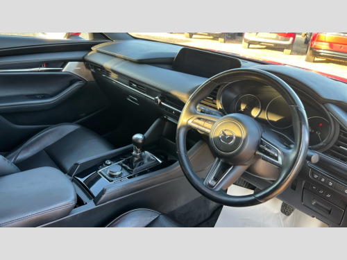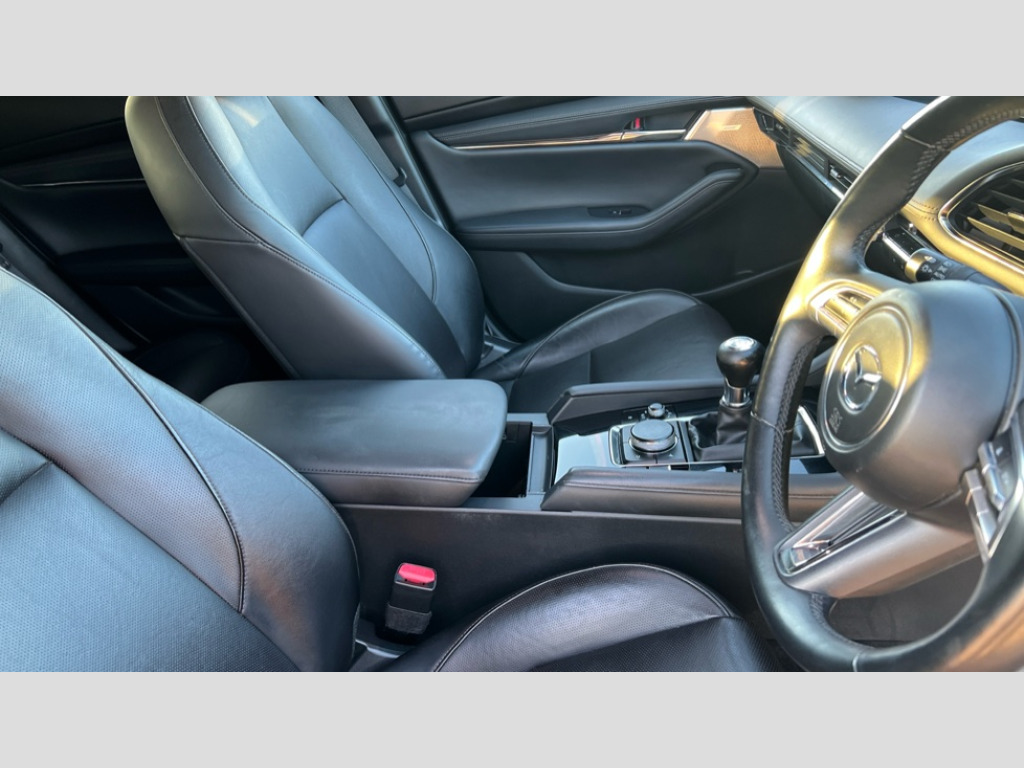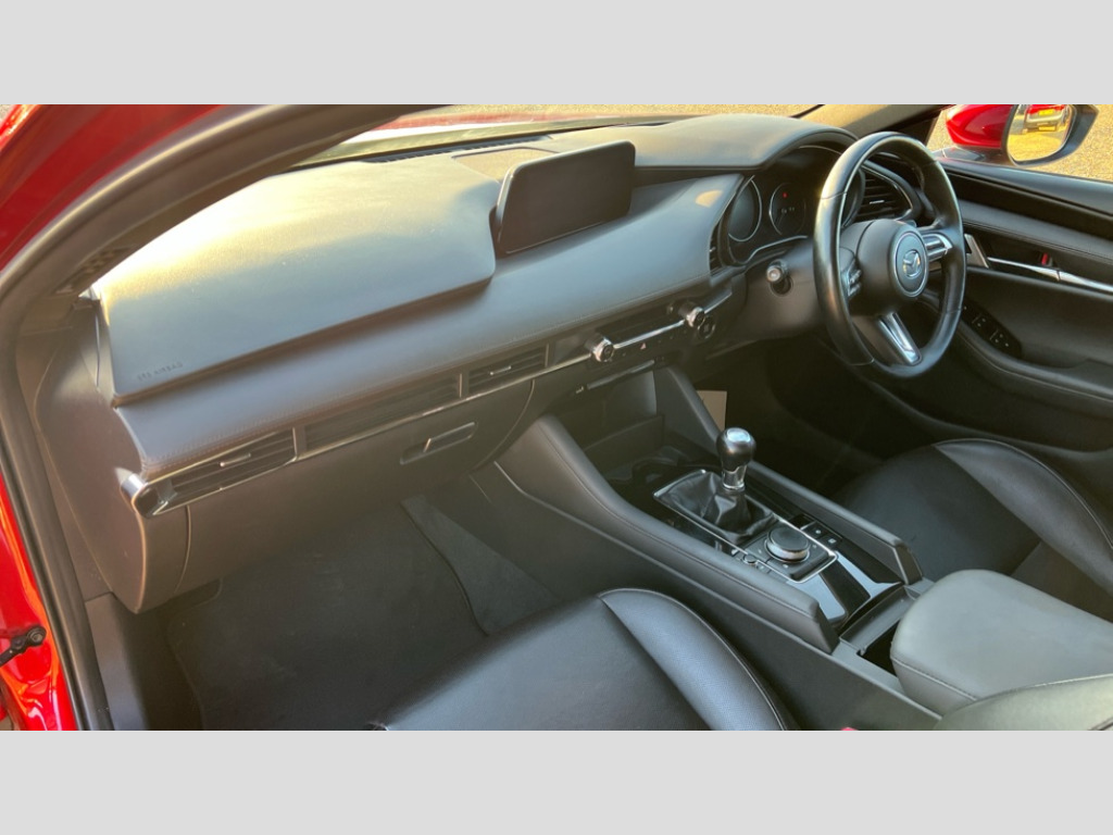 Mazda 3 2.0 Skyactiv G MHEV GT Sport 5dr 7" colour TFT display, 8.8" Colour centre touch screen display with Mazda Connect infotainment, Apple car play/Android Auto, Audio transfer from bluetooth devices, Blind spot monitoring with rear cross traffic alert, Colour active driving display inc Windscreen projected,Traffic Sign Recognition, turn-by- turn navigation and Mazda Radar Cruise Control information, Digital instrument cluster, Driver attention alert system, E-call with GPS, Emergency stop signalling system, Engine start/stop button, Front and rear parking sensors, Head up Display, Integrated bluetooth with steering wheel mounted controls, Intelligent speed assist, Lane keep assist system (LAS) with Lane departure warning system (LDWS), Mazda Navigation System with european mapping, Mazda Radar Cruise Control, Mobile App interface, Multimedia Commander, PAS, Reversing camera, Service indicator, Start/stop button chrome surround, Trip computer, Auxiliary input socket, Mazda Multimedia System with AM / FM / DAB radio, single CD / MP3 with 12 Speaker Bose sound system, bose centerpoint, bassmatch+audiopilot technology, Adaptive LED Headlights, Auto dimming door mirrors, Coming/leaving home lighting function, Dark metallic finish signature wing, Daytime running lights, Door mirrors with adjustable memory and tilt-down function when reversing, Dusk sensing headlights, Electric front/rear windows with one touch/auto up/down, Electrically adjustable/heated/auto power folding door mirrors with integrated indicators, Frameless auto dimming interior rear view mirror, Front body coloured bumper with black/bright lower bezel, Gloss black mesh grille, Gloss black rear roof spoiler, High beam assist, LED headlamps with auto levelling, LED indicator lights, LED third brake light, Piano black window garnish, Privacy glass with dark tinting on rear side windows and rear window, Rain sensing front wipers, Rear fog lights, Rear gloss black lower moulding, Signature LED lights, Signature LED rear combination lights with LED rear turn lights, Speed adjustable rear wash wiper with intermittent wipe, 60/40 split fold down rear seats, Chrome centre bezel steering wheel, Chrome-plated glovebox handle, Driver, Front passenger and two rear grab handles with coathooks, Driver/passenger sunvisors + vanity mirrors (drivers side with ticket holder), Dual zone climate control air conditioning, Electrical power outlet, Folding rear centre armrest with two cup holders, Front and rear courtesy lamps, Front armrest, Front centre console with storage box with tray, lid + 2 cupholders, Front head restraints, Front passengers seat manual slide, recline and height adjustment, Gear shift indicator, Heated steering wheel, Illuminated glovebox, ISOFIX child seat anchorage points attached on outer rear seats, Leather wrapped gear shift knob, Leather wrapped steering wheel, Leather/vinyl upholstery + front heated with 3 stage setting, LED interior light, Luggage compartment light, Power driver lumbar adjustment, Reach adjustable steering wheel, Storage - glovebox, driver and front passenger door pockets and roof mounted sunglasses holder, Three height adjustable rear head restraints, Tilt/height adjustable steering wheel, USB charging point, 3 point ELR front seatbelts with pretensioners, 3 rear 3 point seatbelts with ELR, Anti-lock braking system (ABS), Collision mitigation braking system, Drivers knee airbag, DSC - Dynamic Stability Control, Dual front airbags, EBD - Electronic brakeforce distribution, Electronic parking brake with auto disengage function and auto hold function, ESP, Front and rear curtain airbags, Front passenger airbag cut-off switch, Front side airbags, Front smart city brake support, G-Vectoring control plus, Hill launch assist, Intelligent Traction Control system, Mild Hybrid system with regenerative braking, Seatbelt reminder for driver/front passenger and rear seats, Tyre pressure monitoring system (TPMS), Auto door lock when driving, Remote central locking + deadlocks, Smart Keyless entry and start, Thatcham accredited alarm and immobiliser, 18" Grey metallic alloy wheels, Emergency tyre repair kit