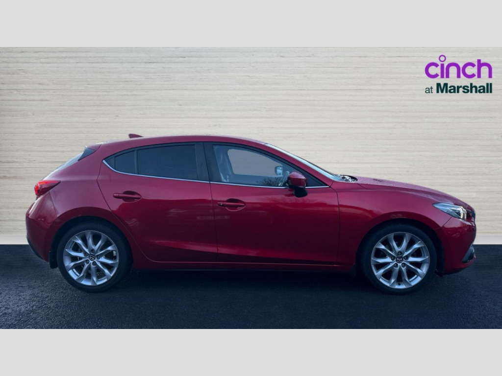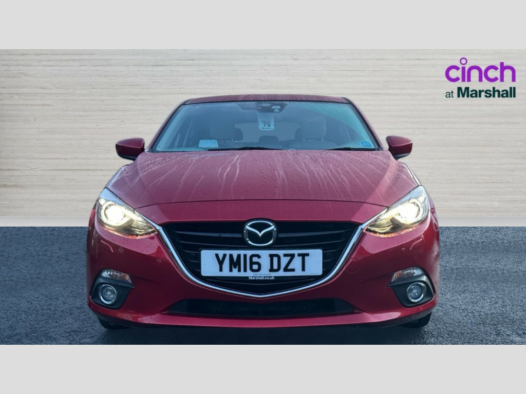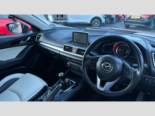 Mazda 3 2.0 Sport Nav 5dr 'Lights On' Reminder warning buzzer, 7" touch screen, Bluetooth system, Colour satellite navigation, Cruise control, Digital clock, Digital exterior temperature gauge, Electric hydraulic power assisted steering, Emergency stop signalling system, Front and rear parking sensors, Head up Display, Mobile App interface, Multi function display, Remote fuel cap release, Reversing camera, Service indicator, Tachometer, Trip computer, Dynamic stability control, 9 speakers, Auxiliary input socket, Bose Premium Audio system, DAB Digital radio, Single play CD/radio with MP3 compatability, Steering wheel audio controls, USB/iPod connection, 2 speed rear wiper, 3 speed front intermittent wipe and electric wash, Adaptive front lighting system, Auto dimming interior mirror, Automatic coming/leaving home lighting function, Bi-Xenon headlamp with auto levelling + Headlamp Wash, Body colour door handles, Body colour electric adjustable heated door mirrors with integral indicators, Body colour roof spoiler, Body colour side mouldings, Body coloured bumpers, Dual exhaust pipes, Dusk sensitive headlamps, Electric folding door mirrors, Electric front/rear windows, Electric heated rear glass window, Front fog lights, LED daytime running lights, LED rear lights, Privacy glass, Rain and light sensors, Shark fin roof aerial, 5 headrests, 60/40 split rear seat back, Auxilliary 12V power socket, Cigar lighter, Cloth upholstery, Cupholders - 2 in rear centre armrest, Driver seat lumbar adjustment, Driver's seat height adjustment, Driver's vanity mirror with cover/ticket holder, Dual zone climate control, Front centre console with storage box with tray, lid + 2 cupholders, Front door pockets, Front grab handles, Heated front seats, Illuminated ashtray, Illuminated glovebox, Illuminated vanity mirrors, Instrument panel light dimmer, Interior courtesy light, Isofix child seat attachment, Leather gearknob, Leather handbrake, Leather wrapped steering wheel, Luggage compartment lighting, Passenger seat back pocket, Passenger seat height adjuster, Passenger sunvisor with vanity mirror, Pollen filter, Rear centre armrest, Rear grab handles with coathooks, Silver interior door handles, Sunglasses holder, Tilt/telescopic adjustable steering wheel, Welcome mode lighting, 3 point ELR front seatbelts with pretensioners, 3 rear 3 point seatbelts with ELR, ABS+Electronic Brake force Distribution, Active Traction Control (TRC), Crash sensor, Driver and passenger airbags, Emergency brake assist, Front and rear curtain airbags, Front side airbags, Hill hold assist, Passenger airbag deactivate switch, Seatbelt reminder front and rear, Smart City Brake Support - SCBS, Tyre pressure monitoring system, Deadlocking system, Immobiliser, Keyless start, Remote central door locking, Smart entry, Thatcham Cat.1 alarm, Silver interior trim, 18" Alloy wheels, Tyre repair kit