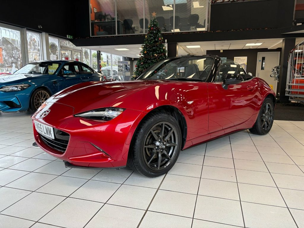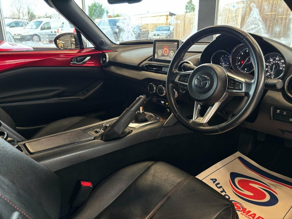 This Mazda MX-5 is a superb example and one that is a true credit to its previous owner who has taken great care over it. Presented within a very clean condition inside and out and as you would expect this car drives spot on with everything working just as it should. This is reinforced by holding a FULL Mazda and independent service history recorded across the following miles: 4456 + 7725 + 11,149 + 14,578 + 17,410 + 19,691 + 21,581 + 22,773 + 24,437. Among its impressive service history, this Mazda MX-5 comes with some great features. Features include: Aha App and Stitcher App Integration, Air Conditioning - Automatic Climate Control, Bluetooth Audio Streaming, Cruise Control, DAB Radio, Engine Start-Stop Button, Integrated Bluetooth System, Lane Departure Warning System, Premium BOSE Surround Sound System, Seats - Front Heated, Smart Keyless Entry, Tyre Pressure Monitoring System, Voice Control for Phone and more. It comes complete with two keys, an 82-point health check, a 6-month warranty (extendable up to 3 years) and HPI clear certificate. As these are used cars, please ensure that a vehicle has a specific feature that is important to you before purchasing by speaking directly with one of our sales team members. For Hi-Def photo's please view this car on our website. Please note that we also use AI-generated first images, so the first image may not be a true representation of the car. If you haven't already, please drop us a follow on our social media pages. @ Leather - Black with Red Stitching, Soul Red, 12V Power Socket - Front, 16in Alloy Wheels - Gunmetal, 7in Colour Touch Screen Display, ABS - Anti Lock Braking System, AUX Socket, Adjustable Speed Limiter, Aha App and Stitcher App Integration, Air Conditioning - Automatic Climate Con, Airbags - Driver, Airbags - Front Passenger, Airbags - Front Passenger Deactivation S, Auto Dimming Rear View Mirror, Bluetooth Audio Streaming, Cruise Control, Cupholder - Front x2, DAB Radio, DHS - Deployable Hood System, DSC - Dynamic Stability Control, Dashboard Panel - Black Vinyl Leather, Deadlocking, Dusk Sensing Automatic Headlights, Electric Windows - Front, Electrically Adjustable-Heated Door Mirr, Ele