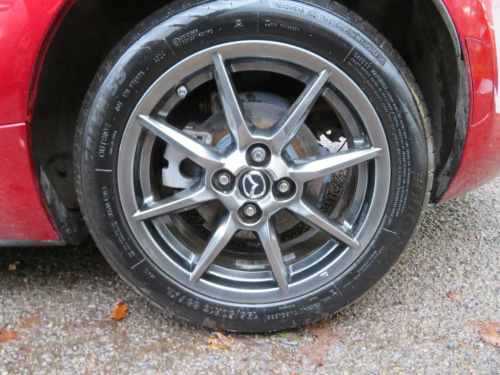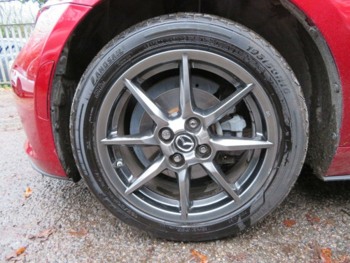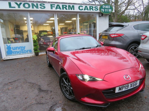 Mazda MX-5 RF's fastback styling seamlessly merges the comfort and security of a hardtop with the unmatched driving thrill of the iconic MX-5 open-top experience. The sculpted lines of it's Kodo design elegantly transform the hardtop, allowing it to convert into an open-topped roadster in just 13 seconds without sacrificing any additional boot space! With less than 25,000 miles on the clock and with a full Mazda main dealer service history up until 2024 (5 x service records), this stunning example comes with our Lyons Farm Cars promise of a 100+ detailed inspection as well as a fresh service and sold with a new 12 month MOT with no advisories. The Sport Nav+ is an excellent trim level which boasts; Full Leather Heated Seats, 16" Alloy Wheels, Dual Exhaust System, 7in Colour Touch Screen Display with Satellite Navigation System & DAB Radio, Rear Parking Sensors with Optical Display, Smart Keyless Entry, Automatic Climate Control, Automatic Wipers, Dusk Sensing Automatic LED Headlights with Auto Levelling Adaptive Front Lighting System, LED Daytime Running Lights, Lane Departure Warning System, Dynamic Stability Control (DSC) with Traction Control System (TCS), Four-Wheel Anti-Lock Braking System (4W-ABS) with Electronic Brake-Force Distribution (EBD), Front and Rear Smart City Brake Support, Cruise Control & Bluetooth. 2019 Mazda MX-5 RF 1.5 SKYACTIV-G Sport Nav+ 2 Door Convertible finished in Soul Red Metallic. ---------- 16in Alloy Wheels - Bright, 3-Stage Seat Heaters, 7in Colour Touch Screen Display, Adjustable Speed Limiter, Aha App and Stitcher App Integration, Air Conditioning - Climate Control, Air Conditioning Dials - Satin Chrome, Air Vent Surrounds - Satin Chrome, Analogue Speedometer, Audio Transfer from Bluetooth Devices, Auto Dimming Rear View Mirror, Automatic Passenger Airbag Deactivation , Auxiliary - AUX - and Two USB Input, Body Coloured Door Mirrors, Chrome Meter Rings, Coinbox, Cruise Control with Manual Speed Adjustm, Cupholder - Front x2, DHS - Deployable Hood System, Door Mirrors - Power Operated and Heated, Double Pinion Electric Power Assisted St, Driver and Passenger Front Airbags, D