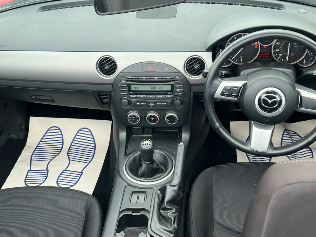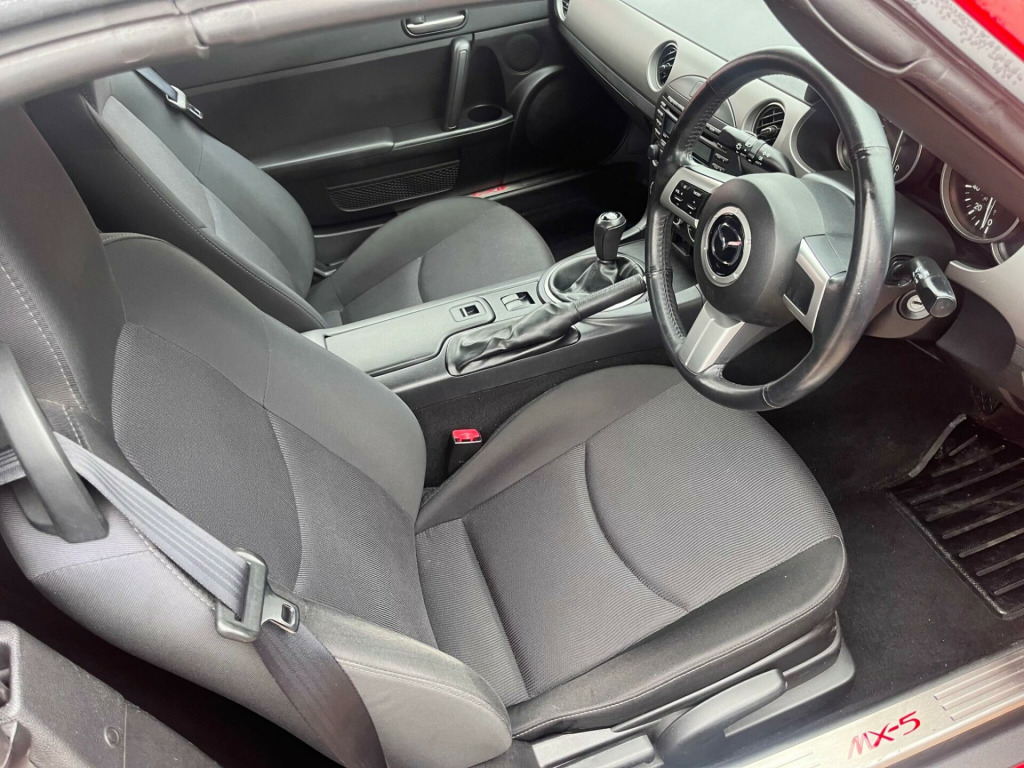 MOT 13.7.26. Discover this exceptional 2012 Mazda MX-5 i SE, boasting an impressively low mileage of just 47,000 miles, making it a standout choice for its age. This particular model is powered by a responsive 1.8L petrol engine and comes with the reassurance of a clear vehicle history check. Inside, you'll appreciate the comfort provided by the air conditioning with climate control, ensuring a pleasant driving experience in any weather.This Mazda MX-5 i SE offers a compelling package, highlighted by its low insurance group, which can contribute to lower running costs. The combination of its low mileage for a 2012 vehicle and its desirable SE trim level indicates that this car has been well looked after and offers excellent value compared to other similar models on the market.NOTE - To avoid any disappointment, please call us before travelling to ensure this car is available for viewing and on site. We are here most days, but as a small team, try and work on an appointment basis to ensure we can work around our customers and fit in with them. in alloy wheels, abs - anti lock braking system, air conditioning - climate control, airbags - driver, airbags - front passenger, airbags - front passenger deactivation system, auxillary jack for connecting mp3 players, bumpers - body coloured, central locking - remote with deadlocking, dsc - dynamic stability control, door handles - body coloured, eba - emergency brake assist, ebd - electronic brakeforce distribution, esp - electronic stability control, electric windows - front, electrically adjustable-heated door mirrors, exhaust tailpipes - twin, gear knob - leather, handbrake - leather wrapped, hood - black premium cloth, mp3-cd player with speakers x6, power steering, remote boot release, scuff plates - stainless steel, seats - drivers manual height adjustment, steering wheel - leather, steering wheel - mounted remote audio controls, tcs - traction control system, thatcham category 1 alarm and immobiliser