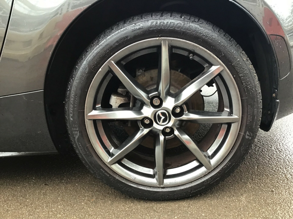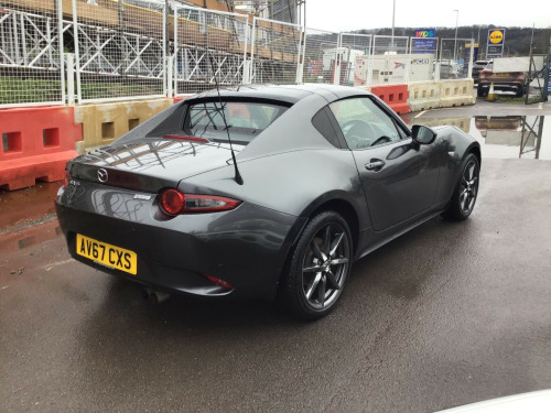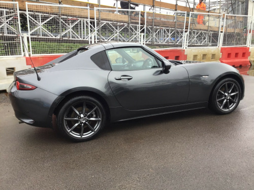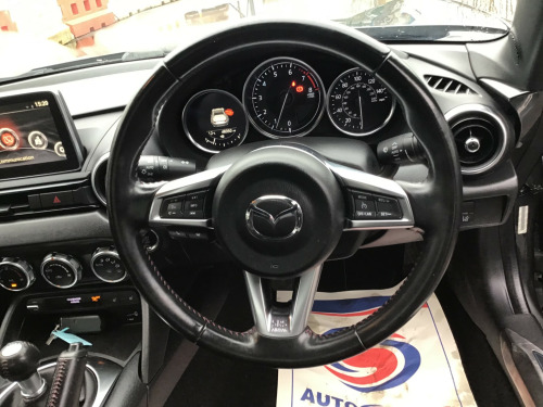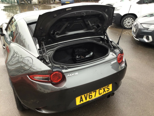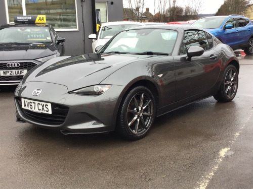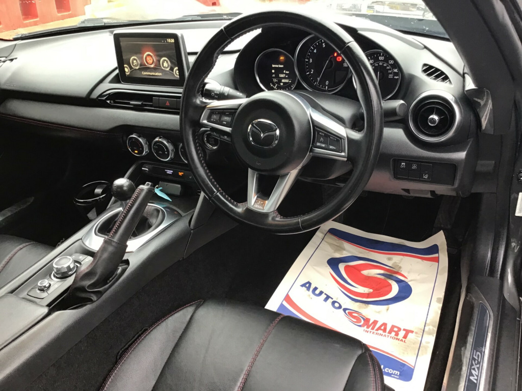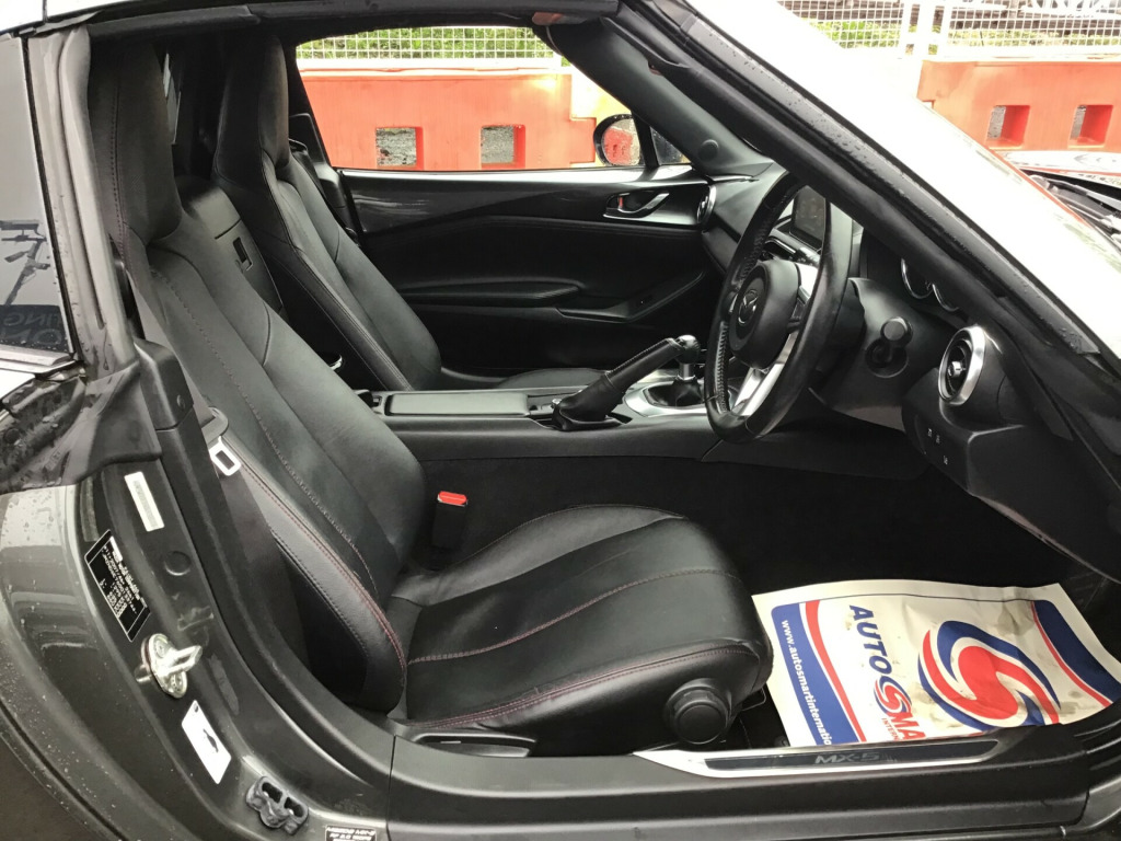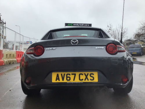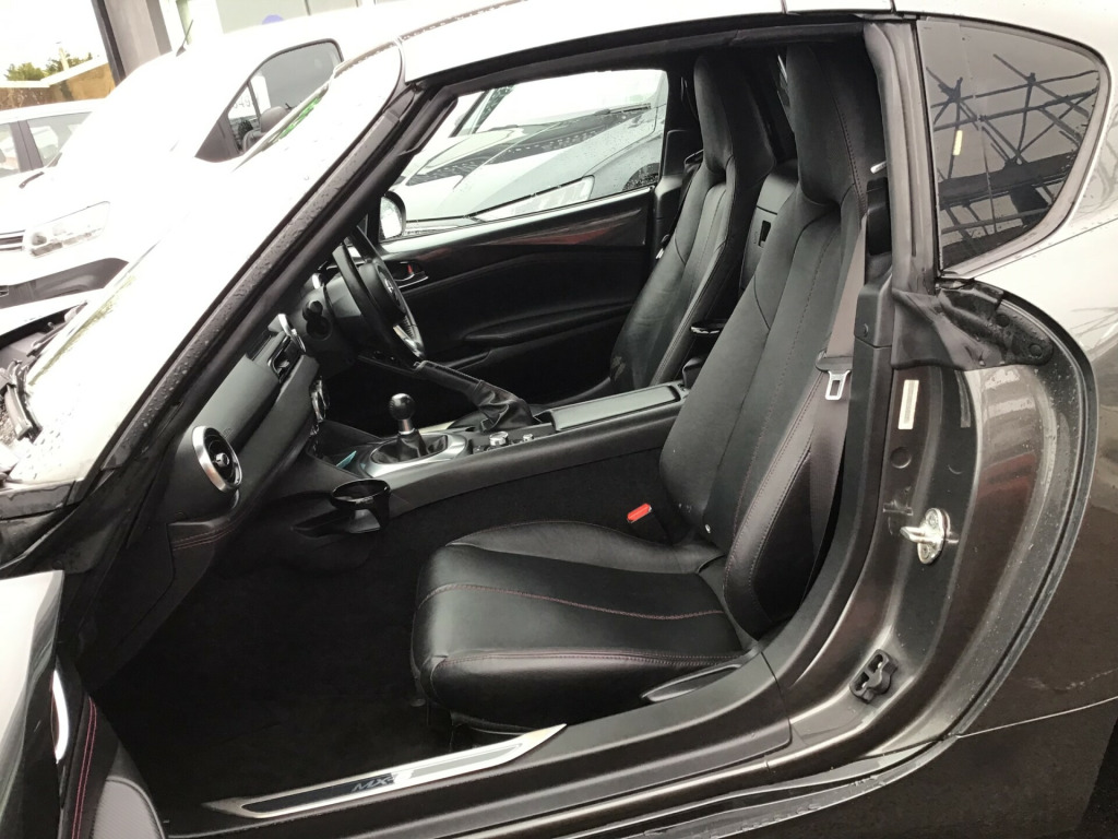 ** NEARLY FULL SERVICE HISTORY ** This 2017 Mazda MX-5 RF is a fantastic 2.0 SKYACTIV-G Sport Nav Convertible with just 48500 miles on the clock. The convertible top is perfect for enjoying the British summer, and with seating for two, it's ideal for a solo driver or a couple. Powered by petrol and boasting 160 horsepower, this Euro 6 compliant vehicle is ULEZ compliant and ready for city driving. The 2-door design and 17-inch alloy wheels give it a sporty look, while features like body-colored door mirrors, a dual exhaust system, and electrically adjustable-heated door mirrors add to its appeal. The electric windows with one-touch auto-down functionality make it easy to enjoy the open road, and the manual transmission puts the driver in full control. Whether it's a weekend getaway or a daily commute, this Mazda MX-5 RF is a stylish and dynamic choice for any driver. in alloy wheels - bright finish, body coloured door mirrors, dual exhaust system, electric windows - one touch auto down, electrically adjustable-heated door mirrors, emergency tyre repair kit, fashion bar cladding, fuel filler lid - body colour, hardtop - power retractable, windblocker, 7in colour touch screen display, aha app and stitcher app integration, audio transfer from bluetooth devices, auxiliary - aux - and two usb input, integrated bluetooth, multimedia system, satellite navigation system, usb - ipod connectivity, adjustable speed limiter, analogue speedometer, cruise control with manual speed adjustment, double pinion electric power assisted steering - dp-epas, lane departure warning system, multimedia commander, rear parking sensors, sports suspension, trip computer, tyre pressure monitoring system, air conditioning - climate control, air conditioning dials - chrome, air vent surrounds - chrome, auto dimming rear view mirror, chrome meter rings, coinbox, cupholder - front x2, engine start-stop button, gear knob - leather with chrome surround, handbrake - leather wrapped, heated seats, inner door handles - chrome, interior upper door trim - body coloured, rain-sensing front wipers, seats - drivers manual slide-recline and tilt adjustment, seats - front passenger manual slide and recline adjustment, side door trim - black with red stitching, steering wheel - leather, steering wheel - mounted audio and bluetooth controls, steering wheel - tilt adjustment, storage - rear centre box with lockable lid, sunvisors - drivers and passengers with covered vanity mirror-ticket holder, automatic passenger airbag deactivation system, dhs - deployable hood system, driver and passenger front airbags, dynamic stability control - dsc - with traction control system - tcs, four-wheel anti-lock braking system - 4w-abs with electronic brake-force distribution - ebd, hill hold assist, isofix child seat anchorage - passenger seat, lsd - limited slip differential, remote central locking with deadlocking and remote boot release, skyactiv-body engineered triple h body structure to help protect occupants from impact forces, srs - supplementary restraint system, seatbelts - 3 point - elr - 2x with pre-tensioners, seatbelts - reminder screen with audible warning, side airbags, smart keyless entry, thatcham category 1 alarm and immobiliser, dusk sensing automatic headlights, headlights - adaptive front lighting system, headlights - coming-leaving home, headlights - led with auto headlight levelling, led daytime running lights, rear brake light - high mounted