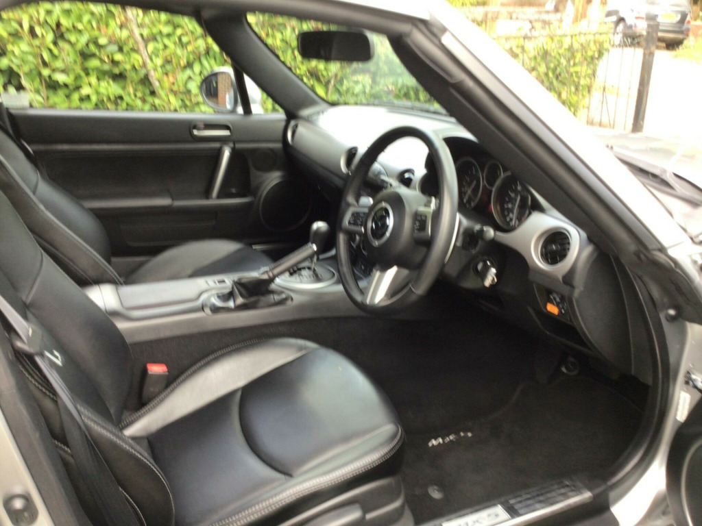 Unique Opportunity To Purchase This Mazda Mx5 2.0Ltr Automatic, One Lady Owner From New With A Incredible 4150 Miles Yes 4150 , Garaged From New , Aluminium Silver Metalic With Full Black Leather Upholstery, Super Condition Throughout Must Be Seen To Be Appreciated . SORRY THIS CAR HAS JUST BEEN SOLD. rking censors, sat nav, 17in alloy wheels, abs - anti lock braking system, air conditioning - climate control, airbags - driver, airbags - front passenger, airbags - front passenger deactivation system, auxillary jack for connecting mp3 players, bumpers - body coloured, central locking - remote with deadlocking, cruise control, dsc - dynamic stability control, door handles - body coloured, eba - emergency brake assist, ebd - electronic brakeforce distribution, esp - electronic stability control, electric windows - front, electrically adjustable-heated door mirrors, exhaust tailpipes - twin, front fog lights, gear knob - leather, handbrake - leather wrapped, integrated bluetooth system, lsd - limited slip differential, mp3-cd player with speakers x6, power steering, remote boot release, scuff plates - stainless steel, seats - drivers manual height adjustment, side airbags, sport suspension - bilstein damper, steering wheel - leather, steering wheel - mounted remote audio controls, style bar trim, tcs - traction control system, thatcham category 1 alarm and immobiliser