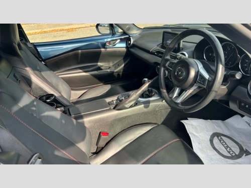 Mazda MX-5 2.0 [184] Sport Nav+ 2dr 7" touchscreen with multimedia commander, Aha and stitcher app, Analogue speedometer, Cruise control + speed limiter, Driver alert system, Electronic odometer, Engine start/stop button, Hands free phone preparation, Lane departure warning system, PAS, Rear parking sensor, Remote boot release, Satellite navigation system, Tachometer, Traffic sign recognition, Trip computer, Water temperature gauge, I-ELOOP, i-stop, Limited slip differential, Sports suspension, 2 USB/aux input socket, Premium Bose sound system with 9 speakers with 2 in each front headrest, AM/FM/DAB radio and single CD/MP3, Steering wheel audio and Bluetooth controls, Adaptive front lighting system, Auto dimming rear view mirror, Automatic headlamp levelling, Body colour bumpers, Body coloured electric/heated door mirrors, Coming/leaving home lighting function, Dual exhaust pipes, Dusk sensitive headlamps, Electric front windows/one touch facility, Electrically operated body colour retractable hard top with heated rear glass window, High mounted rear brake light with Black coloured cover, LED daytime running lights, LED Headlights, Piano Black fashion bars, Rain sensing front wipers, 12V socket, Body coloured inner door trims, Centre console storage box, Chrome Air conditioning dials, Climate control air conditioning, Coin Box, Cupholders, Driver/ passenger seat manual slide, recline and tilt adjustment, Driver/passenger sunvisors with ticket holders + vanity mirrors, Front centre armrest, Front head restraints, Gear shift indicator, Heated front seats, in 3 heat levels, ISOFIX front passenger seat child seat compliance, Leather gear knob, Leather handbrake lever, Leather steering wheel, Lockable rear storage box, Side door in Black leatherette with Red stitching, Sports seats, Strut brace, Tilt/telescopic steering column, Windblocker, 3 point ELR front seatbelts with pretensioners, ABS+Electronic Brake force Distribution, Deployable Hood System (DHS), DSTC-Dynamic Stability and Traction Control, Dual front airbags, Fasten seatbelt reminder, Hill hold assist, Manual passenger airbag deactivation function, Passenger airbag deactivate switch, Rear smart city brake support, Side airbags, Smart City Brake Support - SCBS, Tyre pressure monitor, Deadlock, Remote central door locking, Smart keyless entry, Thatcham category 1 alarm + immobiliser, Black vinyl leather dashboard panel, Chrome air vent surrounds, Chrome meter rings, 17" Bright alloy wheels, Tyre puncture repair kit