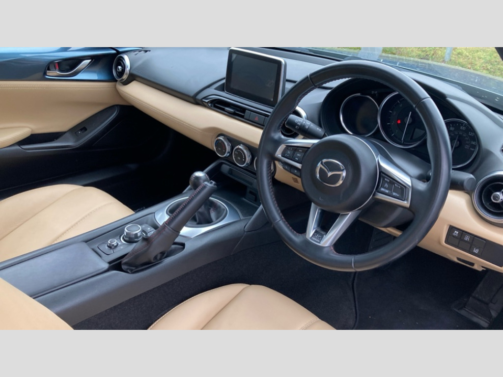 Mazda MX-5 2.0 Sport Nav 2dr 7" touchscreen with multimedia commander, Cruise control + speed limiter, Engine start/stop button, Integrated bluetooth with steering wheel mounted controls, Lane departure warning system, PAS, Rear parking sensor, Remote boot release, Satellite navigation system, Trip computer, Water temperature gauge, Limited slip differential, Sports suspension, 9 speakers, Auxiliary input socket, Bose Premium Audio system, DAB Digital radio, MP3 compatible radio/single CD player, USB/iPod connection, Adaptive front lighting system, Auto dimming rear view mirror, Automatic headlamp levelling, Body colour bumpers, Body coloured door mirrors, Coming/leaving home lighting function, Dual exhaust pipes, Dusk sensitive headlamps, Electric front windows/one touch facility, Electrically heated door mirrors, LED daytime running lights, LED Headlights, Premium cloth soft top with integrated heated glass window and soft top cover, Rain sensing front wipers, 12V socket, Body coloured inner door trims, Centre console storage box, Climate control air conditioning, Cupholders, Front centre armrest, Front head restraints, Heated front seats, Height adjustable front seats, ISOFIX front passenger seat child seat compliance, Leather gear knob, Leather handbrake lever, Leather steering wheel, Lockable rear storage box, Sports seats, Tilt/slide reclining front seats, Windblocker, 3 point ELR front seatbelts with pretensioners, ABS+Electronic Brake force Distribution, DSTC-Dynamic Stability and Traction Control, Dual front airbags, Fasten seatbelt reminder, Hill hold assist, Manual passenger airbag deactivation function, Side airbags, Tyre pressure monitor, Alarm with interior movement sensor, Immobiliser, Remote central door locking, Smart keyless entry, Superlocking, Black vinyl leather dashboard panel, 17" Bright alloy wheels, Tyre puncture repair kit