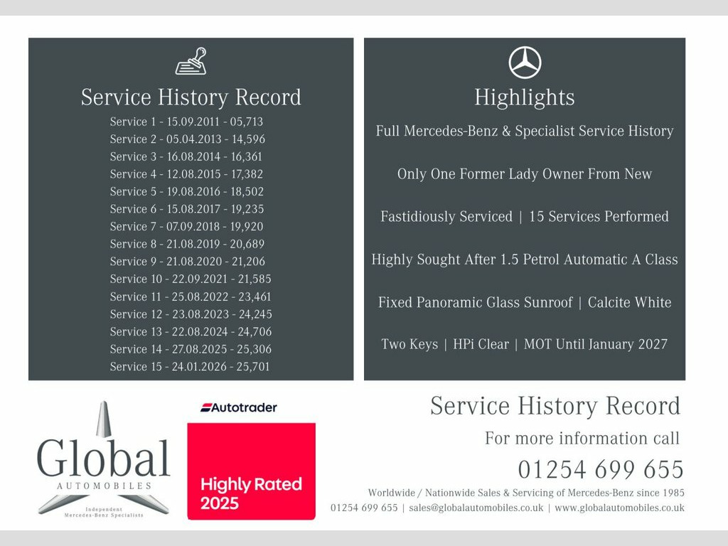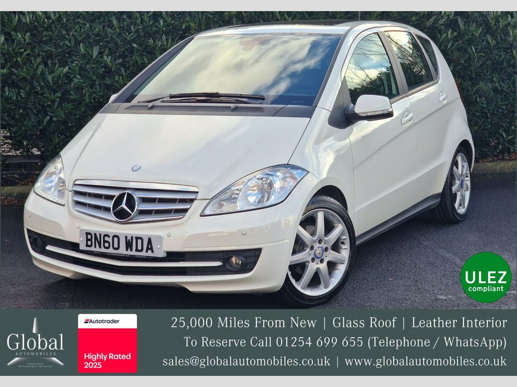 Buy with confidence from an Award Winning Independent Mercedes-Benz Specialist! We are delighted to offer our beautiful Mercedes A Class A160 "Classic SE" Automatic 1.5 Petrol finished in the highly popular "Calcite White" and fitted with an Unmarked Anthracite interior with matching door cards. This is the A Class you should be buying - Super Low Miles and in Superb Condition! Originally supplied to a Mr and Mrs Taylor by Mercedes-Benz of Wolverhampton as an Ex Demonstrator, this Mercedes-Benz has been driven extremely sparingly, having only covered 25,000 miles since 2010. This Mature Owned vehicle is a "Facelift Model" and is supplied with its Original Manuals, Amazing Full Mercedes-Benz and Specialist Service History Record, Two Keys, MOT until January 2027, HPI Clearance Certificate and a Full and current V5 Logbook. The Service History is spectacular, having been Serviced 15 times with the most recent Service performed at 25,701 in January 2026 including the all important Automatic Transmission Service (Filters and Oil). Specification; Anthracite Leather Seats, Fixed Panoramic Glass Sunroof, Cruise Control, AMG Evolution 17" Alloy Wheels, Audio 20 Media System; Bluetooth Telephone, CD Player, Radio and Auxiliary Media Input. Anti Theft Alarm System, IsoFix Mounts in Rear, Air Conditioner, Trunk Covering, Heighten Theft Protection, Theft Protection Package, Rear Seatbelt Indication Status, Automatic Child Seat Recognition, Seat C Alloy Wheels-18in AMG 5-Spoke Design, Fixed Panoramic Glass Sunroof, Leather Steering Wheel & Gearshift, Seat Comfort Package, Telephone Pre-Wiring/Hands-Free Facility