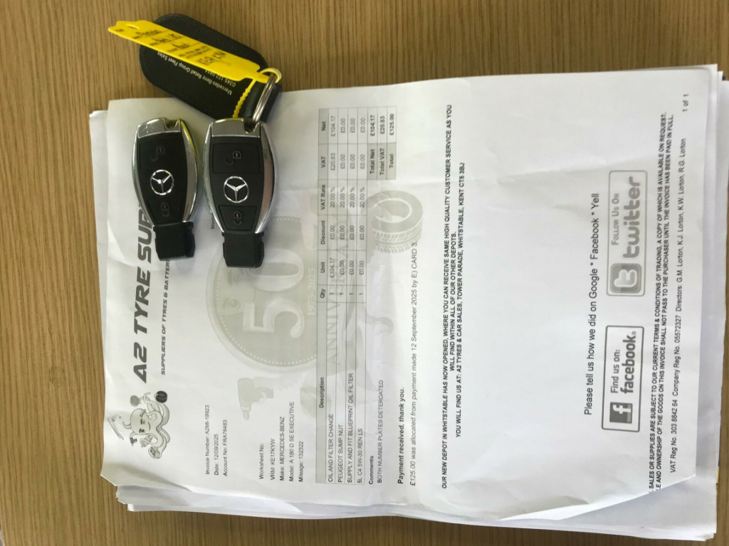 This car has just come in, Full Photos p, video and Valet to follow shortly, but just to give you an idea.Boasting a full service history with its last service completed in September 2025 at 132,322 miles, this 2017 Mercedes-Benz A Class A180d SE offers excellent provenance. This Euro 6 compliant 1.5L diesel model, with only two previous owners, comes equipped with the desirable Executive Package, featuring front and rear parking sensors, heated seats, and automatic headlamp activation. You'll also benefit from a 180 degree reversing camera with parking guidelines and THERMATIC air conditioning for a comfortable driving experience.This Mercedes-Benz A Class stands out with its impressive 81 mpg fuel economy, indicating it is more economical than many similar vehicles. Its low CO2 emissions and low insurance group further contribute to its cost effectiveness. Practicality is also a strong point, with generous boot space making it suitable for everyday needs and longer journeys. A 12 month MOT will be provided on purchase, ensuring peace of mind.For further information or to book a road test please call 01622 890933. v socket, 12v socket in luggage compartment, 16in alloy wheels - light 5-twin-spoke painted in black with a high-sheen finish, 7in tablet-style colour display, abs - anti-lock braking system with bas - brake assist, attention assist, active bonnet - pedestrian safety measure which detects an impact and raises bonnet by 65mm, active braking assist, adaptive brake assist with hold function and hill start assist, adaptive brake lights, air conditioning - thermatic, air vents with surround and cruciform nozzle in silver chrome, airbags - dual stage - driver and front passenger, airbags - head and sidebags - driver and front passenger, airbags - windowbags for driver and front passenger, alarm system with immobiliser and interior protection - thatcham category 1, audio 20 radio-cd-mp3 compatibility, automatic child seat recognition sensor, beltline strips - chrome, bodystyling - side skirts - body-coloured, brake-pad wear warning indicator, bumpers - body coloured, centre armrest - front with stowage, childproof locks - manually operated for rear doors and electrically operated for rear power windows, controller on centre console with chrome surround, crash-responsive emergency lighting, cruise control with limiter, cup holder - double - front, direction indicators with lane-changer function, door handles - body coloured, door mirrors - electrically adjustable and heated with integrated led indicators, door mirrors - mirror housing in body-colour, drivers kneebag, esp - electronic stability programme with asr - acceleration skid control, esp cornering dynamics assist, electric parking brake, electric windows - 4, electronic key - chrome surround, executive package, exhaust system - no visible tailpipes, first aid kit and warning triangle, fluid level warning indicator for fuel - oil - coolant and washer fluid, front door sills with mercedes-benz lettering, glass - rear windscreen - heated with timer control, glove compartment - illuminated, halogen headlights with integrated daytime running lights, head restraints - adjustable, headlamp assist - automatic headlamp activation, high level third brake light - led, isofix and top-tether child seat fixing points in rear - two outer seats, instrument cluster with four analogue dials and needles suspended in six-o-clock position, light failure indicator, load securing rings in luggage compartment, luggage compartment cover, luggage net under parcel shelf and on the left and right in luggage compartment, luggage nets on the rear of front seats, media interface, mercedes connect me, net in passenger footwell, outside temperature gauge, part led tail lights, pollen filter, power steering - speed sensitive, radiator grille - diamond in black with one louvre painted in vehicle colour and chrome insert, radio aerial roof spoiler, rear fog light, rear seats - split folding 1-3 2-3, rear windscreen wiper, remote central locking and crash sensor with emergency opening function, reversing camera with parking guidelines - 180 degree view, roof lining - grey fabric, seat belts - rear three-point - 3, seat belts reminder - front and rear, seat comfort package, seat occupancy sensor - front passenger seat, seats - front cushion length adjustment, seats - front manually adjustable, service indicator assyst, smartphone integration, spectacles compartment in overhead control panel, steering column - manually adjustable for height and reach, steering wheel - 3-spoke multi-function - trimmed in leather, storage boxes under front seats, storage compartment beneath load compartment floor, tirefit tyre-sealant kit, trim - honeycomb, trip computer in multi-function display, tyre pressure monitoring system