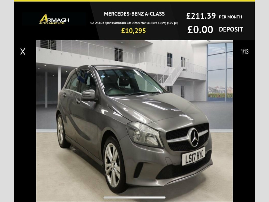 This 2017 Mercedes-Benz A-Class 1.5 A180d Sport Hatchback 5dr Diesel Manual Euro 6 Hatchback is currently available for £10,295 in Armagh with Diesel engine and Manual gearbox. For more information or to arrange a viewing, click here to send us an email using form below.