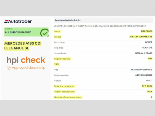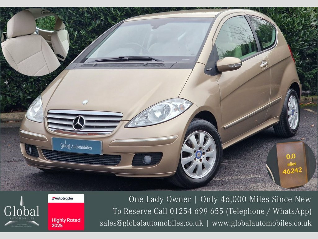 Buy with confidence from an Award Winning Independent Mercedes-Benz Specialist! We are delighted to offer our Mercedes A Class A180 CDi "Elegance SE" 2.0 Manual Diesel finished in the highly popular "Metallic Sand Dune Beige" and fitted with an Beige Cloth interior with matching door cards. Owned by a Mrs Slater since brand new, this A Class has only covered 46,000 miles since new! This Mature One Lady Owner vehicle is supplied with its Original Manuals, Comprehensive Independent and Mercedes-Benz Specialist Service History Record, Two Keys, MOT until December 2026, HPI Clearance Certificate and a Full and current V5 Logbook. This Vehicle has just been Serviced (Major Service B) at the Current Mileage and is ready to drive away. The Specification; Audio 20 Media System; CD Player, FM Radio plus multiple Media Inputs. Tyre Pressure Loss Warner, Anti Theft Alarm System, Air Conditioner, Trunk Covering, CD Compartment Storage, Rear Seatbelt Indication Status, Automatic Child Seat Recognition, Fog Lamps, Cup Holder, Heated Rear Screen plus many more features. We supply a complimentary warranty. This vehicle is a joy to drive, and the first person to see and test drive will be buying this decent example. For further details, please contact Tracey on 01254 699 655 - Ref No - 43 -