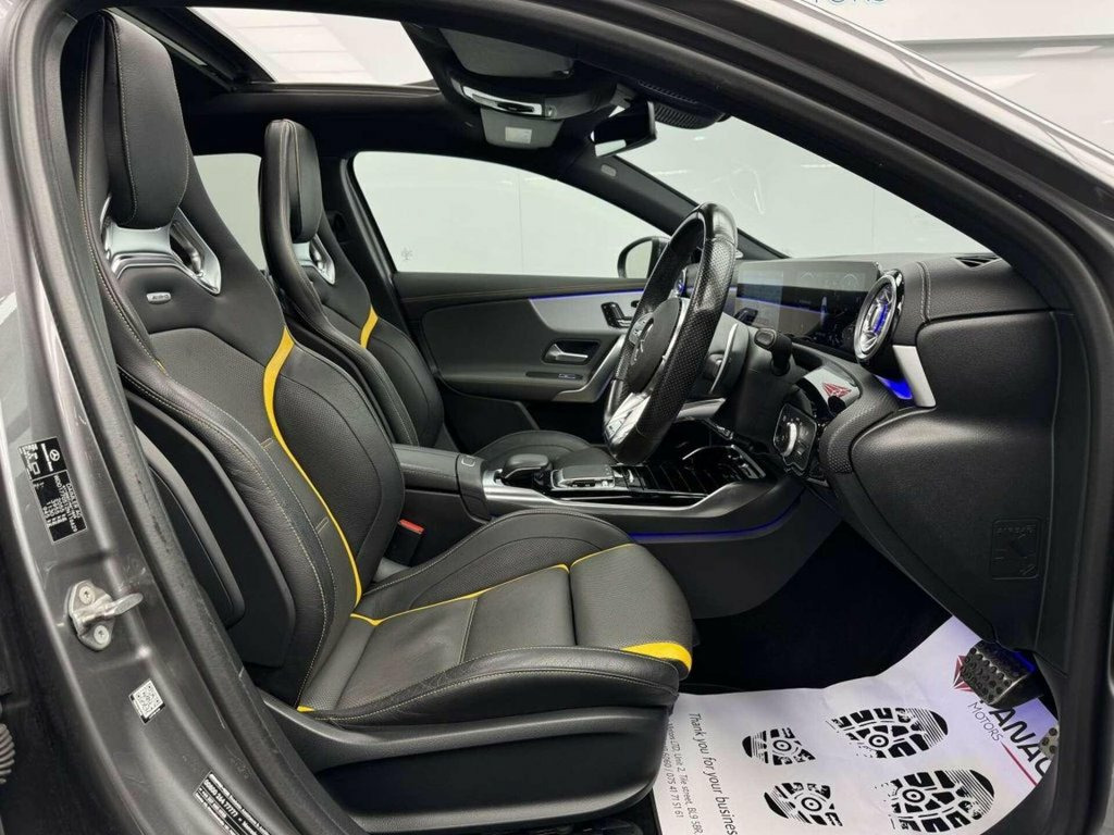 MERCEDES BENZ A-CLASS A35 AMG LINE HATCHBACK 5DR PETROL 7G-DCT EURO 6 224BHP FINISHED IN EXCLUSIVE MOUNTAIN GREY WITH FULL LEATHER INTERIOR. THIS HIGH SPECIFICATION EXAMPLE BOASTS 1 PREVIOUS OWNER FROM NEW AND A FULL SERVICE RECORD ALONG SIDE THE A45S BODY KIT THIS VEHICLE INCLUDES | TILT AND SLIDE PANORAMIC GLASS ROOF | FRONT BUCKET SEATS | UPGRADED BURMISTER SOUND SYSTEM | VIRTUAL DASHBOARD | UPGRADED 19INCH AMG ALLOYS | MULTICOLOUR AMBIENT LIGHTING | LAIN ASSIST | REVERSE CAMERA | REAR PARKING SENSORS | A45S BODY KIT | REAR SPOILER | UPGRADED FRONT GRILL | KEYLESS GO | BLACK STYLING PACK | APPLE CAR PLAY | DAB | CRUISE CONTROL | AMG AERO PACK | BE FAST. - A RARE FIND IN THIS SPECIFICATION AND NOT TO BE MISSED.... Further to this all vehicles are provided with a comprehensive AA Dealer Care Extended Guarantee and Full AA Roadside, Recovery and Home Start & Onward travel (where not covered under the manufactures own warranty). HPI checks are carried out making sure all cars are clear from any concern, offering you total piece of mind. Every vehicle's mileage is fully guaranteed as genuine. Included with your purchase you will receive a minimum of 3 months Warranty with the option to extended and tailor your package at the time of purchase. Our vehicles are supplied fully valeted to the highest standards and include up to date servicing with a minimum of 9 months MOT. We are regulated by the FCA and can provide a range of flexible finance options, tailoring a package 18in Alloy Wheels - AMG 5 Twin Spoke Des, ABS - Anti-Lock Braking System with BAS , Active Bonnet - Pedestrian Safety Measur, Active Brake ASSIST, Active Lane Keeping Assist, Adaptive Brake Assist with Hold Function, Adaptive Brake Lights, Air Conditioning - THERMOTRONIC Luxury A, Air Vents with Surround and Cruciform No, Airbag - Kneebag for Driver, Airbags - Dual Stage - Driver and Front , Airbags - Windowbags for Driver and Fron, Alarm System with Immobiliser and Interi, AMG Advanced Navigation Package, AMG Bodystyling - Front and Rear Apron, AMG Premium Plus Package, AMG Radiator Grille with Twin Blade Lame, AMG Style Package, AMG Suspension, ATTENTION Assist, Automatic Child Seat Recogn