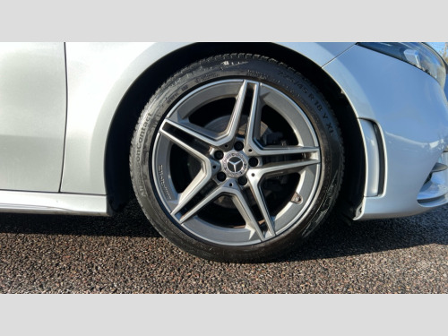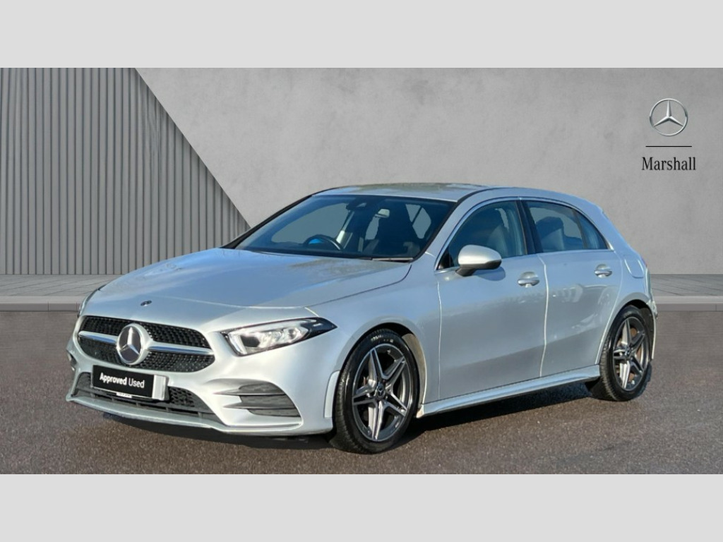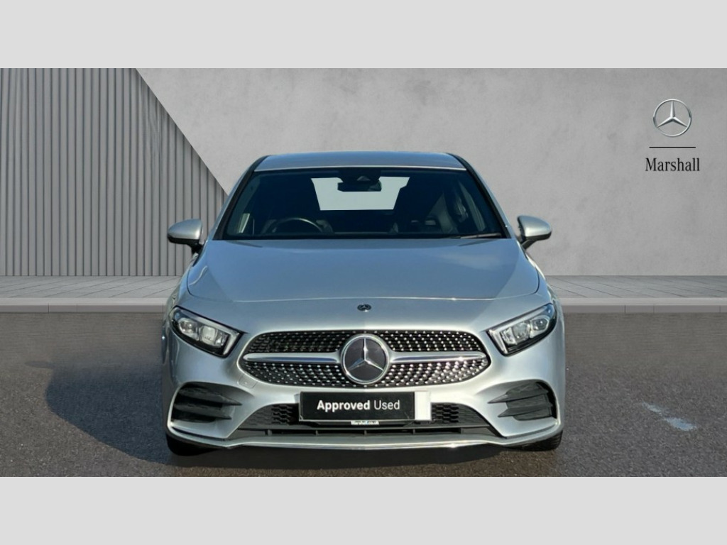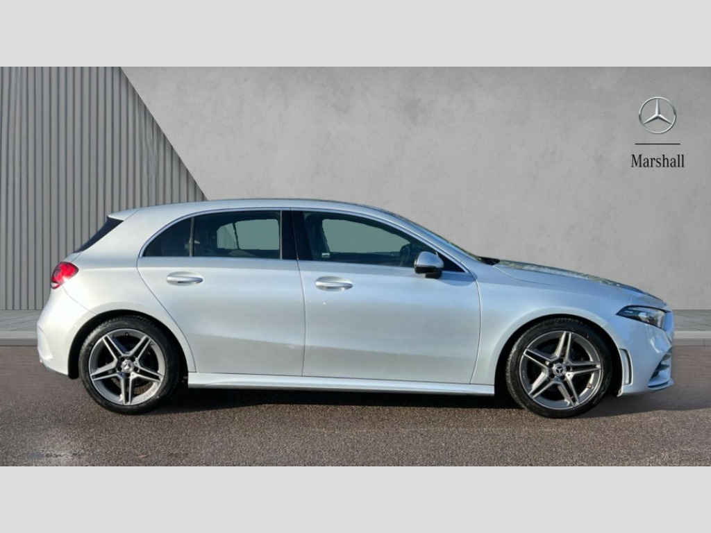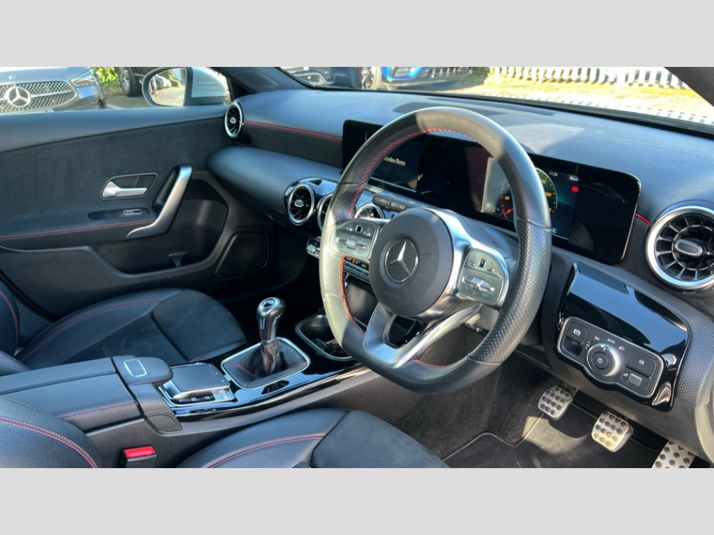 Mercedes-Benz A Class A180 AMG Line 5dr 180 degree rear view camera with parking guidelines, 7" colour screen in instrument panel, 7" touchscreen media display, Active lane keep assist, Attention assist, Brake pad wear indicator warning light, Cruise control + speed limiter, Direct steering, DYNAMIC SELECT with a choice of driving modes (ECO, Comfort, Sport and Individual), ECO start/stop function, Fluid level warning indicator for fuel, oil, coolant and washer fluid, Hard-disk navigation, Hey Mercedes Voice activation, Lamp failure indicator, Mercedes me connect including emergency call system, accident recovery, breakdown and maintenance management, Outside temperature gauge, Radio aerial integrated into roof spoiler, Service indicator (ASSYST), Speed sensitive power steering, Trip computer, Lowered comfort suspension, DAB Digital radio, Dual bluetooth interface, 2 USB ports (type C), MBUX multimedia system with DAB digital radio and touchpad including satellite navigation, 4 Electric Front and Rear windows, Active aerodynamics with AIRPANEL in the front apron, Adaptive brake lights, AMG front, rear apron and side skirts, Blue tinted glass, Body colour bumpers, Body colour door handles, Body colour side skirt, Body coloured door mirrors, Chrome beltline trim, Diamond radiator grille with chrome pins and silver louvre + chrome insert, Electric adjustable and heated door mirrors with integrated LED side indicators, Exhaust system - Twin trapezoidal tailpipes in polished stainless steel, Headlamp assist automatic headlamp activation, Heated glass rear windscreen + timer control, LED high performance headlamps with integrated LED daytime running lights, LED tail lamp, LED third brake light, Privacy glass, Rain sensor windscreen wipers, Rear fog lights, Rear wiper, 12V socket, 3 Spoke flat bottom leather multi function steering wheel with perforated leather in grip area, 40:20:40 split folding rear seats, Air vents surround and cruciform nozzle in silver chrome, AMG floor mats with red stitching, Artico man-made leather/Microfibre Dinamica upholstery with red contrast stitching, Auto Mercedes-Benz child seat recognition sensor, Black roof lining, Brushed stainless steel sports pedals with rubber studs, Controller on centre console with chrome surround, Cup holder and stowage compartment lighting, Freight packaging without tie-down hooks, Front centre armrest with storage compartment, Front door sills with Mercedes Benz lettering, Front doors with ambient and signal light, Front footwell lights, Front reading lamps in left and right console downlighter, Front seat backs luggage nets, Front seat cushion length adjustment, Front signal exit lamp, Front vanity lights, Handle recess/closing light, Height/reach adjustable steering column, Illuminated glove compartment stowage, ISOFIX Child seat top tethers and anchor fixings, Manual height adjustable front seats, Oddments tray lighting, Rear head restraints, Rear Reading Lamps, Seat occupancy sensor for front passenger seat, Spectacles compartment for driver, Sports seats with integrated headrests, Storage compartment under load area floor, Sunvisors with illuminated vanity mirrors, Touchpad, Touchpad illumination, Twin front cupholders, Two zone thermotronic luxury automatic climate control, Light and sight pack - A Class, Seat comfort pack - A Class, 3 rear 3 point seatbelts, ABS with Brake Assist, Active bonnet, Active brake assist includes forward collision warning system with autonomous braking, Adaptive brake assist with hold function and hill start assist, Black seatbelts, Childproof locks manually operated for rear doors and electrically operated for rear power windows, Crash responsive emergency lighting, Driver and passenger head and side airbags, Drivers knee airbag, Dual stage driver/passenger airbags, Electronic parking brake, ESP curve dynamic assist, ESP with ASR, Front and rear seatbelt reminder, Front brake callipers with Mercedes Benz lettering, Tyre pressure monitoring system, Warning triangle and first aid kit, Window airbags, Alarm system/interior protection/immobiliser, Keyless Go, Remote central locking and crash sensor with emergency opening function, 18" AMG 5 twin spoke light alloy wheels in titanium grey with highsheen finish, Summer tyres, Tirefit sealant kit