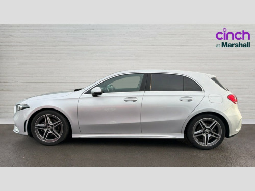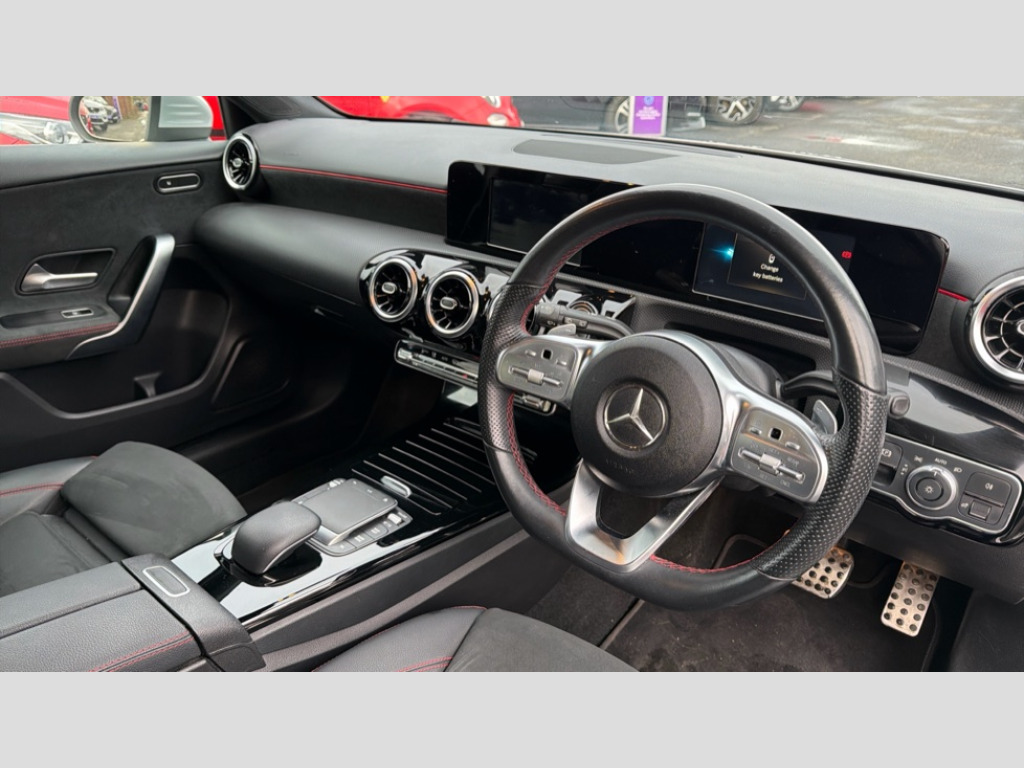 Mercedes-Benz A Class A180 AMG Line 5dr Auto 180 degree rear view camera with parking guidelines, 7" colour screen in instrument panel, 7" touchscreen media display, Active lane keep assist, Attention assist, Brake pad wear indicator warning light, Car wash mode, Cruise control + speed limiter, Direct steering, Dual bluetooth interfaces, DYNAMIC SELECT with a choice of driving modes (ECO, Comfort, Sport and Individual), ECO start/stop function, Fluid level warning indicator for fuel, oil, coolant and washer fluid, Hard-disk navigation, Hey Mercedes Voice activation, Lamp failure indicator, Mercedes me connect including emergency call system, accident recovery, breakdown and maintenance management, Outside temperature gauge, Owners manual in English, Pre-installation for private car sharing, Pre-installation for Vehicle Monitoring, Pre-installation for Vehicle Setup, Preinstallation for Mercedes Benz link, Service indicator (ASSYST), Speed sensitive power steering, Trip computer, Lowered comfort suspension, Rear axle torsion beam, 2 USB ports (type C) in rear stowage compartment and one in front of center console, 6 speakers, DAB Digital radio, MBUX multimedia system with DAB digital radio and touchpad including satellite navigation, Mercedes-Benz sound system - 100W, 4 Electric Front and Rear windows, Adaptive brake lights, AMG bodystyling - Front apron with splitter in chrome, rear apron with chrome trim and chrome visible trim elements in tailpipe, Black weather strip, Body colour bumpers, Body colour door handles, Body colour side skirt, Body coloured door mirrors, Chrome beltline trim, Diamond radiator grille with chrome pins and silver louvre + chrome insert, Electric adjustable and heated door mirrors with integrated LED side indicators, Exhaust system - Twin visible tailpipes in polished stainless steel, Headlamp assist automatic headlamp activation, Heated glass rear windscreen + timer control, LED high performance headlamps with integrated LED daytime running lights, LED tail lamp, LED third brake light, Privacy glass, Radio aerial, Rain sensing windscreen wipers with two sensitivity settings, Rear fog lights, Rear wiper, Window line trim strip in chrome, 3 Spoke flat bottom leather multi function steering wheel with perforated leather in grip area, 40:20:40 split folding rear seats, Artico man-made leather/Microfibre Dinamica upholstery with red contrast stitching, Auto Mercedes-Benz child seat recognition sensor, Black air vents with surround in silver chrome, Black roof lining, Brushed stainless steel sports pedals with rubber studs, Controller on centre console with chrome surround, Floor mats with stitched edging and AMG lettering, Front centre armrest with storage compartment, Front door sills with Mercedes Benz lettering, Front seat backs luggage nets, Front seat cushion length adjustment, Galvanished gear shift paddles on steering wheel, Heated front seats, Height/reach adjustable steering column, Interior mirror with reading lamps in black and frameless, Manual height adjustable front seats, Rear head restraints, Seat occupancy sensor for front passenger seat, Sports seats with integrated headrests, Stowage compartment in centre console with retractable cover, Sunvisors with illuminated vanity mirrors, Touchpad on center console, Twin front cupholders, Two zone thermotronic luxury automatic climate control, Light and sight pack - A Class, Seat comfort pack - A Class, 3 rear 3 point seatbelts, ABS with Brake Assist, Active bonnet, Active brake assist includes forward collision warning system with autonomous braking, Adaptive brake assist with hold function and hill start assist, Black seatbelts, Childproof locks manually operated for rear doors and electrically operated for rear power windows, Crash responsive emergency lighting, Driver and passenger head and side airbags, Drivers knee airbag, Dual stage driver/passenger airbags, Electronic parking brake, ESP curve dynamic assist, ESP with ASR, Front and rear seatbelt reminder, Front brake callipers with Mercedes Benz lettering, ISOFIX and top tether child seat fixing points in two outer rear seats, Tyre pressure monitoring system, Warning triangle and first aid kit, Window airbags, Alarm system/interior protection/immobiliser, Keyless Go, Remote central locking and crash sensor with emergency opening function, Urban guard vehicle protection system with immobiliser and interior protection, Dinamica microfibre trim in black, 18" AMG 5 twin spoke light alloy wheels in titanium grey with highsheen finish, Summer tyres, Tirefit sealant kit