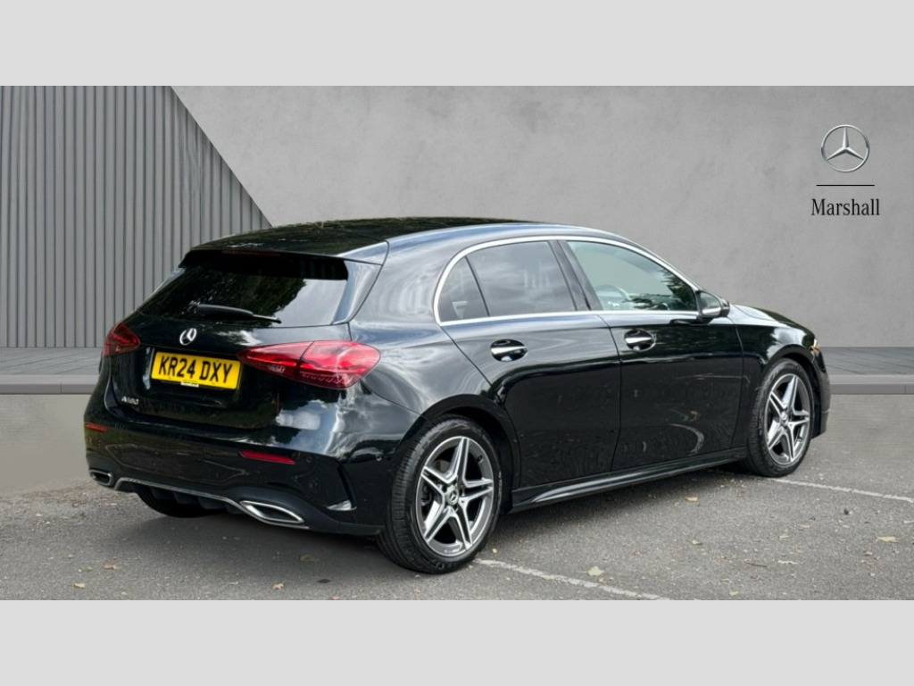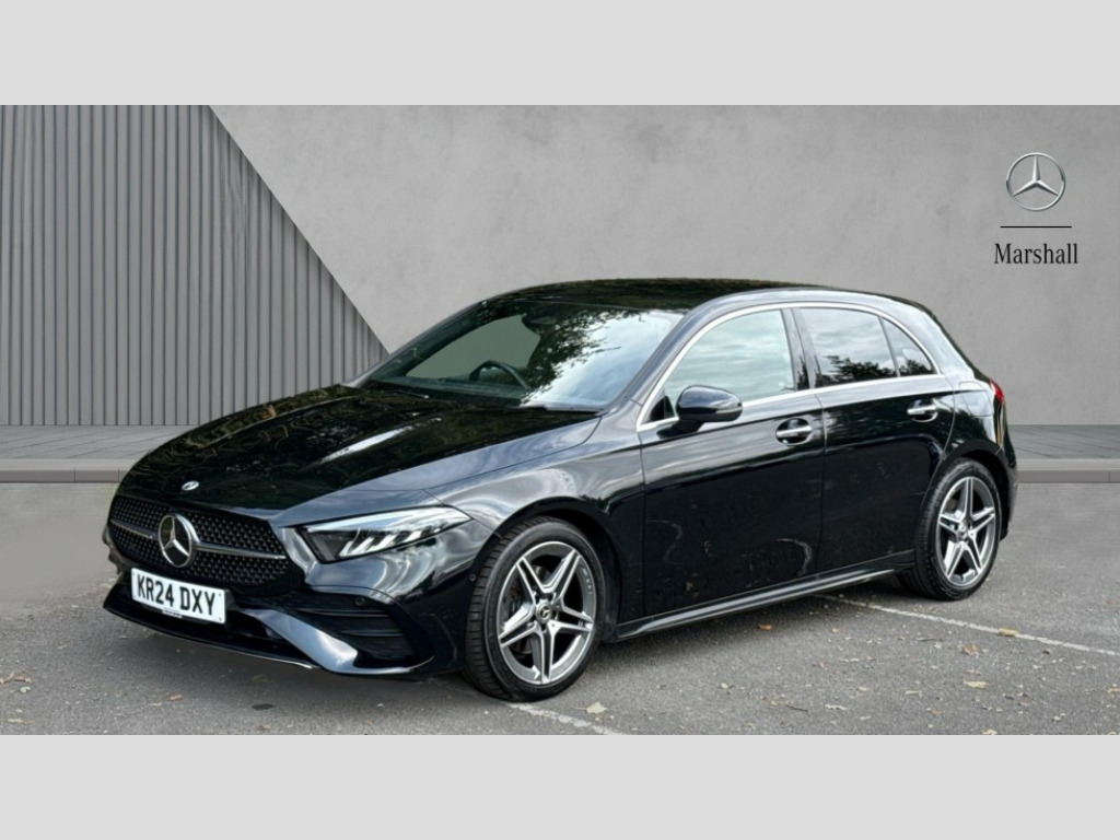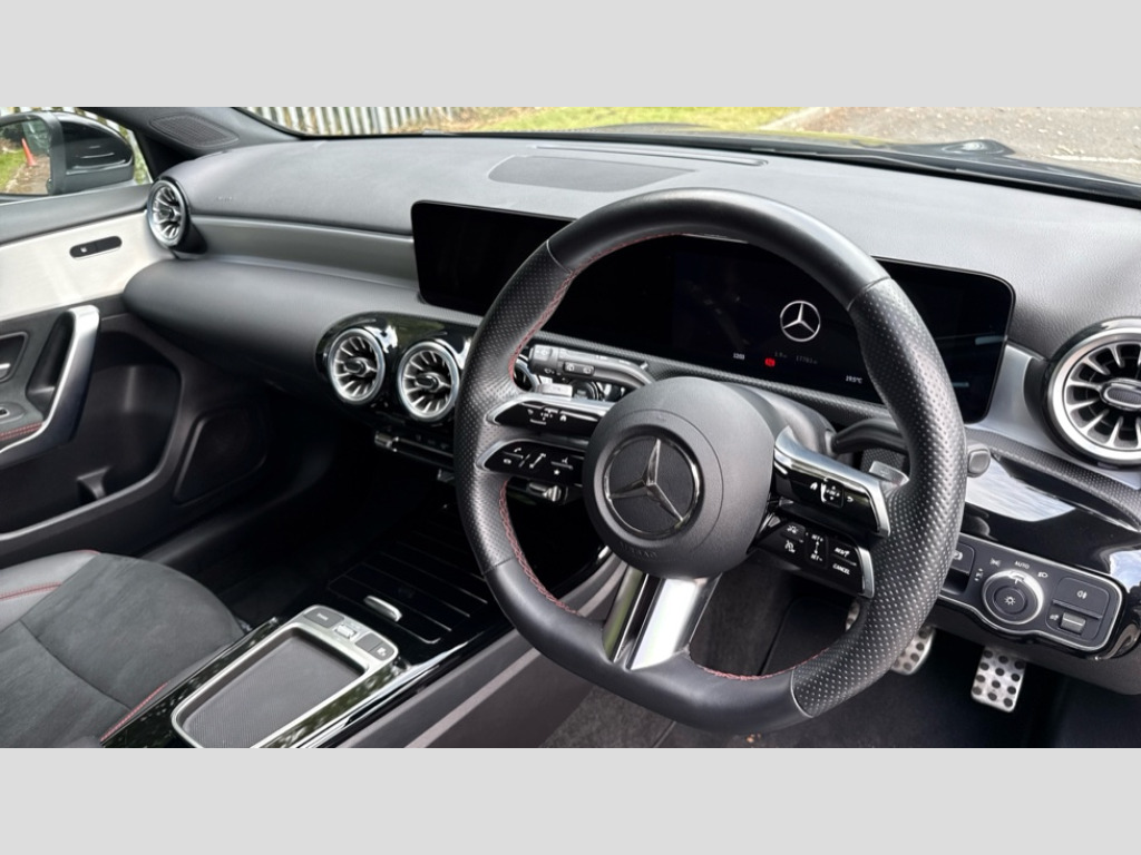 Mercedes-Benz A Class A180 AMG Line Executive 5dr Auto 10.25 inch touchscreen central media display, 10.25" Digital instrument cluster display screen, Attention assist, Brake pad wear indicator warning light, Car wash mode, Cruise control + speed limiter, Direct steering, Direction indicators with lane change function, Dual bluetooth interfaces, DYNAMIC SELECT with a choice of driving modes (ECO, Comfort, Sport and Individual), Easy pack tailgate hands-free access, ECO start/stop function, Engine start/stop button, Fluid level warning indicator for fuel, oil, coolant and washer fluid, Fluorescent jacket for driver, Hard-disk navigation, Hey Mercedes Voice activation, Lamp failure indicator, Lane keeping system, Mercedes me connect including emergency call system, accident recovery, breakdown and maintenance management, Mercedes me remote services, Outside temperature gauge, Owners manual in English, Pre-installation of private car share, Preinstallation for Mercedes Benz link, Remote boot closing, Service indicator (ASSYST), Smartphone integration with Apple CarPlay and Android auto, Speed limit assist, Speed sensitive power steering, Tailgate, Trip computer in multifunction display with current consumption indicator, Wireless charging, Lowered comfort suspension, DAB Digital radio, MBUX multimedia system, Mercedes Benz sound system (100 W) with 6 speakers, 4 Electric Front and Rear windows, Adaptive brake lights, AMG body styling - AMG front apron with front splitter and AMG rear apron and visible exhaust tailpipe trim elements, Body colour bumpers, Body colour door handles with chrome inserts, Body colour side skirt, Body coloured door mirrors, Chrome beltline strips, Diamond radiator grille with pins in fine star pattern, Electric adjustable and heated door mirrors with integrated LED side indicators, Exhaust system with 2 visible tailpipe trim elements and rear apron, Headlamp assist automatic headlamp activation, Heat insulating dark tinted rear and rear side windows, Heated glass rear windscreen + timer control, LED High level third brake light, LED High Performance headlamps including integral LED daytime running lamps and adaptive highbeam assist, LED tail lamp, Privacy glass, Radio aerial, Rain sensing windscreen wipers with two sensitivity settings, Rear fog lights, Rear side wing doors, Rear windscreen wiper, Window line trim strip in chrome, 3 seat bench in 2nd row, 3 Spoke flat bottom leather multi function steering wheel with perforated leather in grip area, 4 way lumbar support, 40:20:40 split folding rear seats, Air conditioning - One zone THERMATIC automatic climate control with automatically controlled air distribution, AMG floor mats, Automatic child seat recognition sensor, Black air vents with surround in silver chrome, Black roof lining, Brushed stainless steel sports pedals with rubber studs, Front centre armrest with stowage, Front door sills with Mercedes Benz lettering, Front seat backs luggage nets, Galvanished gear shift paddles on steering wheel, Heated front seats, Height/reach adjustable steering column, Interior lighting - 64 colour Ambient lighting, Interior mirror with reading lamps in black and frameless, Rear armrest with 2 cupholders, Seat occupancy sensor for front passenger seat, Single front passenger seat, Sports seats with integrated headrests, Stowage compartment in centre console with retractable cover, Sunvisors with illuminated vanity mirrors, Twin front cupholders, Light and sight pack - A Class, Mirror package - A Class, Parking pack - A Class, Seat comfort pack - A Class, USB pack plus - A Class, 3 rear 3 point seatbelts, ABS with Brake Assist, Active bonnet, Active brake assist includes forward collision warning system with autonomous braking, Adaptive brake assist with hold function and hill start assist, Black seatbelts, Bonnet with power domes, Childproof locks manually operated for rear doors and electrically operated for rear power windows, Crash responsive emergency lighting, Driver and passenger head and side airbags, Drivers knee airbag, Dual stage driver/passenger airbags, Electronic parking brake, ESP curve dynamic assist, ESP with ASR, Front and rear seatbelt reminder, ISOFIX and top tether child seat fixing points in two outer rear seats, Tyre pressure monitoring system, Warning triangle and first aid kit, Window airbags, Alarm system/interior protection/immobiliser, Guard 360 degree vehicle protection, Keyless entry lock/unlock, Keyless Go, Remote central locking and crash sensor with emergency opening function, Light longitudinal grain aluminium trim, 18" AMG 5 twin spoke light alloy wheels,aerodynamically optimised, painted in termolite grey with high sheen finish, Summer tyres, Tirefit sealant kit