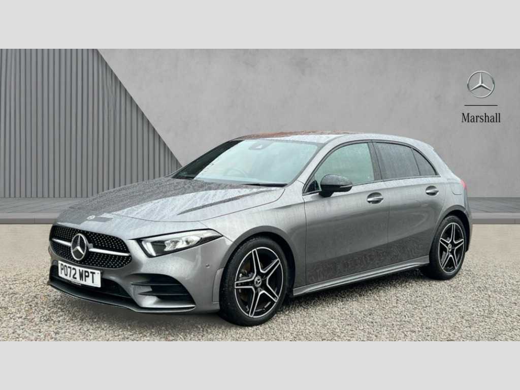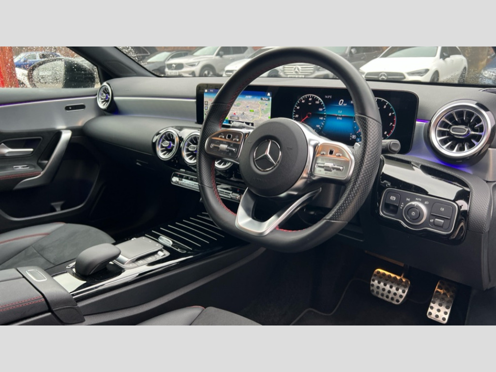Mercedes-Benz A Class A180 AMG Line Executive 5dr Auto 10.25" Digital instrument cluster display screen, 10.25" media display, 180 degree rear view camera with parking guidelines, Active parking assist with visual and audible warning of detected obstacles, Attention assist, Brake pad wear indicator warning light, Car wash mode, Cruise control + speed limiter, Direct steering, Dual bluetooth interfaces, DYNAMIC SELECT with a choice of driving modes (ECO, Comfort, Sport and Individual), ECO start/stop function, Fluid level warning indicator for fuel, oil, coolant and washer fluid, Hard-disk navigation, Hey Mercedes Voice activation, Lamp failure indicator, Lane keeping system, Mercedes me connect including emergency call system, accident recovery, breakdown and maintenance management, Mercedes me remote services, Outside temperature gauge, Owners manual in English, Pre-installation for private car sharing, Preinstallation for Mercedes Benz link, Service indicator (ASSYST), Smartphone integration with Apple CarPlay and Android auto, Speed limit assist, Speed sensitive power steering, Trip computer, Ultrasonic sensors positioned in the front and rear bumpers, Lowered comfort suspension, Rear axle torsion beam, 2 USB ports (type C) in rear stowage compartment and one in front of center console, 6 speakers, DAB Digital radio, MBUX multimedia system with DAB digital radio and touchpad including satellite navigation, Mercedes-Benz sound system - 100W, 4 Electric Front and Rear windows, Adaptive brake lights, AMG bodystyling - Front apron with splitter in chrome, rear apron with chrome trim and chrome visible trim elements in tailpipe, Automatic headlights, Black weather strip, Body colour bumpers, Body colour door handles with chrome inserts, Body colour side skirt, Electric adjustable and heated door mirrors with integrated LED side indicators, Exclusive diamond radiator grille, Exhaust system - Twin visible tailpipes in polished stainless steel, Headlamp assist automatic headlamp activation, Heated glass rear windscreen + timer control, LED High level third brake light, LED high performance headlamps with integrated LED daytime running lights, LED tail lamp, Privacy glass, Radio aerial, Rain sensing windscreen wipers with two sensitivity settings, Rear fog lights, Rear side wing doors, Rear wiper, 3 seat bench in 2nd row, 3 Spoke flat bottom leather multi function steering wheel with perforated leather in grip area, 40:20:40 split folding rear seats, Artico man-made leather/Microfibre Dinamica upholstery with red contrast stitching, Auto Mercedes-Benz child seat recognition sensor, Black air vents with surround in silver chrome, Black roof lining, Brushed stainless steel sports pedals with rubber studs, Controller on centre console with chrome surround, Floor mats with AMG lettering, Front centre armrest with storage compartment, Front seat backs luggage nets, Galvanished gear shift paddles on steering wheel, Heated front seats, Height/reach adjustable steering column, Illuminated Mercedes Benz lettering front door sills with changeable cover, Interior lighting - 64 colour Ambient lighting, Interior mirror with reading lamps in black and frameless, Manual height adjustable front seats, Rear head restraints, Seat occupancy sensor for front passenger seat, Single front passenger seat, Sports seats with integrated headrests, Stowage compartment in centre console with retractable cover, Sunvisors with illuminated vanity mirrors, Touchpad on center console, Twin front cupholders, Two zone thermotronic luxury automatic climate control, Light and sight pack - A Class, Mirror package - A Class, Night pack - A Class Saloon/Hatchback, Seat comfort pack - A Class, 3 rear 3 point seatbelts, ABS with Brake Assist, Active bonnet, Active brake assist includes forward collision warning system with autonomous braking, Adaptive brake assist with hold function and hill start assist, Black seatbelts, Childproof locks manually operated for rear doors and electrically operated for rear power windows, Crash responsive emergency lighting, Driver and passenger head and side airbags, Drivers knee airbag, Dual stage driver/passenger airbags, Electronic parking brake, ESP curve dynamic assist, ESP with ASR, Front and rear seatbelt reminder, Front brake callipers with Mercedes Benz lettering, ISOFIX and top tether child seat fixing points in two outer rear seats, Tyre pressure monitoring system, Warning triangle and first aid kit, Window airbags, Alarm system/interior protection/immobiliser, Keyless Go, Remote central locking and crash sensor with emergency opening function, Urban guard vehicle protection system with immobiliser and interior protection, Matrix look light longitudinal grain aluminium trim element, 18" AMG 5 twin spoke light alloy wheels aerodynamically optimised painted in black with highsheen finish, Summer tyres, Tirefit sealant kit