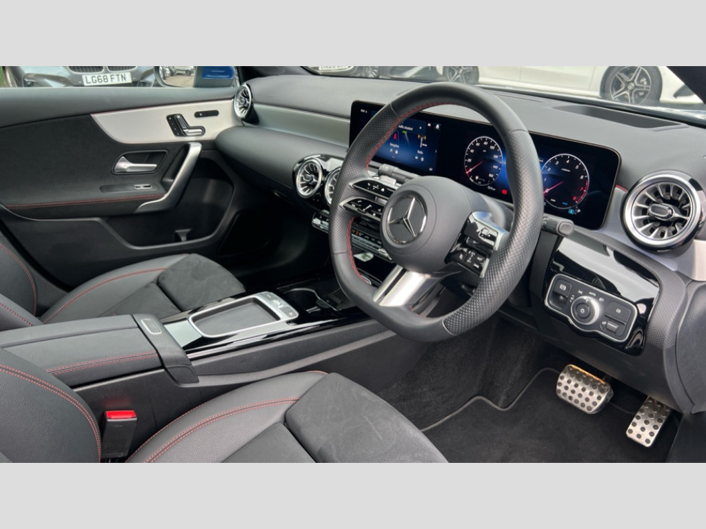 Mercedes-Benz A Class A180 AMG Line Premium Plus 4dr Auto 10.25 inch touchscreen central media display, 10.25" Digital instrument cluster display screen, Attention assist, Brake pad wear indicator warning light, Car wash mode, Direct steering, Direction indicators with lane change function, Dual bluetooth interfaces, DYNAMIC SELECT with a choice of driving modes (ECO, Comfort, Sport and Individual), ECO start/stop function, Engine start/stop button, Fingerprint scanner, Fluid level warning indicator for fuel, oil, coolant and washer fluid, Fluorescent jacket for driver, Hard-disk navigation, Head up Display, Hey Mercedes Voice activation, Lamp failure indicator, Mercedes me connect including emergency call system, accident recovery, breakdown and maintenance management, Mercedes me remote services, Outside temperature gauge, Owners manual in English, Pre-installation of private car share, Preinstallation for Mercedes Benz link, Remote boot closing, Service indicator (ASSYST), Smartphone integration with Apple CarPlay and Android auto, Speed sensitive power steering, Traffic sign assist, Trip computer in multifunction display with current consumption indicator, Wireless charging, Lowered comfort suspension, DAB Digital radio, MBUX multimedia system, Mercedes Benz advanced sound system (225 W) with 10 speakers, 1 central speaker, speakers on doors, a tweeter on door,one sub woofer + boost amplifier, 4 Electric Front and Rear windows, Adaptive brake lights, AMG body styling - AMG front apron with front splitter and AMG rear apron and visible exhaust tailpipe trim elements, Body colour bumpers, Body colour door handles with chrome inserts, Body colour side skirt, Chrome beltline strips, Diamond radiator grille with pins in fine star pattern, Electric adjustable and heated door mirrors with integrated LED side indicators, Exhaust system with 2 visible tailpipe trim elements and rear apron, Headlamp assist automatic headlamp activation, Heat insulating dark tinted rear and rear side windows, Heated glass rear windscreen + timer control, LED daytime running lights, LED tail lamp, Multibeam LED headlamps with adaptive highbeam assist and cornering function, Panoramic sliding sunroof, Privacy glass, Radio aerial, Rain sensing windscreen wipers with two sensitivity settings, Rear boot, Rear fog lights, Rear side wing doors, Third brake light featuring LED technology, 3 seat bench in 2nd row, 3 Spoke flat bottom leather multi function steering wheel with perforated leather in grip area, 40:20:40 split folding rear seats, Air conditioning - Two zone thermotronic luxury automatic climate control with display, AMG floor mats, Automatic child seat recognition sensor, Black air vents with surround in silver chrome, Black roof lining, Brushed stainless steel sports pedals with rubber studs, Electrically adjustable front memory seats including lumbar support and backrest inclination, Front centre armrest with stowage, Front seat backs luggage nets, Front sports seats with adjustable head restraints, Galvanished gear shift paddles on steering wheel, Height/reach adjustable steering column, Illuminated Mercedes Benz lettering front door sills with changeable cover, Interior lighting - 64 colour Ambient lighting, Interior mirror with reading lamps in black and frameless, Rear armrest with 2 cupholders, Seat occupancy sensor for front passenger seat, Single front passenger seat, Stowage compartment in centre console with retractable cover, Sunvisors with illuminated vanity mirrors, Twin front cupholders, Keyless go comfort pack - A Class, Light and sight package - A Class, Mirror package - A Class, Night pack - A Class Sport, Parking pack with 360 degree camera - A Class, Seat comfort pack - A Class, USB pack plus - A Class, Winter pack - A Class, 3 rear 3 point seatbelts, ABS with Brake Assist, Active bonnet, Adaptive brake assist with hold function and hill start assist, Black seatbelts, Bonnet with power domes, Childproof locks manually operated for rear doors and electrically operated for rear power windows, Crash responsive emergency lighting, Driver and passenger head and side airbags, Drivers knee airbag, Dual stage driver/passenger airbags, Electronic parking brake, ESP curve dynamic assist, ESP with ASR, Exit warning, Front and rear seatbelt reminder, ISOFIX and top tether child seat fixing points in two outer rear seats, Tyre pressure monitoring system, Warning triangle and first aid kit, Window airbags, Alarm system/interior protection/immobiliser, Guard 360 degree vehicle protection, Remote central locking and crash sensor with emergency opening function, Light longitudinal grain aluminium trim, 19" AMG multi-spoke light alloy wheels,aerodynamically optimised, painted in black with high sheen rim flange, Summer tyres, Tirefit sealant kit